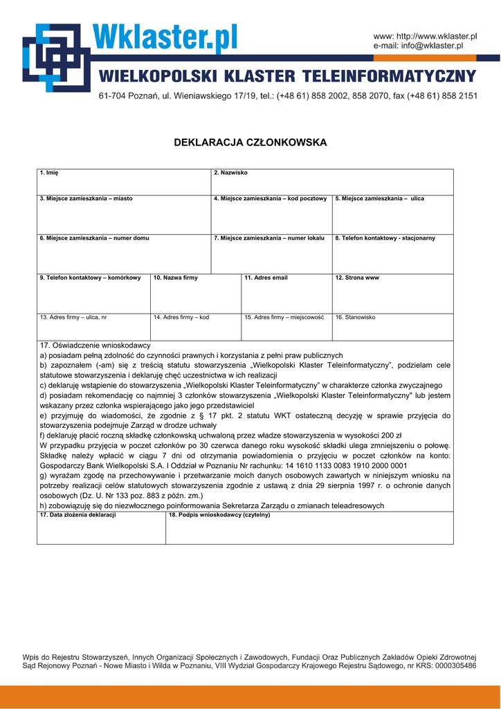 DEKLARACJA CZŁONKOWSKA 1. Imię 2. Nazwisko 3. Miejsce zamieszkania – miasto 4. Miejsce zamieszkania – kod pocztowy 5. Miejsce zamieszkania – ulica 6. Miejsce zamieszkania – numer domu 7. Miejsce zamieszkania – numer lokalu 8. Telefon kontaktowy - stacjonarny 9. Telefon kontaktowy – komórkowy 10. Nazwa firmy 11. Adres email 12. Strona www 13. Adres firmy – ulica, nr 14. Adres firmy – kod 15. Adres firmy – miejscowość 16. Stanowisko 17. Oświadczenie wnioskodawcy a) posiadam pełną zdolność do czynności prawnych i korzystania z pełni praw publicznych b) zapoznałem (-am) się z treścią statutu stowarzyszenia „Wielkopolski Klaster Teleinformatyczny”, podzielam cele statutowe stowarzyszenia i deklaruję chęć uczestnictwa w ich realizacji c) deklaruję wstąpienie do stowarzyszenia „Wielkopolski Klaster Teleinformatyczny” w charakterze członka zwyczajnego d) posiadam rekomendację co najmniej 3 członków stowarzyszenia „Wielkopolski Klaster Teleinformatyczny" lub jestem wskazany przez członka wspierającego jako jego przedstawiciel e) przyjmuję do wiadomości, że zgodnie z § 17 pkt. 2 statutu WKT ostateczną decyzję w sprawie przyjęcia do stowarzyszenia podejmuje Zarząd w drodze uchwały f) deklaruję płacić roczną składkę członkowską uchwaloną przez władze stowarzyszenia w wysokości 200 zł W przypadku przyjęcia w poczet członków po 30 czerwca danego roku wysokość składki ulega zmniejszeniu o połowę. Składkę należy wpłacić w ciągu 7 dni od otrzymania powiadomienia o przyjęciu w poczet członków na konto: Gospodarczy Bank Wielkopolski S.A. I Oddział w Poznaniu Nr rachunku: 14 1610 1133 0083 1910 2000 0001 g) wyrażam zgodę na przechowywanie i przetwarzanie moich danych osobowych zawartych w niniejszym wniosku na potrzeby realizacji celów statutowych stowarzyszenia zgodnie z ustawą z dnia 29 sierpnia 1997 r. o ochronie danych osobowych (Dz. U. Nr 133 poz. 883 z późn. zm.) h) zobowiązuję się do niezwłocznego poinformowania Sekretarza Zarządu o zmianach teleadresowych 17. Data złożenia deklaracji 18. Podpis wnioskodawcy (czytelny) REKOMENDACJA Dla Pana/Pani …………………………………………………………………...................... 19. Rekomendacja członków stowarzyszenia „Wielkopolski Klaster Teleinformatyczny” My niżej podpisani członkowie stowarzyszenia „Wielkopolski Klaster Teleinformatyczny” rekomendujemy przyjęcie wnioskodawcy do stowarzyszenia „Wielkopolski Klaster Teleinformatyczny”. 20. Rekomendujący 1 – imię i nazwisko 21. Rekomendujący 1 - czytelny podpis 22. Rekomendujący 2 – imię i nazwisko 23. Rekomendujący 2 - czytelny podpis 24. Rekomendujący 3 – imię i nazwisko 25. Rekomendujący 3 - czytelny podpis