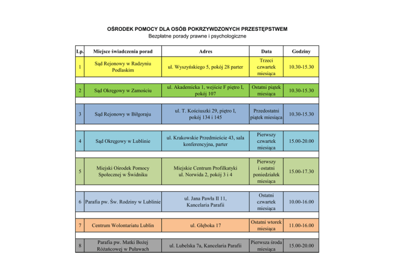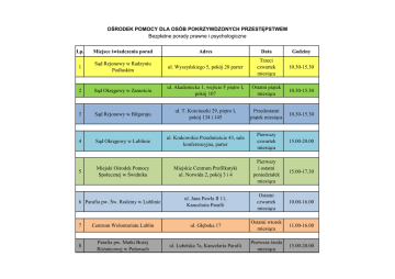 OŚRODEK POMOCY DLA OSÓB POKRZYWDZONYCH PRZESTĘPSTWEM Bezpłatne porady prawne i psychologiczne Lp. Miejsce świadczenia porad Adres Data Godziny 1 Sąd Rejonowy w Radzyniu Podlaskim ul. Wyszyńskiego 5, pokój 28 parter Trzeci czwartek miesiąca 10.30-15.30 2 Sąd Okręgowy w Zamościu ul. Akademicka 1, wejście F piętro I, pokój 107 Ostatni piątek miesiąca 10.30-15.30 3 Sąd Rejonowy w Biłgoraju ul. T. Kościuszki 29, piętro I, pokój 134 i 145 Przedostatni piątek miesiąca 10.30-15.30 4 Sąd Okręgowy w Lublinie ul. Krakowskie Przedmieście 43, sala konferencyjna, parter Pierwszy czwartek miesiąca 15.00-20.00 5 Miejski Ośrodek Pomocy Społecznej w Świdniku Miejskie Centrum Profilkatyki ul. Norwida 2, pokój 3 i 4 Pierwszy i ostatni poniedziałek miesiąca 15.00-17.30 ul. Jana Pawła II 11, Kancelaria Parafii Ostatni czwartek miesiąca 10.00-16.00 6 Parafia pw. Św. Rodziny w Lublinie 7 Centrum Wolontariatu Lublin ul. Głęboka 17 Ostatni wtorek miesiąca 11.00-16.00 8 Parafia pw. Matki Bożej Różańcowej w Puławach ul. Lubelska 7a, Kancelaria Parafii Pierwsza środa miesiąca 15.00-20.00