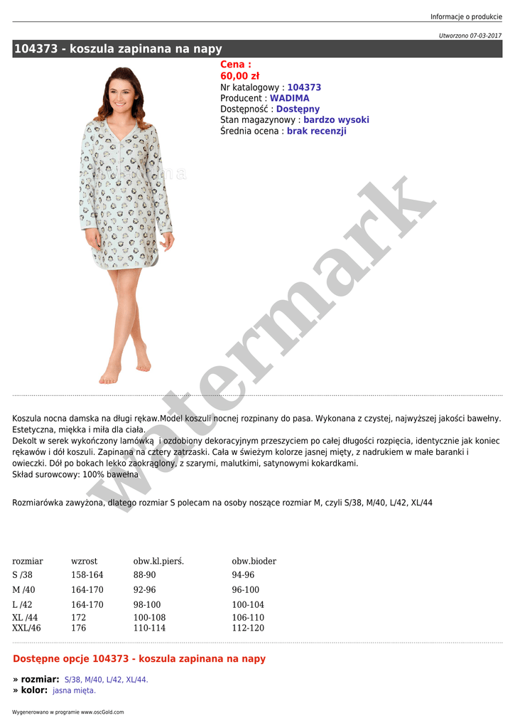 Informacje o produkcie Utworzono 07-03-2017 104373 - koszula zapinana na napy Cena : 60,00 zł er m ar k Nr katalogowy : 104373 Producent : WADIMA Dostępność : Dostępny Stan magazynowy : bardzo wysoki Średnia ocena : brak recenzji w at Koszula nocna damska na długi rękaw.Model koszuli nocnej rozpinany do pasa. Wykonana z czystej, najwyższej jakości bawełny. Estetyczna, miękka i miła dla ciała. Dekolt w serek wykończony lamówką i ozdobiony dekoracyjnym przeszyciem po całej długości rozpięcia, identycznie jak koniec rękawów i dół koszuli. Zapinana na cztery zatrzaski. Cała w świeżym kolorze jasnej mięty, z nadrukiem w małe baranki i owieczki. Dół po bokach lekko zaokrąglony, z szarymi, malutkimi, satynowymi kokardkami. Skład surowcowy: 100% bawełna Rozmiarówka zawyżona, dlatego rozmiar S polecam na osoby noszące rozmiar M, czyli S/38, M/40, L/42, XL/44 rozmiar wzrost obw.kl.pierś. obw.bioder S /38 158-164 88-90 94-96 M /40 164-170 92-96 96-100 L /42 XL /44 XXL/46 164-170 172 176 98-100 100-108 110-114 100-104 106-110 112-120 Dostępne opcje 104373 - koszula zapinana na napy » rozmiar: S/38, M/40, L/42, XL/44. » kolor: jasna mięta. Wygenerowano w programie www.oscGold.com