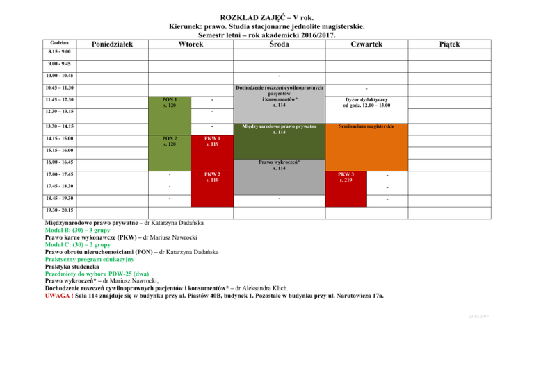Godzina Poniedziałek ROZKŁAD ZAJĘĆ – V rok. Kierunek: prawo. Studia stacjonarne jednolite magisterskie. Semestr letni – rok akademicki 2016/2017. Wtorek Środa Czwartek Piątek 8.15 - 9.00 9.00 - 9.45 10.00 - 10.45 - 10.45 – 11.30 Dochodzenie roszczeń cywilnoprawnych pacjentów i konsumentów* s. 114 11.45 – 12.30 PON 1 s. 120 - 12.30 – 13.15 - 13.30 – 14.15 - 14.15 - 15.00 PON 2 s. 120 Międzynarodowe prawo prywatne s. 114 Dyżur dydaktyczny od godz. 12.00 – 13.00 Seminarium magisterskie PKW 1 s. 119 15.15 - 16.00 Prawo wykroczeń* s. 114 16.00 - 16.45 17.00 - 17.45 - 17.45 - 18.30 - 18.45 - 19.30 - PKW 2 s. 119 PKW 3 s. 219 - - - 19.30 - 20.15 Międzynarodowe prawo prywatne – dr Katarzyna Dadańska Moduł B: (30) – 3 grupy Prawo karne wykonawcze (PKW) – dr Mariusz Nawrocki Moduł C: (30) – 2 grupy Prawo obrotu nieruchomościami (PON) – dr Katarzyna Dadańska Praktyczny program edukacyjny Praktyka studencka Przedmioty do wyboru PDW-25 (dwa) Prawo wykroczeń* – dr Mariusz Nawrocki, Dochodzenie roszczeń cywilnoprawnych pacjentów i konsumentów* – dr Aleksandra Klich. UWAGA ! Sala 114 znajduje się w budynku przy al. Piastów 40B, budynek 1. Pozostałe w budynku przy ul. Narutowicza 17a. 21.02.2017