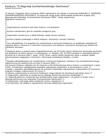 Konkurs "O Nagrodę Łomiankowskiego Dachowca" Nadesłał Administrator W ramach ?Tygodnia Jazzu Łomianki 2004? zapraszamy do udziału w konkursie KONKURS O NAGRODĘ ŁOMIANKOWSKIEGO DACHOWCA. W konkursie mogą wziąć udział kapele amaotrskie grające jazz. Nagrodą jest statuetka "Łomiankowski Dachowiec 2004" i sesja nagraniowa. Regulamin konkursu 1.Organizatorem konkursu jest Dom Kultury w Łomiankach. 2.Konkurs adresowany jest do zespołów grających jazz. 3.Organizator powoła jury w skład którego wejdą muzycy jazzowi. 4.Konkurs będzie przebiegał w dwóch etapach: eliminacje i koncert finałowy. 5.Jury zakwalifikuje 3-5 zespołów do uczestnictwa w koncercie finałowym na podstawie nadesłanych nagrania demo z minimum 3 utworami muzycznymi we własnym wykonaniu (kompozycje własne lub standardy jazzowe). 6.Nagrania demo w postaci kaset magnetofonowych lub CD Audio należy dostarczyć (przesyłką pocztową lub osobiście) do Domu Kultury w Łomiankach, ul. Wiejska 12a, 05-092 Łomianki w nieprzekraczalnym terminie do 4 czerwca 2004 r. godz. 15.00. Wraz z demo należy dostarczyć dane o zespole (skład, dotychczasowe osiągnięcia i koncerty) i informacje kontaktowe (telefon, e-mail). 7.Zespoły zakwalifikowane do uczestnictwa w koncercie finałowym zostaną o tym powiadomione drogą elektroniczną lub telefonicznie do dnia 9 czerwca 2004 r. 8.§ Koncert finałowy odbędzie się 20 czerwca w Sali Widowiskowej Domu Kultury w Łomiankach o godz. 19.00. O kolejności występowania zespołów zadecyduje organizator w porozumieniu z jury. 9.Każdy z zespołów zakwalifikowanych do koncertu finałowego zaprezentuje maksymalnie 30 minutowy program trwający maksymalnie 30 minut. 10.Utwory wykonywane w koncercie finałowym mogą należeć do dowolnych gatunków jazzu. 11.Organizator zapewnia ze swojej strony obsługę techniczną koncertu finałowego. 12. Nagrodą główną w konkursie jest profesjonalna sesja nagraniowa ? 10 godzin w studiu wraz z obsługą techniczną oraz statuetka ?Łomiankowski Dachowiec?. 13.Organizator zastrzega sobie możliwość zmiany regulaminu. 14.W sprawach nie objętych regulaminem decyzje podejmuje organizator. http://stare.lomianki.art.pl - Serwis archiwalny Domu Kultury w Łomiankach Powered by Mambo Generated: 7 March, 2017, 06:44