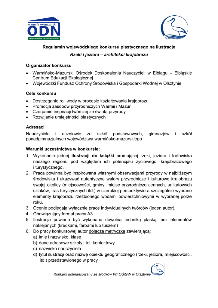 Regulamin wojewódzkiego konkursu plastycznego na ilustrację Rzeki i jeziora – architekci krajobrazu Organizator konkursu Warmińsko-Mazurski Ośrodek Doskonalenia Nauczycieli w Elblągu – Elbląskie Centrum Edukacji Ekologicznej Wojewódzki Fundusz Ochrony Środowiska i Gospodarki Wodnej w Olsztynie Cele konkursu Dostrzeganie roli wody w procesie kształtowania krajobrazu Promocja zasobów przyrodniczych Warmii i Mazur Czerpanie inspiracji twórczej ze świata przyrody Rozwijanie umiejętności plastycznych Adresaci Nauczyciele i uczniowie ze szkół podstawowych, ponadgimnazjalnych województwa warmińsko-mazurskiego gimnazjów i szkół Warunki uczestnictwa w konkursie: 1. Wykonanie jednej ilustracji do książki promującej rzeki, jeziora i torfowiska naszego regionu pod względem ich potencjału życiowego, krajobrazowego i turystycznego. 2. Praca powinna być inspirowana własnymi obserwacjami przyrody w najbliższym środowisku i ukazywać autentyczne walory przyrodnicze i kulturowe krajobrazu swojej okolicy (miejscowości, gminy, miejsc przyrodniczo cennych, unikatowych szlaków, tras turystycznych itd.) w szerokiej perspektywie a szczególnie wybrane elementy krajobrazu rzeźbionego wodami powierzchniowymi w wybranej porze roku. 3. Ocenie podlegają wyłącznie prace indywidualnych twórców (jeden autor). 4. Obowiązujący format pracy A3. 5. Ilustracja powinna być wykonana dowolną techniką płaską, bez elementów naklejanych (kredkami, farbami lub tuszem) 6. Do pracy konkursowej autor dołącza metryczkę zawierającą: a) imię i nazwisko, klasę b) dane adresowe szkoły i tel. kontaktowy c) nazwisko nauczyciela d) tytuł ilustracji oraz nazwę obiektu geograficznego (rzeki, jeziora, miejscowości, itd.) przedstawionego w pracy Konkurs dofinansowany ze środków WFOŚiGW w Olsztynie Termin składania prac Prace należy dostarczyć w opakowaniu zapewniającym bezpieczeństwo przesyłki do 23 marca 2016 r. na adres: Warmińsko-Mazurski Ośrodek Doskonalenia Nauczycieli w Elblągu – Elbląskie Centrum Edukacji Ekologicznej ul. Wojska Polskiego 1 82-300 Elbląg, Z dopiskiem: Wody znane i nieznane - Konkurs ilustracji Ocena prac Oceny prac dokona komisja wyłoniona przez organizatorów oddzielnie dla każdego etapu edukacyjnego i dla nauczycieli. Komisja konkursowa oceniać będzie prace pod względem formalnym (regulamin), artystycznym, merytorycznym i estetycznym. Decyzja komisji jest ostateczna i nie przysługuje od niej odwołanie. Wyniki konkursu zostaną ogłoszone podczas Forum Młodych Ekologów pod nazwą: „Wody znane i nieznane”, które odbędzie się w kwietniu w Elblągu oraz opublikowane na stronie internetowej www.wmodn.elblag.pl Wyróżnieni nauczyciele i uczniowie zostaną zaproszeni na Forum oraz otrzymają dyplomy i nagrody rzeczowe ufundowane przez WFOŚiGW w Olsztynie. Inne postanowienia Osoby nadsyłające prace konkursowe wyrażają zgodę na przetwarzanie przez organizatora konkursu swoich danych osobowych (Ustawa o ochronie danych osobowych z dnia 29 sierpnia 1997 roku, Dz. U. Nr 133, poz. 833, z późn. zm.) Organizatorzy zastrzegają sobie prawo pozostawienia prac konkursowych we własnych zbiorach oraz prawo do publikowania i reprodukowania prac. Zachęcamy do prowadzenia obserwacji przyrodniczych i czerpania z natury inspiracji do własnej twórczości artystycznej. Organizatorzy: Wiesława Kamińska, kierownik ECEE Janina Meller, konsultant ds. biologii Konkurs dofinansowany ze środków WFOŚiGW w Olsztynie