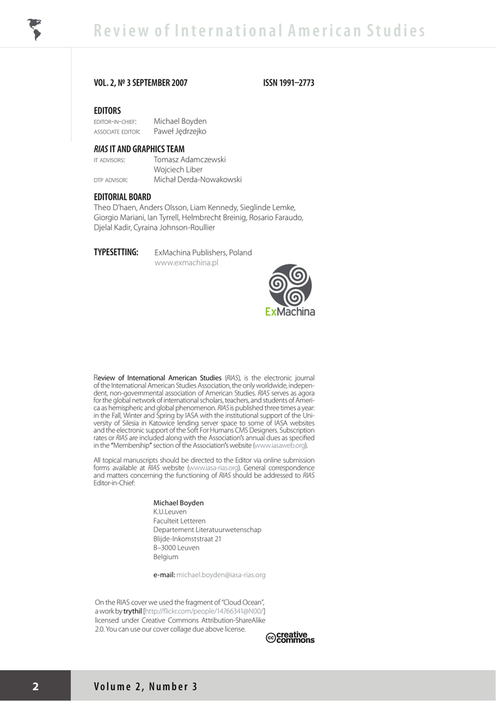 Review of International American Studies VOL. 2, № 3 SEPTEMBER 2007 ISSN 19912773 EDITORS EDITOR-IN-CHIEF: ASSOCIATE EDITOR: Michael Boyden Paweł Jędrzejko RIAS IT AND GRAPHICS TEAM IT ADVISORS: DTP ADVISOR: Tomasz Adamczewski Wojciech Liber Michał Derda-Nowakowski EDITORIAL BOARD Theo D’haen, Anders Olsson, Liam Kennedy, Sieglinde Lemke, Giorgio Mariani, Ian Tyrrell, Helmbrecht Breinig, Rosario Faraudo, Djelal Kadir, Cyraina Johnson-Roullier TYPESETTING: ExMachina Publishers, Poland www.exmachina.pl ExMachina Review of International American Studies (RIAS), is the electronic journal of the International American Studies Association, the only worldwide, independent, non-governmental association of American Studies. RIAS serves as agora for the global network of international scholars, teachers, and students of America as hemispheric and global phenomenon. RIAS is published three times a year: in the Fall, Winter and Spring by IASA with the institutional support of the University of Silesia in Katowice lending server space to some of IASA websites and the electronic support of the Soft For Humans CMS Designers. Subscription rates or RIAS are included along with the Association’s annual dues as specified in the “Membership” section of the Association’s website (www.iasaweb.org). All topical manuscripts should be directed to the Editor via online submission forms available at RIAS website (www.iasa-rias.org). General correspondence and matters concerning the functioning of RIAS should be addressed to RIAS Editor-in-Chief: Michael Boyden K.U.Leuven Faculteit Letteren Departement Literatuurwetenschap Blijde-Inkomststraat 21 B–3000 Leuven Belgium e-mail: [email protected] On the RIAS cover we used the fragment of “Cloud Ocean”, a work by trythil [http://flickr.com/people/14766341@N00/] licensed under Creative Commons Attribution-ShareAlike 2.0. You can use our cover collage due above license. 2 Vo l u m e 2 , N u m b e r 3 Conference Repor ts: Paweł Jędrzejko HEARTS OF DARKNESS? Paweł Jędrzejko University of Silesia, Katowice, Poland Hearts of Darkness: Melville and Conrad in the Space of World Culture 47 August 2007 Szczecin, Poland The Melville Society’s Sixth International Conference. Co-hosted by The Melville Society, The Joseph Conrad Society (UK, US), The Tall Ships’ Race Szczecin 2007. Institutional Organizers: The Institute of British and American Culture and Literature of the University of Silesia in Katowice—Poland, Centre College—Danville, Kentucky, USA, The City of Szczecin—Organizers’ Office of the Tall Ships’ Races Szczecin 2007. Both Herman Melville and Joseph Conrad Korzeniowski assumed that the existential human condition necessitates a ‘universal squeeze of the hand.’ Beautifully conceptualized by Melville, it is this idea of friendship as the sine-qua-non of existence that provided the obvious connection between the Organizers of the Conference and the Organizing Office of the Tall Ships’ Races Szczecin 2007. All sailors know that at sea, all men and women are part of a commonwealth. At sea, friendship beyond prejudice is a sine qua non of survival: the liquid reality of the human condition, tangible to those sailing the oceans, unconditionally affects everyone. In June of 2005 the Organizers of both events met in Szczecin and decided to cooperate. The Conference, concentrating on the oeuvre of the two greatest marinists in literary history, provided an intellectual backdrop for the joyful meeting of international sailors and fans of maritime culture. The result: a gam of rare scale and a memorable cultural event. The complementary character of the theory and practice of friendship proved unquestionable: with its 80 papers and presentations, the Conference, attended by almost 150 persons representing nearly 20 countries made a serious contribution to the understanding multilayered, complex, and deeply humane message of Melville’s and Conrad’s. Organizing the Conference in the year 2007—the Conrad Year—the Co-Chairs of the Conference, Paweł Jędrzejko and Milton M. Reigelman, strove to create an opportunity for Melville and Conrad scholarship to go beyond the boundaries of national literature and to enter a serious humanist debate on the cultural heritage TOC September 2007 CONFERENCE REPORTS THE IDEA OF THE CONFERENCE 37 Review of International American Studies of both excellent writers, whose contribution to the world culture has rarely been considered jointly. Such a unique meeting of international literary scholars focusing on common themes will help to promote individual and institutional cooperation among Conradian and Melvillean scholars world-wide. The publication of two books inspired by the debate in the academic year 2008/2009—a tangible results of such a gam—will certainly be one of many of its desired outcomes. The exchange of e-mail addresses and telephone numbers, which inevitably ensued, will result in individual growth and, at a more general level, in the international promotion of Conradian and Melvillean Studies. It is hoped that the organization of the event in Poland will prove to have exerted an energizing effect upon Polish, German, and Scandinavian Melville and Conrad scholarship, but also decenter the traditionally ‘national’ discourses. To non-Americans, Melville often seems to be monopolized by American scholarship; Conrad, traditionally, is claimed by the British and the Poles. Conference Participants and those following the conference in the Polish media certainly had an unrepeatable opportunity of gaining a greater understanding of connectedness of Melville and Conrad and of the interconnectivity of all peoples. The conference program and detailed information concerning the event are available at the conference website: www.melville.us.edu.pl. IN T E R NAT I O NAL A ME R I C AN S T UD IE S: LO C I AND F O C I PATRONS 38 The President of the Republic of Poland, Mr. Lech Kaczyński The A