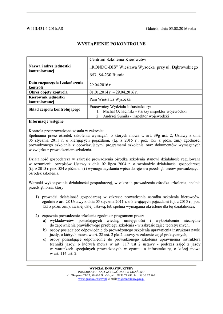 Gdańsk, dnia 05.08.2016 roku WI-III.431.4.2016.AS WYSTĄPIENIE POKONTROLNE Centrum Szkolenia Kierowców Nazwa i adres jednostki kontrolowanej „RONDO-BIS” Wiesława Wysocka przy ul. Dąbrowskiego 6/D, 84-230 Rumia. Data rozpoczęcia i zakończenia kontroli Okres objęty kontrolą Kierownik jednostki kontrolowanej Skład zespołu kontrolującego 29.04.2016 r. 01.01.2014 r. – 29.04.2016 r. Pani Wiesława Wysocka Pracownicy Wydziału Infrastruktury: 1. Michał Ochaciński - starszy inspektor wojewódzki 2. Andrzej Sumiła - inspektor wojewódzki Informacje wstępne Kontrola przeprowadzona została w zakresie: Spełniania przez ośrodek szkolenia wymagań, o których mowa w art. 39g ust. 2, Ustawy z dnia 05 stycznia 2011 r. o kierujących pojazdami, (t.j. z 2015 r., poz. 155 z późn. zm.) zgodności prowadzonego szkolenia z obowiązującymi programami szkolenia oraz dokumentów wymaganych w związku z prowadzeniem szkolenia. Działalność gospodarcza w zakresie prowadzenia ośrodka szkolenia stanowi działalność regulowaną w rozumieniu przepisów Ustawy z dnia 02 lipca 2004 r. o swobodzie działalności gospodarczej (t.j. z 2015 r. poz. 584 z późn. zm.) i wymaga uzyskania wpisu do rejestru przedsiębiorców prowadzących ośrodek szkolenia. Warunki wykonywania działalności gospodarczej, w zakresie prowadzenia ośrodka szkolenia, spełnia przedsiębiorca, który: 1) prowadzi działalność gospodarczą w zakresie prowadzenia ośrodka szkolenia kierowców, zgodnie z art. 28 Ustawy z dnia 05 stycznia 2011 r. o kierujących pojazdami (t.j. z 2015 r., poz. 155 z późn. zm.), zwanej dalej ustawą, lub spełnia wymagania określone dla tej działalności; 2) zapewnia prowadzenie szkolenia zgodnie z programem przez: a) wykładowców posiadających wiedzę, umiejętności i wykształcenie niezbędne do zapewnienia prawidłowego przebiegu szkolenia - w zakresie zajęć teoretycznych, b) osoby posiadające odpowiednie do prowadzonego szkolenia uprawnienia instruktora nauki jazdy, o których mowa w art. 28 ust. 2 pkt 2 ustawy w zakresie zajęć praktycznych, c) osoby posiadające odpowiednie do prowadzonego szkolenia uprawnienia instruktora techniki jazdy, o których mowa w art. 117 ust 2 ustawy - podczas zajęć z jazdy w warunkach specjalnych prowadzonych w oparciu o infrastrukturę, o której mowa w art. 114 ust. 2. WYDZIAŁ INFRASTRUKTURY POMORSKI URZĄD WOJEWÓDZKI W GDAŃSKU ul. Okopowa 21/27, 80-810 Gdańsk, tel.: 58 30 77 482, fax: 58 30 77 965. www.gdansk.uw.gov.pl, e-mail: [email protected] 3) posiada: a) warunki lokalowe, b) wyposażenie dydaktyczne, c) miejsca przeznaczone do prowadzenia zajęć praktycznych, d) miejsca przeznaczone do jazdy w warunkach specjalnych, e) pojazdy samochodowe odpowiednie do zakresu prowadzonego szkolenia, f) szczegółowy program szkolenia wraz z planem jego wykonania oraz metodami nauczania; g) nie był, jako osoba fizyczna lub członek organu osoby prawnej, prawomocnie skazany za przestępstwo popełnione w celu osiągnięcia korzyści majątkowych lub przestępstwo przeciwko wiarygodności dokumentów. Organem prowadzącym rejestr przedsiębiorców prowadzących ośrodek szkolenia jest wojewoda właściwy ze względu na miejsce wykonywania działalności objętej wpisem. Biorąc powyższe pod uwagę, Wojewoda Pomorski dokonując wpisu podmiotu do rejestru przedsiębiorców prowadzących ośrodki szkolenia, zweryfikował niezbędną dokumentację (wraz z programem szkolenia) na podstawie, której dokonał wpisu do rejestru. Zgodnie z art. 39h ustawy, nadzór nad ośrodkami szkolenia sprawuje wojewoda. W ramach sprawowanego nadzoru wojewoda przeprowadza kontrolę w zakresie: a) spełniania przez ośrodek szkolenia wymagań, o których mowa w art. 39g ust. 2 ustawy, b) zgodności prowadzonego szkolenia z obowiązującymi programami szkolenia, c) dokumentów wymaganych w związku z prowadzeniem szkolenia. Szczegółowe warunki dotyczące prowadzenia szkoleń przez ośrodek szkolenia oraz sposobu prowadzenia dokumentacji dotyczącej przedmiotowych szkoleń zostały ujęte w Rozporządzeniu Ministra Infrastruktury z dnia 01 kwietnia 2010 r. w sprawie szkolenia kierowców wykonujących przewóz drogowy (t.j. z 2014 r. poz. 1005). Zgodnie z art. 39e ust. 2 Ustawy z dnia 06 września 2001 r. o transporcie drogowym (t.j. z 2013 poz. 1414 z późn. zm.), podmiot zobowiązany jest do przekazywania Wojewodzie Pomorskiemu określonych informacji (m.in. o rozpoczęciu szkolenia wraz z lista uczestników, o zakończeniu szkolenia oraz wydania zaświadczeń potwierdzających ukończenie szkolenia okresowego, o rozpoczęciu kwalifikacji wstępnej wraz z lista uczestników). Ocena kontrolowanej działalności Pozytywna Ustalenia W toku postępowania kontrolnego ustalono: 1.Pozytywnie ocenia się, spełnianie, przez ośrodek szkolenie wymagań określonych dla przedsiębiorcy prowadzącego ośrodek szkolenia kierowców, o których mowa w art. 28 ust. 2 Ustawy o kierujących pojazdami. - Podmiot posiada wyposażenie dydaktyczne ośrodka szkolenia, o których mowa w § 3 ust. 2 Rozporządzenia Ministra Infrastruktury z dnia 01 kwietnia 2010 r. w sprawie szkolenia kierowców wykonujących przewóz drogowy. WYDZIAŁ INFRASTRUKTURY POMORSKI URZĄD WOJEWÓDZKI W GDAŃSKU ul. Okopowa 21/27, 80-810 Gdańsk, tel.: 58 30 77 482, fax: 58 30 77 965. www.gdansk.uw.gov.pl, e-mail: [email protected] Strona 2 z 4 - Pojazdy wykorzystywane do szkolenia odpowiadają warunkom określonym w przepisach prawa. - Program szkolenia oraz kadra wykładowców, instruktorów i innych osób, które odpowiedzialne są za prowadzenie szkoleń jest tożsama ze złożonymi dokumentami, na podstawie, których Wojewoda Pomorski dokonał wpisu ośrodka szkolenia do rejestru przedsiębiorców prowadzących ośrodki szkolenia, uprawnienia osób prowadzących szkolenia są aktualne. 2. Pozytywnie ocenia się działalność ośrodka szkolenia w zakresie zgodności prowadzonego szkolenia z obowiązujący