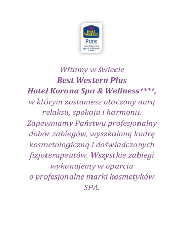 Witamy w świecie Best Western Plus Hotel Korona Spa & Wellness****, w którym zostaniesz otoczony aurą relaksu, spokoju i harmonii. Zapewniamy Państwu profesjonalny dobór zabiegów, wyszkoloną kadrę kosmetologiczną i doświadczonych fizjoterapeutów. Wszystkie zabiegi wykonujemy w oparciu o profesjonalne marki kosmetyków SPA. ZABIEGI NA CIAŁO Piękna harmonijna sylwetka, jędrna, gładka, nawilżona i odżywiona skóra to marzenie każdej osoby. Aby sprostać tym wymaganiom stworzyliśmy bogaty program zabiegów na ciało dostosowany do różnych potrzeb. RÓŻA ORIENTU NA AQUA WOOD 120 min/450zł (kompleksowy zabieg na twarz i ciało oddziałujący na psychikę i zmysły, głęboko relaksujący, wygładzający i nawilżający skórę, stymulujący mikrokrążenie, poprawiający elastyczność skóry, jak również spowalniający procesy starzenia) BODY DE LUX - wersja skrócona zabiegu* 70 min/300zł - wersja zabiegu z masażem modelującym 120 min/380zł (ekskluzywny zabieg ujędrniający, modelujący ciało, przywracający skórze elastyczność i sprężystość) ŻURAWINOWA UCZTA- wersja skrócona zabiegu* 60 min/240zł - wersja zabiegu z masażem ciała 115 min/320zł - wersja zabiegu z masażem ciała i kąpielą 140 min/350zł (zabieg intensywnie nawilżający i wygładzający przeznaczony dla skóry odwodnionej, szorstkiej, o nierównym kolorycie) EGZOTYCZNE CHWILE- wersja skrócona zabiegu* 60 min/240zł - wersja zabiegu z masażem ciała 115 min/320zł - wersja zabiegu z masażem ciała i kąpielą 140 min/350zł (zabieg przywracający skórze aksamitną gładkość w aurze zapachów soczystych owoców) CZEKOLADOWA EUFORIA- wersja skrócona zabiegu* - wersja zabiegu z kąpielą (zabieg intensywnie nawilżający i regenerujący dla skóry suchej) 90 min/250zł 115 min/350zł MIGDAŁOWA ODNOWA- wersja skrócona zabiegu* 60 min/250zł - wersja zabiegu z masażem ciała 115 min/330zł (zabieg intensywnie regenerujący dla skóry przesuszonej, szorstkiej, łuszczącej się) ORIENT EXPRESS - wersja skrócona zabiegu* 60 min/240zł - wersja zabiegu z masażem pleców kamieniami 90 min/320zł (zabieg typu wellness- wszechstronnie poprawiający jakość skóry i korygujący niedoskonałości) ZABIEG ALOESOWY - wersja skrócona zabiegu* 70 min/180zł - wersja zabiegu z masażem ciała 115 min/260zł (zabieg polecany szczególnie w okresie letnim. Chroni skórę przed skutkami intensywnego opalania, ma działanie anti-aging oraz łagodzi podrażnienia) KOKOSOWE SPA - wersja skrócona zabiegu* 60 min/180zł - wersja zabiegu z masażem ciała 115 min/260zł (wspaniały zabieg łagodząco – regenerujący. Pozostawia skórę głęboko nawilżoną, jedwabiście gładką i mocno zregenerowaną) KOMPLEKSOWY ZABIEG "FINEZJA CIAŁA" 100 min/250zł (specjalistyczny zabieg na ciało z zastosowaniem aktywnego biologicznie kolagenu, mającym silne działanie wyszczuplające, anti-cellulitowe oraz głęboko nawilżające) EKSPRESOWE „SOS” 50 min/220zł (zabieg przeznaczony dla skóry, która potrzebuje szybkiego efektu wygładzenia, odżywienia i nawilżenia) CYNAMONOWY BODY WRAPPING 60 min/160zł (zabieg intensywnie wyszczuplający, redukujący cellulit, zmniejszający rozstępy) *Wersje skrócone zabiegów na ciało odbywają się na łóżku ZERO1 lub AQUA WOOD ZERO 1 Ekskluzywne, podgrzewane łóżko do masażu z funkcją fal brzegu morskiego, koloroterapią. Wyobraź sobie sytuację, kiedy leżysz na plaży nad tropikalnym morzem, jednocześnie poddając się odprężającemu zabiegowi. Ciepła fala muskająca twoje ciało… to właśnie jest ZERO 1. AQUA WOOD fenomenalny stół do mokrych zabiegów o ergonomicznym kształcie do innowacyjnych zabiegów pielęgnacji ciała. Woda i para wodna połączone razem stwarzają niepowtarzalną atmosferę, przynosząc głęboki relaks i estetyczne doznania nie tylko dla ciała, ale i dla ducha. KĄPIELE Kąpiel w wannie z hydromasażem i odpowiednio dobranym kosmetykiem, nawilży oraz odżywi naskórek. Poza tym wpływa odprężająco na organizm, a także polepsza nastrój. To chwila relaksu dla ciała i zmysłów. Zabieg wodny doskonale przygotowuje skórę do masażu i innych kuracji pielęgnacyjnych ciała. KĄPIEL W SOLACH MORSKICH 25 min/99zł (kąpiel w 100% naturalnych solach morskich i algach przywraca skórze sprężystość, oczyszcza i nawilża ciało, a także doskonale modeluje sylwetkę) KĄPIEL KLEOPATRY 25 min/99zł (kąpiel w mleku z dodatkiem olejków zapachowych sprawi, że skóra stanie się jedwabiście gładka, delikatna i miękka w dotyku oraz otulona delikatnym aromatem) KĄPIEL W PIWIE 25 min/99zł (kąpiel w piwie przede wszystkich poprawia kondycję skóry, która staję się oczyszczona, odżywiona i nawilżona) ŁAŹNIA ALGOWO BŁOTNA* 20 min/70zł (seans kąpieli w łaźni parowej z aplikacją kompozycji o działaniu peelingującym, remineralizującym i detoksykującym. Po seansie skóra jest optymalnie przygotowana do dalszych zabiegów i posiada szczególną zdolność wchłaniania substancji pielęgnujących) Zabiegi ustalane są przez recepcję SPA – w celu zapewnienia najwyższej jakości usług prosimy o wcześniejszą rezerwację w hotelowym Centrum SPA & Wellness. e-mail: [email protected] tel. 81 503 20 02 wew.150 tel. kom. 507 146 884