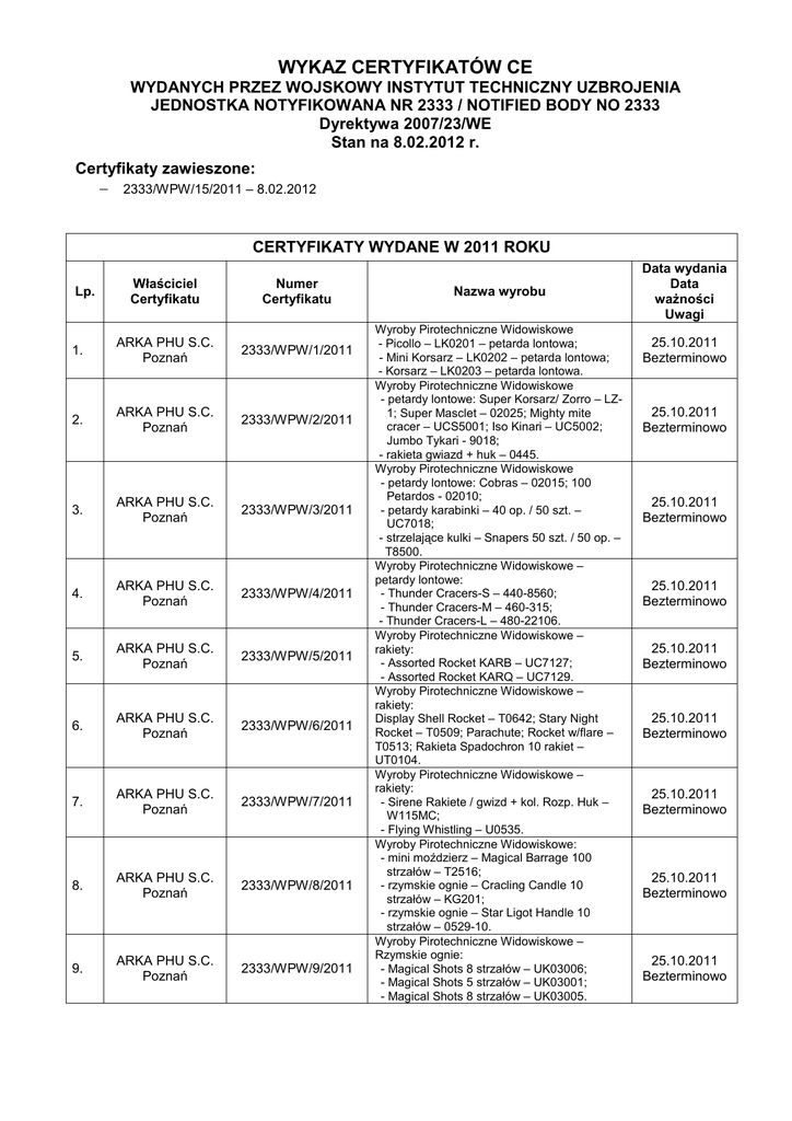 WYKAZ CERTYFIKATÓW CE WYDANYCH PRZEZ WOJSKOWY INSTYTUT TECHNICZNY UZBROJENIA JEDNOSTKA NOTYFIKOWANA NR 2333 / NOTIFIED BODY NO 2333 Dyrektywa 2007/23/WE Stan na 8.02.2012 r. Certyfikaty zawieszone: − 2333/WPW/15/2011 – 8.02.2012 CERTYFIKATY WYDANE W 2011 ROKU Lp. Właściciel Certyfikatu Numer Certyfikatu 1. ARKA PHU S.C. Poznań 2333/WPW/1/2011 2. ARKA PHU S.C. Poznań 2333/WPW/2/2011 3. ARKA PHU S.C. Poznań 2333/WPW/3/2011 4. ARKA PHU S.C. Poznań 2333/WPW/4/2011 5. ARKA PHU S.C. Poznań 2333/WPW/5/2011 6. ARKA PHU S.C. Poznań 2333/WPW/6/2011 7. ARKA PHU S.C. Poznań 2333/WPW/7/2011 8. ARKA PHU S.C. Poznań 2333/WPW/8/2011 9. ARKA PHU S.C. Poznań 2333/WPW/9/2011 Nazwa wyrobu Wyroby Pirotechniczne Widowiskowe - Picollo – LK0201 – petarda lontowa; - Mini Korsarz – LK0202 – petarda lontowa; - Korsarz – LK0203 – petarda lontowa. Wyroby Pirotechniczne Widowiskowe - petardy lontowe: Super Korsarz/ Zorro – LZ1; Super Masclet – 02025; Mighty mite cracer – UCS5001; Iso Kinari – UC5002; Jumbo Tykari - 9018; - rakieta gwiazd + huk – 0445. Wyroby Pirotechniczne Widowiskowe - petardy lontowe: Cobras – 02015; 100 Petardos - 02010; - petardy karabinki – 40 op. / 50 szt. – UC7018; - strzelające kulki – Snapers 50 szt. / 50 op. – T8500. Wyroby Pirotechniczne Widowiskowe – petardy lontowe: - Thunder Cracers-S – 440-8560; - Thunder Cracers-M – 460-315; - Thunder Cracers-L – 480-22106. Wyroby Pirotechniczne Widowiskowe – rakiety: - Assorted Rocket KARB – UC7127; - Assorted Rocket KARQ – UC7129. Wyroby Pirotechniczne Widowiskowe – rakiety: Display Shell Rocket – T0642; Stary Night Rocket – T0509; Parachute; Rocket w/flare – T0513; Rakieta Spadochron 10 rakiet – UT0104. Wyroby Pirotechniczne Widowiskowe – rakiety: - Sirene Rakiete / gwizd + kol. Rozp. Huk – W115MC; - Flying Whistling – U0535. Wyroby Pirotechniczne Widowiskowe: - mini moździerz – Magical Barrage 100 strzałów – T2516; - rzymskie ognie – Cracling Candle 10 strzałów – KG201; - rzymskie ognie – Star Ligot Handle 10 strzałów – 0529-10. Wyroby Pirotechniczne Widowiskowe – Rzymskie ognie: - Magical Shots 8 strzałów – UK03006; - Magical Shots 5 strzałów – UK03001; - Magical Shots 8 strzałów – UK03005. Data wydania Data ważności Uwagi 25.10.2011 Bezterminowo 25.10.2011 Bezterminowo 25.10.2011 Bezterminowo 25.10.2011 Bezterminowo 25.10.2011 Bezterminowo 25.10.2011 Bezterminowo 25.10.2011 Bezterminowo 25.10.2011 Bezterminowo 25.10.2011 Bezterminowo WYKAZ CERTYFIKATÓW CE WYDANYCH PRZEZ WOJSKOWY INSTYTUT TECHNICZNY UZBROJENIA JEDNOSTKA NOTYFIKOWANA NR 2333 / NOTIFIED BODY NO 2333 Dyrektywa 2007/23/WE Stan na 8.02.2012 r. 10. ARKA PHU S.C. Poznań 2333/WPW/10/2011 11. ARKA PHU S.C. Poznań 2333/WPW/11/2011 12. ARKA PHU S.C. Poznań 2333/WPW/12/2011 13. ARKA PHU S.C. Poznań 2333/WPW/13/2011 14. ARKA PHU S.C. Poznań 2333/WPW/14/2011 15. ARKA PHU S.C. Poznań 2333/WPW/15/2011 16. ARKA PHU S.C. Poznań 2333/WPW/16/2011 17. ARKA PHU S.C. Poznań 2333/WPW/17/2011 18. ARKA PHU S.C. Poznań 2333/WPW/18/2011 19. ARKA PHU S.C. Poznań 2333/WPW/19/2011 Wyroby Pirotechniczne Widowiskowe – Rzymskie ognie: - Magical Shots 10 strzałów – T6236; - Magical Shots 20 strzałów – T6238. Wyroby Pirotechniczne Widowiskowe – Rzymskie ognie: - Magical Shots 60 strzałów – T6244; - Magical Shots 80 strzałów – T6246; - Magical Shots 100 strzałów – T6248. Wyroby Pirotechniczne Widowiskowe – Rzymskie ognie: - Dragon 20 strzałów 4 szt. opak. – 0345-20. Wyroby Pirotechniczne Widowiskowe: - Możdzierz 12 bomb – 0008; - Możdzierz 6 bomb – 0008A. Wyroby Pirotechniczne Widowiskowe – miny: - Mine (mała) 4 różne efekty, razem – GKL001; - Mine (średnia) 4 różne efekty, razem – GKL002. Wyroby Pirotechniczne Widowiskowe Wyrzutnie: Purple Green Peony – 7 strzałów – UA2-212; Biała Błyskawica – 7 strzałów – UA2-907A; Czerwona Chryzantemowa – 7 strzałów – UA2-907B; Podwójny Kokon – 7 strzałów – UA2-907C; Color Willow and Chrysantemum 7 strzałów – UA2-213. Wyroby Pirotechniczne Widowiskowe Wyrzutnie: Niebieska Dalia 13 strzałów – GM9013A; Gwiezdny Wir 13 strzałów – GM9013B; Złota Strzelająca Wierzba 13 strzałów – GM9013C; Galaxy 13 strzałów – GM9013D; Czerwona Eksplozja 16 strzałów – GM 9016A; Wybuchowa Biała Kula 16 strzałów – GM9016B; Zielony Olbrzym 16 strzałów – GM9016C; Gwiezdna Lawina 16 strzałów – GM9016D. Wyroby Pirotechniczne Widowiskowe Wyrzutnie: - Red & Green Crown w/pistil – 13 strzałów – GC106-13; - Red Strobe & Silver Coco – 13 strzałów – GC107-13. Wyroby Pirotechniczne Widowiskowe – Wyrzutnie: - Srebrna chryzantema – 16 strzałów – U31420; - Golden Waterfal – 16 strzałów – UK7181C. Wyroby Pirotechniczne Widowiskowe – Wyrzutnie: Heros 19 strzałow – GM9019A; Fatalna Furia 19 strzałów – GM9019B; Królowa Ognia 19 strzałów – GM9019C; Fairy 19 strzałów – GM2801; Ghost Crying 19 strzałów – GM2802; Thnder At Night 19 strzałów – GM2803. 25.10.2011 Bezterminowo 25.10.2011 Bezterminowo 25.10.2011 Bezterminowo 25.10.2011 Bezterminowo 25.10.2011 Bezterminowo 25.10.2011 Bezterminowo Zawieszono 8.02.2012 Cofnięto 6.11.2012 25.10.2011 Bezterminowo 25.10.2011 Bezterminowo 25.10.2011 Bezterminowo 25.10.2011 Bezterminowo WYKAZ CERTYFIKATÓW CE WYDANYCH PRZEZ WOJSKOWY INSTYTUT TECHNICZNY UZBROJENIA JEDNOSTKA NOTYFIKOWANA NR 2333 / NOTIFIED BODY NO 2333 Dyrektywa 2007/23/WE Stan na 8.02.2012 r. 20. ARKA PHU S.C. Poznań 2333/WPW/20/2011 21. ARKA PHU S.C. Poznań 2333/WPW/21/2011 22. ARKA PHU S.C. Poznań 2333/WPW/22/2011 23. ARKA PHU S.C. Poznań 2333/WPW/23/2011 24. ARKA PHU S.C. Poznań 2333/WPW/24/2011 25. ARKA PHU S.C. Poznań 2333/WPW/25/2011 26. ARKA PHU S.C. Poznań 2333/WPW/26/2011 27. ARKA PHU S.C. Poznań 2333/WPW/27/2011 28. ARKA PHU S.C. Poznań 2333/WPW/28/2011 29. 30. ARKA PHU S.C. Poznań ARKA PHU S.C. Poznań 2333/WPW/29/