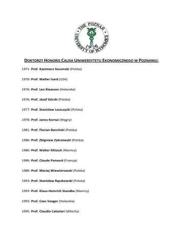DOKTORZY HONORIS CAUSA UNIWERSYTETU EKONOMICZNEGO W POZNANIU: 1971: Prof. Kazimierz Secomski (Polska) 1976: Prof. Walter Isard (USA) 1976: Prof. Leo Klaassen (Holandia) 1976: Prof. Józef Górski (Polska) 1977: Prof. Stanisław Leszczycki (Polska) 1978: Prof. Janos Kornai (Węgry) 1981: Prof. Florian Barciński (Polska) 1986: Prof. Zbigniew Zakrzewski (Polska) 1986: Prof. Walter Klitzsch (Niemcy) 1986: Prof. Claude Ponsard (Francja) 1986: Prof. Maciej Wiewiórowski (Polska) 1993: Prof. Stanisław Rączkowski (Polska) 1993: Prof. Klaus-Heinrich Standke (Niemcy) 1993: Prof. Cees Veeger (Holandia) 1995: Prof. Claudio Calzolari (Włochy) 1996: Prof. Dr. Rolf Funck (Niemcy) 1996: Lady Margaret Thatcher (Wielka Brytania) 1998: Prof. Ryszard Domański (Polska) 2001: Dr Klaus Hänsch (Niemcy) 2006: Prof. Leszek Balcerowicz (Polska) 2009: Prof. Danuta Hübner (Polska) 2010: Prof. Stanisław Gomułka (Polska) 2011: Drs. H.c.Hans-Dietrich Genscher (Niemcy)