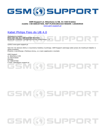 GSM-Support ul. Bitschana 2/38, 31-420 Kraków mobile +48 608107455, NIP PL9451852164 REGON: 120203925 www.gsm-support.pl Kabel Philips Fisio do UB 4.0 Obsługiwane modele: Fisio 120 121 311 620 625 820 822 825 Działa bez problemu z oprogramowaniem Delok Philips 1.9 ©2012 www.gsm-support.pl Opis ten nie stanowi oferty w rozumieniu Kodeksu Cywilnego. GSM-Support zastrzega sobie prawo do możliwych błędów w opisie produktu. Prosimy o weryfikację z Państwa strony, a w razie wątpliwości o kontakt. GSM-Support ul. Bitschana 2/38 31-420 Kraków POLSKA tel. 608107455 e-mail: [email protected] Powered by TCPDF (www.tcpdf.org)