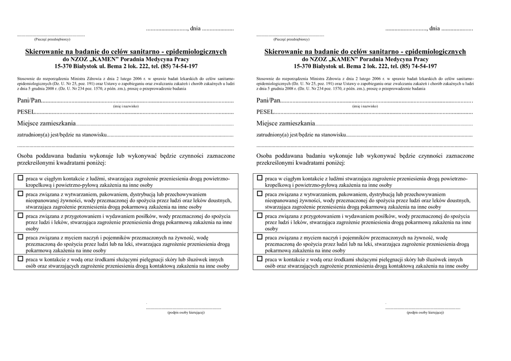 ..........................., dnia ..................... ........................................................ ..........................., dnia ..................... ........................................................ (Pieczęć przedsiębiorcy) (Pieczęć przedsiębiorcy) Skierowanie na badanie do celów sanitarno - epidemiologicznych Skierowanie na badanie do celów sanitarno - epidemiologicznych do NZOZ „KAMEN” Poradnia Medycyna Pracy 15-370 Białystok ul. Bema 2 lok. 222, tel. (85) 74-54-197 do NZOZ „KAMEN” Poradnia Medycyna Pracy 15-370 Białystok ul. Bema 2 lok. 222, tel. (85) 74-54-197 Stosownie do rozporządzenia Ministra Zdrowia z dnia 2 lutego 2006 r. w sprawie badań lekarskich do celów sanitarnoepidemiologicznych (Dz. U. Nr 25, poz. 191) oraz Ustawy o zapobieganiu oraz zwalczaniu zakażeń i chorób zakaźnych u ludzi z dnia 5 grudnia 2008 r. (Dz. U. Nr 234 poz. 1570, z późn. zm.), proszę o przeprowadzenie badania Stosownie do rozporządzenia Ministra Zdrowia z dnia 2 lutego 2006 r. w sprawie badań lekarskich do celów sanitarnoepidemiologicznych (Dz. U. Nr 25, poz. 191) oraz Ustawy o zapobieganiu oraz zwalczaniu zakażeń i chorób zakaźnych u ludzi z dnia 5 grudnia 2008 r. (Dz. U. Nr 234 poz. 1570, z późn. zm.), proszę o przeprowadzenie badania Pani/Pan............................................................................................................................... Pani/Pan............................................................................................................................... (imię i nazwisko) (imię i nazwisko) PESEL................................................................................................................................... PESEL................................................................................................................................... Miejsce zamieszkania.................................................................................................................................. Miejsce zamieszkania.................................................................................................................................. zatrudniony(a) jest/będzie na stanowisku............................................................................................. zatrudniony(a) jest/będzie na stanowisku............................................................................................. ............................................................................................................................................................... ............................................................................................................................................................... Osoba poddawana badaniu wykonuje lub wykonywać będzie czynności zaznaczone przekreślonymi kwadratami poniżej: Osoba poddawana badaniu wykonuje lub wykonywać będzie czynności zaznaczone przekreślonymi kwadratami poniżej: praca w ciągłym kontakcie z ludźmi, stwarzająca zagrożenie przeniesienia drogą powietrzno- praca w ciągłym kontakcie z ludźmi stwarzająca zagrożenie przeniesienia drogą powietrzno- praca związana z wytwarzaniem, pakowaniem, dystrybucją lub przechowywaniem praca związana z wytwarzaniem, pakowaniem, dystrybucją lub przechowywaniem praca związana z przygotowaniem i wydawaniem posiłków, wody przeznaczonej do spożycia praca związana z przygotowaniem i wydawaniem posiłków, wody przeznaczonej do spożycia praca związana z myciem naczyń i pojemników przeznaczonych na żywność, wodę praca związana z myciem naczyń i pojemników przeznaczonych na żywność, wodę praca w kontakcie z wodą oraz środkami służącymi pielęgnacji skóry lub śluzówek innych praca w kontakcie z wodą oraz środkami służącymi pielęgnacji skóry lub śluzówek innych kropelkową i powietrzno-pyłową zakażenia na inne osoby nieopanowanej żywności, wody przeznaczonej do spożycia przez ludzi oraz leków doustnych, stwarzająca zagrożenie przeniesienia drogą pokarmową zakażenia na inne osoby przez ludzi i leków, stwarzająca zagrożenie przeniesienia drogą pokarmową zakażenia na inne osoby przeznaczoną do spożycia przez ludzi lub na leki, stwarzająca zagrożenie przeniesienia drogą pokarmową zakażenia na inne osoby osób oraz stwarzających zagrożenie przeniesienia drogą kontaktową zakażenia na inne osoby . kropelkową i powietrzno-pyłową zakażenia na inne osoby nieopanowanej żywności, wody przeznaczonej do spożycia przez ludzi oraz leków doustnych, stwarzająca zagrożenie przeniesienia drogą pokarmową zakażenia na inne osoby przez ludzi i leków, stwarzająca zagrożenie przeniesienia drogą pokarmową zakażenia na inne osoby przeznaczoną do spożycia przez ludzi lub na leki, stwarzająca zagrożenie przeniesienia drogą pokarmową zakażenia na inne osoby osób oraz stwarzających zagrożenie przeniesienia drogą kontaktową zakażenia na inne osoby . .............................................................. (podpis osoby kierującej) .............................................................. (podpis osoby kierującej)