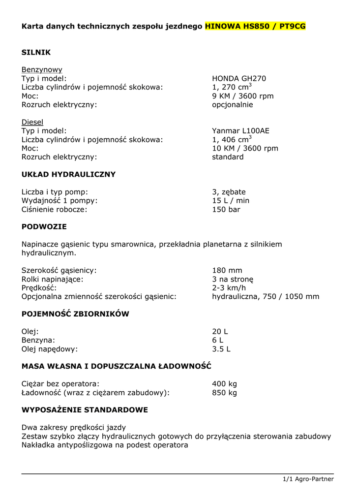 Karta danych technicznych zespołu jezdnego HINOWA HS850 / PT9CG SILNIK Benzynowy Typ i model: Liczba cylindrów i pojemność skokowa: Moc: Rozruch elektryczny: HONDA GH270 1, 270 cm3 9 KM / 3600 rpm opcjonalnie Diesel Typ i model: Liczba cylindrów i pojemność skokowa: Moc: Rozruch elektryczny: Yanmar L100AE 1, 406 cm3 10 KM / 3600 rpm standard UKŁAD HYDRAULICZNY Liczba i typ pomp: Wydajność 1 pompy: Ciśnienie robocze: 3, zębate 15 L / min 150 bar PODWOZIE Napinacze gąsienic typu smarownica, przekładnia planetarna z silnikiem hydraulicznym. Szerokość gąsienicy: Rolki napinające: Prędkość: Opcjonalna zmienność szerokości gąsienic: 180 mm 3 na stronę 2-3 km/h hydrauliczna, 750 / 1050 mm POJEMNOŚĆ ZBIORNIKÓW Olej: Benzyna: Olej napędowy: 20 L 6L 3.5 L MASA WŁASNA I DOPUSZCZALNA ŁADOWNOŚĆ Ciężar bez operatora: Ładowność (wraz z ciężarem zabudowy): 400 kg 850 kg WYPOSAŻENIE STANDARDOWE Dwa zakresy prędkości jazdy Zestaw szybko złączy hydraulicznych gotowych do przyłączenia sterowania zabudowy Nakładka antypoślizgowa na podest operatora 1/1 Agro-Partner