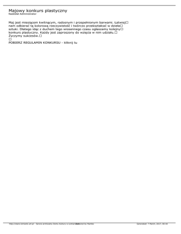 Majowy konkurs plastyczny Nadesłał Administrator Maj jest miesiącem kwitnącym, radosnym i przepełnionym barwami. Łatwiej nam odbierać tą kolorową rzeczywistość i twórczo przekształcać w dzieła sztuki. Dlatego idąc z duchem tego wiosennego czasu ogłaszamy kolejny konkurs plastyczny. Każdy jest zaproszony do wzięcia w nim udziału. Życzymy sukcesów. POBIERZ REGULAMIN KONKURSU - kliknij tu http://stare.lomianki.art.pl - Serwis archiwalny Domu Kultury w Łomiankach Powered by Mambo Generated: 7 March, 2017, 06:44
