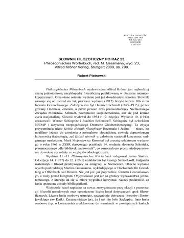 KULTURA I WARTOŚCI ISSN 2299-7806 NR 2 (6) /2013 RECENZJE s. 137–139 SŁOWNIK FILOZOFICZNY PO RAZ 23. Philosophisches Wörterbuch, red. M. Gessmann, wyd. 23, Alfred Kröner Verlag, Stuttgart 2009, ss. 790. Robert Piotrowski Philosophisches Wörterbuch wydawnictwa Alfred Kröner jest najbardziej znaną jednotomową encyklopedią filozoficzną publikowaną w obszarze niemieckojęzycznym. Omawiane ostatnie wydanie jest już dwudziestym trzecim. Słownik ukazuje się od niemal stu lat, pierwsze wydanie (1912) liczyło ledwie 106 stron formatu kieszonkowego. Założycielem był Heinrich Schmidt (1875–1935), protegowany Haeckela, członek, a przez pewien czas przewodniczący Niemieckiego Związku Monistów. Schmidt, początkowo socjaldemokrata, stał się pod koniec życia nacjonalistą. Słownik wydawał do 1934 r. (9. edycja). Wydanie 10. (1943) opracowali: Werner Schingnitz i Joachim Schondorff. Schingnitz był członkiem NSDAP i aktywistą neopogańskiego Deutsche Glaubensbewegung. Ta edycja przypominała nieco Krótki słownik filozoficzny Rozentala i Judina — nieco, bo mieliśmy jednak do czynienia z normalnym słownikiem, sowicie doprawionym hitlerowską frazeologią, zaś Krótki słownik w założeniu stanowił koncentrat wulgarnego marksizmu. Mark Mojsiejewicz Rozental był zresztą redaktorem wydanego w roku 1961 w ZSSR skróconego przekładu 14. wydania słownika Schmidta, przeznaczonego „dla bibliotek naukowych”, co oznaczało po prostu niedopuszczenie do wolnej sprzedaży ze względów ideologicznych. Wydania 11.–13. Philosophisches Wörterbuch redagował Justus Streller. Od edycji 14. (1957) do 22. (1991) redaktorem był Georgi Schischkoff, bułgarski matematyk i filozof przebywający na emigracji w Niemczech. Obecne wydanie wyszło pod redakcją Martina Gessmanna, wykładającego w Hochschule für Gestaltung w Offenbach nad Menem. Nie jest już, jak poprzednie, formatu kieszonkowego, a waży ponad kilogram. Objętościowo jest już na granicy wydawnictwa jednotomowego, z którego da się w miarę wygodnie korzystać. Należy podkreślić, że hasła opatrzone zostały bibliografiami. Większość haseł napisano na nowo, zrezygnowano przy okazji z prezentacji filozofii narodowych oraz ograniczono liczbę haseł dotyczących epok filozoficznych. Liczne hasła osobowe usunięto, szczególnie dotyczące literatów: Dostojewskiego czy Kafki. Zastanawiające jest, że i tak nie było Szekspira. Inne hasła osobowe (np. o Lorenzenie) zredukowano do wzmianek w powiązanych hasłach R. PIOTROWSKI – SŁOWNIK FILOZOFICZNY PO RAZ 23. rzeczowych, które także skomasowano, zapewne ze względu na objętość. Np. z „de Broglie’a”, „fal materii”, „kwantów światła”, „kwantu”, „mechaniki falowej” i „mechaniki kwantowej” została tylko ta ostatnia. Pozbycie się pewnych nienajlepiej napisanych drobnych haseł dotyczących nauk przyrodniczych wyszło zresztą słownikowi na dobre, o czym świadczy „elektron” czy „masa” z wydania 22. Trudno dociec, czemu ostał się Kirejewski, a znikł Bierdiajew, albo dlaczego ani w tym, ani w poprzednim wydaniu nie figuruje Florenski. Pojawiły się za to postaci ze średniowiecza, np. Gabriel Biel. W słowniku wydawanym w Niemczech nie dziwi liczna obecność filozofów pochodzących z niemieckiego obszaru językowego, bywają to żywioły pomniejszego płazu. Trzeba przyznać, że „czystka” w ostatnim wydaniu nie ominęła też Niemców, skoro usunięto choćby Schrödingera, Pascuala Jordana, skądinąd interesującego fizyka-filozofa, czy logika Alberta Mennego. Pewnych zmian nie da się nijak uzasadnić, choćby „wycięcia” von Ehrenfelsa, kardynała Newmana czy Uexkülla. Przechodząc do spraw polskich — wszyscy nasi znikli z wyjątkiem Ingardena. W poprzednim wydaniu figurowali m.in. o. Bocheński (jako filozof… szwajcarski), Hoene-Wroński, Kołakowski i Łukasiewicz. Na przykładzie poprzednich wydań słownika pokazują się zresztą zmiany opinii o naszej filozofii. Np. w wydaniu 8. (1931) za główny przejaw polskiej myśli filozoficznej uznano mesjanizm, określając go jako próbę kompensacji historycznych niedoli Polaków i zestawiając go z mesjanizmem żydowskim oraz ówczesną sytuacją w Niemczech. Mesjanizm polski miałby stanowić „złudzenie życiowe w najwyższym stopniu interesujące pod względem psychologicznym i kulturowym, z niezwykłą wyrazistością wyzwalające ostateczną warstwę licznych pobudek metafizycznych”. We wzmiankowanym hitlerowskim wydaniu 10. dodano, że filozofia polska stanowiła nieoryginalne naśladownictwo myśli europejskiej, szczególnie niemieckiej; Cieszkowski był „wrogiem Niemców”; zaś twórca mesjanizmu polskiego Hoene-Wroński nie był Polakiem. Jedne hasła udało się ulepszyć, choćby „metaforę”, inne wręcz przeciwnie: przykładem jest „holizm”. Autor hasła skupił się na teorii nauki oraz tezie Duhema-Quine’a, pomijając holizm ontologiczny. Pozytywnym zaskoczeniem jest brak większych śladów postmodernistycznych dewiacji, oszczędzono czytelnikowi choćby haseł dotyczących „genderu”, czy różnych „orientacji”. Niestety, zarówno w wydaniu 22. jak i 23. brak „płci” (była w wydaniach przedwojennych), choć jest „Eros”. Przy tej okazji można zauważyć, że pominięto Ottona Weiningera (figurował nawet w wydaniu 10.). Z wydania 23. usunięto pewne hasła, których nie ma w innych słownikach, szczególnie rzeczowe dotyczące mniej znanych koncepcji filozofów niemieckich – należy do nich „hipoteza wirtualności” (Virtuellitätshypothese Ericha Bechera). Alternatywą dla Philosophisches Wörterbuch jest podobnej objętości Handwörterbuch Philosophie pod redakcją Wulffa Rehfusa (Vandenhoeck & Ruprecht, Getynga 2003), który został zorganizowany w zgoła inny sposób. Podzielono go na części chronologiczną (siedem opracowań), osobową i rzeczową. Część osobowa zawiera lis