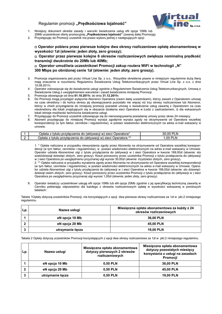 Regulamin promocji „Prędkościowa lojalność” 1. 2. Niniejszy dokument określa zasady i warunki świadczenia usług eN opcja 10Mb lub 20Mb uczestnikowi oferty promocyjnej „Prędkościowa lojalność” (zwanej dalej Promocją). Przystępując do Promocji uczestnik ma prawo wyboru jednej z następujących opcji: □ Operator pobiera przez pierwsze kolejne dwa okresy rozliczeniowe opłatę abonamentową w wysokości 1zł (słownie: jeden złoty, zero groszy); □ Operator przez pierwsze kolejne 6 okresów rozliczeniowych zwiększa nominalną prędkość transmisji dwukrotnie do 20Mb lub 40Mb; □ Operator umożliwia uczestnikowi Promocji zakup routera WiFi w technologii „N” 300 Mbps po obniżonej cenie 1zł (słownie: jeden złoty, zero groszy). 3. 4. 5. 6. 7. 8. 1 2 Promocja organizowana jest przez Virtual Line Sp. z o.o.. Wszystkie określenia pisane w niniejszym regulaminie dużą literą mają znaczenie w rozumieniu Regulaminu Świadczenia Usług Telekomunikacyjnych przez Virtual Line Sp. z o.o. z dnia 15.08.2011r. Operator zobowiązuje się do świadczenia usługi zgodnie z Regulaminem Świadczenia Usług Telekomunikacyjnych, Umową o Świadczenie Usług z uwzględnieniem warunków i zasad świadczenia niniejszej Promocji. Promocja obowiązuje od dnia 01.10.2011r. do dnia 31.12.2011r. Do Promocji mogą przystąpić wyłącznie Abonenci Operatora (zwani dalej uczestnikami), którzy zawarli z Operatorem umowę na czas określony i do końca okresu jej obowiązywania pozostało nie więcej niż trzy okresy rozliczeniowe lub Abonenci, którzy w chwili przystąpienia do niniejszej promocji posiadali umowę o świadczenie usług zawartą z Operatorem na czas nieokreślony dla lokali znajdujących się w obszarze działania sieci Operatora w Łodzi z zastrzeżeniem, iż dla wskazanych lokali istnieje możliwość techniczna świadczenia usługi. Przystępując do Promocji uczestnik zobowiązuje się do nierozwiązywania posiadanej umowy przez okres 24 miesięcy. Abonent przystępując do niniejszej Promocji wyraża zgodę/nie wyraża zgody na otrzymywanie od Operatora wszelkiej korespondencji (w tym faktur, cenników i regulaminów), w postaci wiadomości elektronicznych na adres e-mail wskazany w umowie. Opłata z tytułu przyłączenia do (aktywacji w) sieci Operatora* Opłata z tytułu przyłączenia do (aktywacji w) sieci Operatora ** 30,00 PLN 1,00 PLN 1. * Opłata naliczana w przypadku niewyrażenia zgody przez Abonenta na otrzymywanie od Operatora wszelkiej korespondencji (w tym faktur, cenników i regulaminów), w postaci wiadomości elektronicznych na adres e-mail wskazany w Umowie. Operator udziela Abonentowi ulgi z tytułu przyłączenia do (aktywacji w ) sieci Operatora w kwocie 169,00zł (słownie: sto sześćdziesiąt dziewięć złotych, zero groszy). Koszt ponoszony przez uczestnika Promocji z tytułu przełączenia do (aktywacji w ) sieci Operatora po uwzględnieniu przyznanej ulgi wynosi 30,00zł (słownie: trzydzieści złotych, zero groszy). 2. ** Opłata naliczana w przypadku wyrażenia zgody przez Abonenta na otrzymywanie od Operatora wszelkiej korespondencji (w tym faktur, cenników i regulaminów), w postaci wiadomości elektronicznych na adres e-mail wskazany w Umowie. Operator udziela Abonentowi ulgi z tytułu przyłączenia do (aktywacji w ) sieci Operatora w kwocie 198,00zł (słownie: sto dziewięćdziesiąt osiem złotych, zero groszy). Koszt ponoszony przez uczestnika Promocji z tytułu przełączenia do (aktywacji w ) sieci Operatora po uwzględnieniu przyznanej ulgi wynosi 1,00zł (słownie: jeden złoty, zero groszy). 9. Operator świadczy uczestnikowi usługę eN opcja 10Mb lub eN opcja 20Mb zgodnie z jej specyfikacją techniczną zawartą w Cenniku pobierając odpowiednio dla każdego z okresów rozliczeniowych opłatę w wysokości wskazanej w poniższych tabelach: Tabela 1Opłaty dotyczą uczestników Promocji, nie korzystających z opcji dwa pierwsze okresy rozliczeniowe za 1zł w pkt.2 niniejszego regulaminu. Lp. Nazwa usługi Miesięczna opłata abonamentowa za każdy z 24 okresów rozliczeniowych 1 eN opcja 10 Mb 36,00 PLN 2 eN opcja 20 Mb 45,00 PLN 3 utrzymanie łącza 19,00 PLN Tabela 2 Opłaty dotyczą uczestników Promocji korzystających z opcji dwa okresy rozliczeniowe za 1zł w pkt.2 niniejszego regulaminu. Miesięczna opłata abonamentowa dotyczy pozostałych miesięcy korzystania z usługi na zasadach Promocji Lp. Nazwa usługi Miesięczna opłata abonamentowa dotyczy pierwszych 2 okresów rozliczeniowych 1 eN opcja 10 Mb 0,50 PLN 36,00 PLN 2 eN opcja 20 Mb 0,50 PLN 45,00 PLN 3 utrzymanie łącza 0,50 PLN 19,00 PLN 10. Operator udziela Abonentowi ulgi z tytułu utrzymania łącza jak również z tytułu miesięcznej opłaty abonamentowej. Kwoty miesięcznej ulgi dla poszczególnych usług przedstawiają poniższe tabele: Tabela 3 Opłaty dotyczą uczestników Promocji, nie korzystających z opcji niniejszego regulaminu. dwa pierwsze okresy rozliczeniowe za 1zł w pkt.2 Lp. Nazwa usługi Kwota miesięcznej ulgi przyznanej w Promocji z tytułu opłaty abonamentowe,j na zasadach Promocji dla każdego z 24 okresów rozliczeniowych 1 eN opcja 10MB 34,00 PLN 2 eN opcja 20Mb 35,00 PLN 3 utrzymanie łącza 0,90 PLN Tabela 4 Opłaty dotyczą uczestników Promocji korzystających z opcji dwa okresy rozliczeniowe za 1zł w pkt.2 niniejszego regulaminu. Lp. Nazwa usługi Kwota miesięcznej ulgi przyznanej w Promocji z tytułu opłaty abonamentowe,j i utrzymania łącza, dotyczy pierwszych 2 okresów rozliczeniowych Kwota miesięcznej ulgi przyznanej w Promocji z tytułu opłaty abonamentowe,j dotyczy pozostałych miesięcy korzystania z usługi na zasadach Promocji 1 eN opcja 10MB 65,00 PLN 34,00 PLN 2 eN opcja 20Mb 75,00 PLN 35,00 PLN 3 utrzymanie łącza 19,40 PLN 0,90 PLN 11. W trakcie trwania umowy na warunkach niniejszej promocji uczestnik nie może zmienić wybranej usługi na inną o niższej opłacie abonamentowej. 12. W przypadku, 