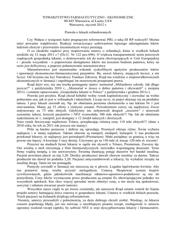 TOWARZYSTWO FARMACEUTYCZNO - EKONOMICZNE 00-845 Warszawa, ul Łucka 2/4/6 Warszawa, styczeń 2012 r. Prawda o lekach refundowanych Czy Wałęsa z tysiącami ludzi pragnącymi reformować PRL o taką III RP walczyli? Można mieć poważne wątpliwości. Reakcje towarzyszące usiłowaniom lepszego udostępniania leków ludziom chorym i przeważnie niezamożnym wręcz porażają. O co chodziło rządowi przy inspirowaniu ustawy o refundacji, która w wielkich bólach urodziła się 12 maja 2011 r.? (Dz.U. Nr 122 poz.696). O większą transparentność norm prawnych rządzących gospodarką lekami, o dostosowanie ich do norm obowiązujących w Unii Europejskiej i - przede wszystkim - o poprawienie dostępności leków nie kosztem budżetu państwa, który na razie jest deficytowy, a poprzez pohamowanie marnotrawstwa. Marnotrawstwo jest monstrualne wskutek zyskofilnych apetytów producentów leków i ignorancji ekonomiczno-farmaceutycznej pacjentów. Ba, nawet lekarzy, mających leczyć, a nie liczyć. Od liczenia ma być Narodowy Fundusz Zdrowia. Rząd ma wiedzieć o nieprawidłowościach ekonomicznych w farmacji i zapobiegać im stosownymi przepisami prawa. Rząd dużo wie, my mu trochę pomagamy (patrz: memoriał „Miliardowe szkody. Jak długo jeszcze?” z października 2010 r., „Memoriał w trosce o dobro państwa i obywateli” z sierpnia 2011r. i ostatnie opracowanie „Gospodarka lekami w Polsce” z października i grudnia 2011r.). Prawda jest przykra. Rząd chciał hołubić wolny rynek kapitalistyczny i zezwalać na wolne pobieranie cen, jak to jest w wiktuałach i tekstyliach. Licząc na to, że popyt skieruje się na produkty tańsze. I przy lekach zawiódł się. Np. do obniżania poziomu cholesterolu u nas lekiem Nr 1 jest simvastatina. Mamy jej 23 oferty z różnymi cenami. Powodzeniem cieszy się najdroższy Zocor ordynowany za 73 mln złotych. Gdybyśmy nie ordynowali drogich „zocorów” i stosowali synonimy tańsze, korzyść pacjentów i NFZ wyniosłaby 300 mln złotych!!! Np. lek do obniżania nadciśnienia nr 1, ramipril, jest dostępny z 12 źródeł tańszych i droższych. Nasz rynek faworyzuje najdroższe Tritace, przepłacając różnicą ceny 110 mln złotych!!! (dane z 2010 roku, bo ich za 2011 rok jeszcze nie mamy). Prile są bardzo pomocne i dobrze się sprzedają. Przemysł oferuje różne. Świat wybiera najlepsze i w miarę najtańsze. Takimi obecnie są ramipril, enalapril, lisinopril. U nas producent przekonał lekarzy, że najlepszy jest perindopril (Prestarium). Mało pożądany za granicą, a więc na pewno nie lepszy. A kosztuje 5 razy drożej. Używamy go za 150 mln zł, tracąc 120 mln zł. rocznie! Przecież na studiach liczni lekarze w ogóle nie słyszeli o Tritace, Prestarium, Zocorze itp. Oni wiedzę o nich otrzymują z firm farmaceutycznych, nierzadko wspomaganą duserami. Teraz firmy rządzą terapią, a nie uniwersytety. Świetną ilustracją potęgi duserów był handel insuliną. Pacjent powinien płacić za nią 3,20. Drodzy producenci dawali chorym insuliny za darmo. Tańszy producent nie dawał im podarku 3,20. Pacjenci antyszambrowali u lekarzy, by wyłudzić recepty na insulinę drogą. Tania im nie pomagała. Pomysły szwindli w farmacji nie mieszczą się w głowie. Legalne łapówkarsto kwitnie. Aby mu postawić tamę, trzeba uczynić nielegalnym. Ustawą. Skopiować system krajów cywilizowanych, gdzie jakiekolwiek machinacje rabatowo-upustowo-podarkowe są nie do pomyślenia. Ceny leków wyznaczone przez producenta są cenami fix obowiązującymi jednako we wszystkich aptekach. Kto chce więcej sprzedać może obniżyć cenę, a nie może nią spekulować, zawyżać i rabatem stwarzać pozór taniości. Wszystkie nasze rządy to po trosze rozumiały, ale nareszcie Rząd ostatni wniósł do Sejmu projekt ustawy hamującej dzicz cenową w gospodarce lekami. Ustawa w wielkich bólach przeszła. Niech pacjenci na kolanach dziękują reformatorom. Niestety, autorzy przesadzili z pobożnością, za dużo dobrego chcieli zrobić. Wiedząc, że lekarze czasem popełniają błędy, już nie mówiąc o niechlujnym pisaniu recept, zredagowali w ustawie ogromny rozdział recept (aptek), by uzbroić NFZ w oręż dyscyplinowania lekarzy i farmaceutów. Kazali aptekarzom zawierać kilkanaście tysięcy zbędnych umów (zatrudniać niepotrzebnie tysiące prawników), kazali lekarzom identyfikować chorych pod kątem ich uprawnień do leków refundowanych, co niby wydaje się logiczne, ale w Polsce nierealne. Później jeszcze autorzy wykazu leków refundowanych namnożyli kategorii odpłatności i chcieli wymóc, by lekarze pisali je na receptach. Teoretycznie jest to słuszne, ale w praktyce niemądre. Lekarze mogą więcej zrobić, jeśli nie będziemy im w leczeniu przeszkadzać rachunkowością i grozić karami. Przecież przy zamyśle ustawy chodziło o pozyskanie kilku miliardów z przemysłu, utrudnieniem mu sprzedaży nazbyt drogich leków, a nie o pozyskanie kilku milionów przez maltretowanie Bogu ducha winnych lekarzy i aptekarzy lub oskubywanie pacjentów przez pobieranie od nich przy chorobie mniej przewlekłej za lek 30% ceny, zamiast ryczałtu 3,20. Lekarze i aptekarze powinni być wolni od kar za receptę. Jeśli lekarz pisze złe recepty, może być proszony do NFZ na rozmowę. Jeśli uparcie trwa w złej pracy, można go pozbawić prawa ordynowania leków refundowanych. Nie ma i nie będzie takiej konstytucji, która by zniewalała kogokolwiek do zatrudniania kogoś niechcianego. Aptekarz nigdy nie powinien być karany za złe recepty wystawione przez lekarza. Lekarz jest dorosły i ponosi za nie odpowiedzialność. Natomiast w ustawie zamieszczono cały rozdział o aptekach, służący głównie do terroryzowania lekarzy i aptekarzy systemem kar. Kiedy oni sobie to teraz uświadomili, powstała kosmiczna awantura. Na szczęście Minister Zdrowia jest mądry i szybko reaguje na protesty lekarzy. Niestety, protesty aptekarzy