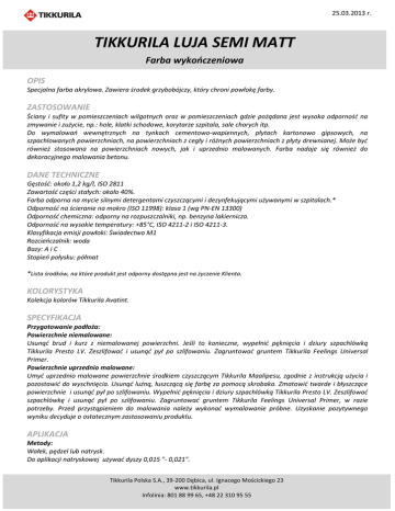 25.03.2013 r. TIKKURILA LUJA SEMI MATT Farba wykończeniowa . OPIS Specjalna farba akrylowa. Zawiera środek grzybobójczy, który chroni powłokę farby. ZASTOSOWANIE Ściany i sufity w pomieszczeniach wilgotnych oraz w pomieszczeniach gdzie pożądana jest wysoka odporność na zmywanie i zużycie, np.: hole, klatki schodowe, korytarze szpitala, sale chorych itp. Do wymalowań wewnętrznych na tynkach cementowo-wapiennych, płytach kartonowo gipsowych, na szpachlowanych powierzchniach, na powierzchniach z cegły i różnych powierzchniach z płyty drewnianej. Może być również stosowana na powierzchniach nowych, jak i uprzednio malowanych. Farba nadaje się również do dekoracyjnego malowania betonu. DANE TECHNICZNE Gęstość: około 1,2 kg/l, ISO 2811 Zawartość części stałych: około 40%. Farba odporna na mycie silnymi detergentami czyszczącymi i dezynfekującymi używanymi w szpitalach.* Odporność na ścieranie na mokro (ISO 11998): klasa 1 (wg PN-EN 13300) Odporność chemiczna: odporny na rozpuszczalniki, np. benzyna lakiernicza. Odporność na wysokie temperatury: +85°C, ISO 4211-2 i ISO 4211-3. Klasyfikacja emisji powłoki: Świadectwo M1 Rozcieńczalnik: woda Bazy: A i C Stopień połysku: półmat *Lista środków, na które produkt jest odporny dostępna jest na życzenie Klienta. KOLORYSTYKA Kolekcja kolorów Tikkurila Avatint. SPECYFIKACJA Przygotowanie podłoża: Powierzchnie niemalowane: Usunąć brud i kurz z niemalowanej powierzchni. Jeśli to konieczne, wypełnić pęknięcia i dziury szpachlówką Tikkurila Presto LV. Zeszlifować i usunąć pył po szlifowaniu. Zagruntować gruntem Tikkurila Feelings Universal Primer. Powierzchnie uprzednio malowane: Umyć uprzednio malowane powierzchnie środkiem czyszczącym Tikkurila Maalipesu, zgodnie z instrukcją użycia i pozostawić do wyschnięcia. Usunąć luźną, łuszczącą się farbę za pomocą skrobaka. Zmatowić twarde i błyszczące powierzchnie i usunąć pył po szlifowaniu. Wypełnić pęknięcia i dziury szpachlówką Tikkurila Presto LV. Zeszlifować szpachlówkę i usunąć pył po szlifowaniu. Zagruntować gruntem Tikkurila Feelings Universal Primer, w razie potrzeby. Przed przystąpieniem do malowania należy wykonać wymalowanie próbne. Uzyskanie pozytywnego wyniku decyduje o ostatecznym zastosowaniu produktu. APLIKACJA Metody: Wałek, pędzel lub natrysk. Do aplikacji natryskowej używać dyszy 0,015 "- 0,021". Tikkurila Polska S.A., 39-200 Dębica, ul. Ignacego Mościckiego 23 www.tikkurila.pl Infolinia: 801 88 99 65, +48 22 310 95 55 25.03.2013 r. TIKKURILA LUJA SEMI MATT Farba wykończeniowa . Rozcieńczanie: W razie potrzeby rozcieńczyć do 5% wodą. Warunki aplikacji: Powierzchnia przeznaczona do malowania musi być czysta i sucha, temperatura powietrza co najmniej +5°C, wilgotność względna powietrza poniżej 80%. Malowanie: Wymieszać farbę wykończeniową Tikkurila Luja przed użyciem. Nałożyć dwie warstwy wykończeniowe za pomocą pędzla, wałka lub natrysku. Przed przystąpieniem do malowania należy zakolorować dostateczną ilość farby z jednej partii produkcyjnej, celem uniknięcia ewentualnych różnic w odcieniach powłoki malarskiej. Wydajność: Około 5-8 m2/l. Przy korzystaniu z metody Luja, przy minimum dwóch warstwach wydajność wynosi 0,32 kg/m2 przy minimalnej ilości stosowanej na warstwę - 0,13 l/m2 (certyfikat C2). Czas schnięcia: W temp. +23° C i wilgotności względnej powietrza 50%, farba jest powierzchniowo sucha po około 2 h. Nakładać kolejną warstwę po 4 godzinach. Czyszczenie narzędzi: Narzędzia należy umyć wodą, bezpośrednio po zakończeniu prac. Przed czyszczeniem narzędzi malarskich usunąć z nich jak najwięcej farby. Konserwacja: Powierzchnie pomalowane farbą wykończeniową Tikkurila Luja mogą być przemalowane przy użyciu podobnych farb wodorozcieńczalnych. Czyszczenie pomalowanej powierzchni: Czyścić powierzchnie neutralnym detergentem (pH 6-8) za pomocą miękkiej szczotki, gąbki lub szmatki, najwcześniej 1 miesiąc po zakończeniu malowania. Bardzo zabrudzone powierzchnie mogą być czyszczone lekko zasadowym detergentem (pH 8-10) szmatką lub gąbką. Przemyć powierzchnię starannie po czyszczeniu. Należy postępować zgodnie z zaleceniami producenta dotyczącymi rozcieńczenia detergentu. Produkt osiąga ostateczną twardość i trwałość po upływie jednego miesiąca w normalnych warunkach, dlatego powierzchnie te muszą być traktowane z ostrożnością w tym czasie. Jeśli powierzchnie wymagają oczyszczenia zaraz po zakończeniu malowania, należy oczyścić je delikatnie miękką szczoteczką lub wilgotną ściereczką. OCHRONA ŚRODOWISKA Puste opakowania należy oddać do odzysku lub usunąć zgodnie z obowiązującymi przepisami. Płynne pozostałości należy przekazać firmom specjalistycznym posiadającym stosowne zezwolenie, w celu utylizacji lub usunąć zgodnie z obowiązującymi przepisami. WSKAZÓWKI BHP I PPOŻ. Produkt nie jest sklasyfikowany jako niebezpieczny. Karta charakterystyki produktu dostępna na życzenie Klienta. SKŁADOWANIE ORAZ TRANSPORT Chronić farbę przed mrozem. OPAKOWANIA 0,9 l; 2,7 l; 9 l Kat. A/a. Dopuszczalna zawartość LZO od 2010 r. – 30 g/l. Produkt zawiera poniżej 30 g/l LZO. Tikkurila Polska S.A., 39-200 Dębica, ul. Ignacego Mościckiego 23 www.tikkurila.pl Infolinia: 801 88 99 65, +48 22 310 95 55 25.03.2013 r. TIKKURILA LUJA SEMI MATT Farba wykończeniowa . Tikkurila Polska S.A. gwarantuje właściwą jakość produktu, nie ma jednak wpływu na warunki i sposób jego zastosowania. Producent nie odpowiada za pracę Projektanta i Wykonawcy. Przedstawione powyżej informacje zostały podane w dobrej wierze, według aktualnego stanu wiedzy i doświadczenia praktycznego, co nie zwalnia od odpowiedzialności za wykonanie prac zgodnie z zasadami sztuki budowlanej i BHP. Tikkurila Polska S.A. nie ponosi odpowiedzialności za wady i szkody powstałe w wyniku łąc