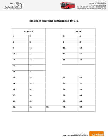 Mercedes Tourismo liczba miejsc 49+1+1 KIEROWCA PILOT 1. 2. 3. 4. 5. 6. 7. 8. 9. 10. 11. 12. 13. 14. 15. 16. 17. 18. 19. 20. 21. 22. 23. 24. 25. 26. 27. 28. 29. 30. 31. 32. 33. 34. 35. 36. 37. 38. 39. 40. 41. 42. 43. 44. 45. 46. 48. 49. 47.