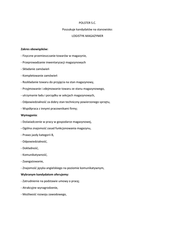 POLSTER S.C. Poszukuje kandydatów na stanowisko: LOGISTYK-MAGAZYNIER Zakres obowiązków: - Fizyczne przemieszczanie towarów w magazynie, - Przeprowadzanie inwentaryzacji magazynowych - Składanie zamówień - Kompletowanie zamówień - Rozkładanie towaru do przyjęcia na stan magazynowy, - Przyjmowanie i zdejmowanie towaru ze stanu magazynowego, - utrzymanie ładu i porządku w sekcjach magazynowych, - Odpowiedzialność za dobry stan techniczny powierzonego sprzętu, - Współpraca z innymi pracownikami firmy; Wymagania: - Doświadczenie w pracy w gospodarce magazynowej, - Ogólna znajomość zasad funkcjonowania magazynu, - Prawo jazdy kategorii B, - Odpowiedzialność, - Dokładność, - Komunikatywność, - Zaangażowanie, - Znajomość języka angielskiego na poziomie komunikatywnym, Wybranym kandydatom oferujemy: - Zatrudnienie na podstawie umowy o pracę; - Atrakcyjne wynagrodzenie, - Możliwość rozwoju zawodowego,