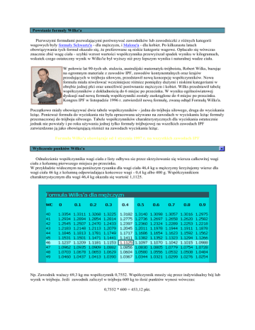 Powstanie formuły Wilks'a Pierwszymi formułami pozwalającymi porównywać zawodników lub zawodniczki z różnych kategorii wagowych były formuły Schwartz'a - dla mężczyzn, i Malone'a - dla kobiet. Po kilkunastu latach obowiązywania tych formuł okazało się, że preferowane są niskie kategorie wagowe. Opłacało się wówczas znacznie zbić wagę ciała - szybki wzrost wartości współczynnika przewyższał spadek wyniku w kilogramach, wskutek czego ostateczny wynik w Wilks'ie był wyższy niż przy lepszym wyniku i naturalnej wadze ciała. W połowie lat 90-tych ub. stulecia, australijski matematyk-trójboista, Robert Wilks, bazując na ogromnym materiale z zawodów IPF, zawodów kontynentalnych oraz krajów przodujących w trójboju siłowym, przedstawił nową koncepcję współczynników. Nowa formuła miała niwelować wcześniejsze różnice pomiędzy dużymi i niskimi kategoriami w obrębie jednej płci oraz umożliwić porównanie mężczyzn i kobiet. Wilks przedstawił tabelę współczynników z dokładnością do 6 miejsc po przecinku. W wyniku ogólnoświatowej dyskusji nad nową formułą współczynniki zostały zaokrąglone do 4 miejsc po przecinku. Kongres IPF w listopadzie 1996 r. zatwierdził nową formułę, zwaną odtąd Formułą Wilks'a. Początkowo miały obowiązywać dwie tabele współczynników - jedna do trójboju siłowego, druga do wyciskania leżąc. Ponieważ formuła do wyciskania nie była opracowana używano na zawodach w wyciskaniu leżąc formuły przeznaczonej do trójboju siłwoego. Tabele współczynników charakterystycznych dla wyciskania ostatecznie jednak nie powstały i po roku używania jednej tylko formuły trójbojowej na wszelkich zawodach IPF zatwierdzono ją jako obowiązującą róznież na zawodach wyciskania leżąc. Formuła Wilks'a obowiązuje od 1 stycznia 1997 r. na wszystkich zawodach IPF Wyliczenie punktów Wilks'a Odnalezienie współczynnika wagi ciała z listy odbywa sie przez skrzyżowanie się wiersza całkowitej wagi ciała z kolumną pierwszego miejsca po przecinku. W przykładzie widocznym na poniższym rysunku dla wagi ciała 46,4 kg u mężczyzny krzyżujemy wiersz dla wagi ciała 46 kg z kolumną odpowiadająca końcowce wagi - 0,4 kg albo 400 g. Współczynnikiem charakterystycznym dla wagi 46,4 kg okazała się wartość 1,1125. Np. Zawodnik ważacy 69,3 kg ma współczynnik 0,7552. Współczynnik mnoży się przez indywidualny bój lub wynik w trójboju. Jeśli zawodnik zaliczył w trójboju 600 kg to ilość punktów wynosi wówczas: 0,7552 * 600 = 453,12 pkt. Jego rywal z innej kategorii wagowej zaliczył 700 kg ważąc 88,0 kg. Odpowiadający tej wadze współczynnik Wilks'a ma wartość 0,6459. Ilość punktów wynosi wtedy: 0,6459 * 700 = 452,13 pkt. Tak więc lepszy okazał się lżejszy zawodnik z rezultatem 600 kg. Kategoria OPEN Na mistrzostwach w celu określenia najlepszego zawodnika zawodów oblicza się punkty Wilks'a dla najlepszego zawodnika w każdej kategorii wagowej czyli wyłania się Mistrza Mistrzów. Miejsc 2-gich, 3-ich i dalszych nie bierze się pod uwagę. Możliwa jest więc sytuacja, gdy zawodnik na drugim miejscu ma więcej punktów Wilks'a od mistrza tej kategorii. Klasyfikacja uwzględnia więc walkę ze względu na wysokość wyniku w kg w kategorii wagowej - zawodnik słabszy w tej kategorii nie jest brany pod uwagę. Kategoria WSZECHWAG W celu określenia najlepszego zawodnika zawodów ligowych, grużynowych w Wilks'ie czy pucharowych, oblicza się punkty Wilks'a dla wszystkich zawodników biorących udział w zawodach. Najlepszym zawodnikiem zostaje zawodnik mający najwięcej punktów. Ta klasyfikacja nie uwzględnia bezpośredniej walki pomiędzy zawodnikami ze względu na wynik w kg. Najlepszym zawodnikiem zawodów zostaje zawodnik posiadający faktycznie największa ilość punktów. Możliwa jest zatem sytuacja gdy zawodnik mający miejsce drugie lub dalsze w kategorii wagowej, ale lżejszy od rywali może wygrać zawody.
