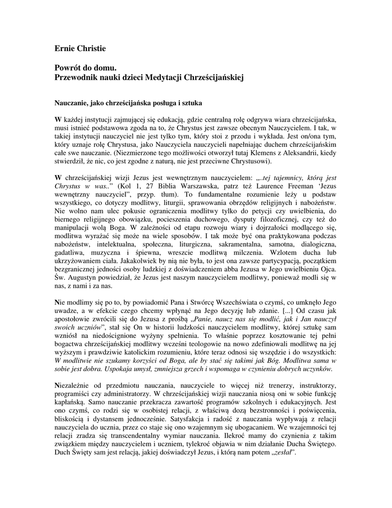 Ernie Christie Powrót do domu. Przewodnik nauki dzieci Medytacji Chrześcijańskiej Nauczanie, jako chrześcijańska posługa i sztuka W każdej instytucji zajmującej się edukacją, gdzie centralną rolę odgrywa wiara chrześcijańska, musi istnieć podstawowa zgoda na to, że Chrystus jest zawsze obecnym Nauczycielem. I tak, w takiej instytucji nauczyciel nie jest tylko tym, który stoi z przodu i wykłada. Jest on/ona tym, który uznaje rolę Chrystusa, jako Nauczyciela nauczycieli napełniając duchem chrześcijańskim całe swe nauczanie. (Niezmierzone tego możliwości otworzył tutaj Klemens z Aleksandrii, kiedy stwierdził, że nic, co jest zgodne z naturą, nie jest przeciwne Chrystusowi). W chrześcijańskiej wizji Jezus jest wewnętrznym nauczycielem: „..tej tajemnicy, którą jest Chrystus w was..” (Kol 1, 27 Biblia Warszawska, patrz też Laurence Freeman ‘Jezus wewnętrzny nauczyciel”, przyp. tłum). To fundamentalne rozumienie leży u podstaw wszystkiego, co dotyczy modlitwy, liturgii, sprawowania obrzędów religijnych i nabożeństw. Nie wolno nam ulec pokusie ograniczenia modlitwy tylko do petycji czy uwielbienia, do biernego religijnego obowiązku, pocieszenia duchowego, dysputy filozoficznej, czy też do manipulacji wolą Boga. W zależności od etapu rozwoju wiary i dojrzałości modlącego się, modlitwa wyrażać się może na wiele sposobów. I tak może być ona praktykowana podczas nabożeństw, intelektualna, społeczna, liturgiczna, sakramentalna, samotna, dialogiczna, gadatliwa, muzyczna i śpiewna, wreszcie modlitwą milczenia. Wzlotem ducha lub ukrzyżowaniem ciała. Jakakolwiek by nią nie była, to jest ona zawsze partycypacją, początkiem bezgranicznej jedności osoby ludzkiej z doświadczeniem abba Jezusa w Jego uwielbieniu Ojca. Św. Augustyn powiedział, że Jezus jest naszym nauczycielem modlitwy, ponieważ modli się w nas, z nami i za nas. Nie modlimy się po to, by powiadomić Pana i Stwórcę Wszechświata o czymś, co umknęło Jego uwadze, a w efekcie czego chcemy wpłynąć na Jego decyzję lub zdanie. [...] Od czasu jak apostołowie zwrócili się do Jezusa z prośbą „Panie, naucz nas się modlić, jak i Jan nauczył swoich uczniów”, stał się On w historii ludzkości nauczycielem modlitwy, której sztukę sam wzniósł na niedoścignione wyżyny spełnienia. To właśnie poprzez kosztowanie tej pełni bogactwa chrześcijańskiej modlitwy wcześni teologowie na nowo zdefiniowali modlitwę na jej wyższym i prawdziwie katolickim rozumieniu, które teraz odnosi się wszędzie i do wszystkich: W modlitwie nie szukamy korzyści od Boga, ale by stać się takimi jak Bóg. Modlitwa sama w sobie jest dobra. Uspokaja umysł, zmniejsza grzech i wspomaga w czynieniu dobrych uczynków. Niezależnie od przedmiotu nauczania, nauczyciele to więcej niż trenerzy, instruktorzy, programiści czy administratorzy. W chrześcijańskiej wizji nauczania niosą oni w sobie funkcję kapłańską. Samo nauczanie przekracza zawartość programów szkolnych i edukacyjnych. Jest ono czymś, co rodzi się w osobistej relacji, z właściwą dozą bezstronności i poświęcenia, bliskością i dystansem jednocześnie. Satysfakcja i radość z nauczania wypływają z relacji nauczyciela do ucznia, przez co staje się ono wzajemnym się ubogacaniem. We wzajemności tej relacji zradza się transcendentalny wymiar nauczania. Ilekroć mamy do czynienia z takim związkiem między nauczycielem i uczniem, tylekroć objawia w nim działanie Ducha Świętego. Duch Święty sam jest relacją, jakiej doświadczył Jezus, i którą nam potem „zesłał”. Chrześcijański nauczyciel musi być z całą pewnością świadom tego wymiaru swojej profesji i nie ogranicza się to tylko do nauczania przedmiotu religii. Nauczyciel jest sakramentem, znakiem Jezusa w Jego roli nauczyciela, tak jak kapłan jest Jego znakiem w powszechnym kapłaństwie wiernych. Nauczyciel i kapłan to dwie komplementarne funkcje w chrześcijańskiej wspólnocie. Jeżeli jest prawdą, że nauczyciel jest modelem Jezusa – a nie tylko Jego substytutem - to nauczyciele poprzez naturę swego powołania, większe od ich zawodu, szczególnie otwarci są na kontemplatywny wymiar. Intuicyjnie wyczuwają intymną obecność Boga we wszystkich relacjach międzyludzkich. Szczególnie zaś wyczuleni są na Jego obecność w delikatnych i pełnych znaczenia związkach, jakie mamy z dziećmi. Wzywany czy niewzywany Bóg jest ciągle obecny. Dobry, kontemplatywny nauczyciel, będzie widział Boże działanie w swej nawet najbardziej powszedniej pracy edukacyjnej. Jak naucza św. Paweł radość i pokój to owoce działania Ducha Świętego. Im wyraźniej nauczyciele czują Jego obecność, tym głębszy staje się ich spokój w wirze zajęć i tym większa będzie ich wewnętrzna cisza w środku najgwarniejszej klasy. Taki nauczyciel wie, że nawet jeżeli daje z siebie wszystko, to najcenniejsza i najtrwalsza część nauki jest wynikiem pracy Ducha Świętego w jego uczniu, bo dzieje się ona na najgłębszych poziomach jego człowieczeństwa. I tak oto kontemplatywny nauczyciel, to nauczyciel „kompletny”, ten, który dobrze zdaje sobie sprawę z tego, co naprawdę wydarza się w procesie nauczenia i pozostaje w ciągłej łączności na wszystkich poziomach ludzkich interakcji. Laurence Freeman OSB Copyright: WCCM.PL Przekład: Andrzej Ziółkowski (za zagodą MedioMidia)
