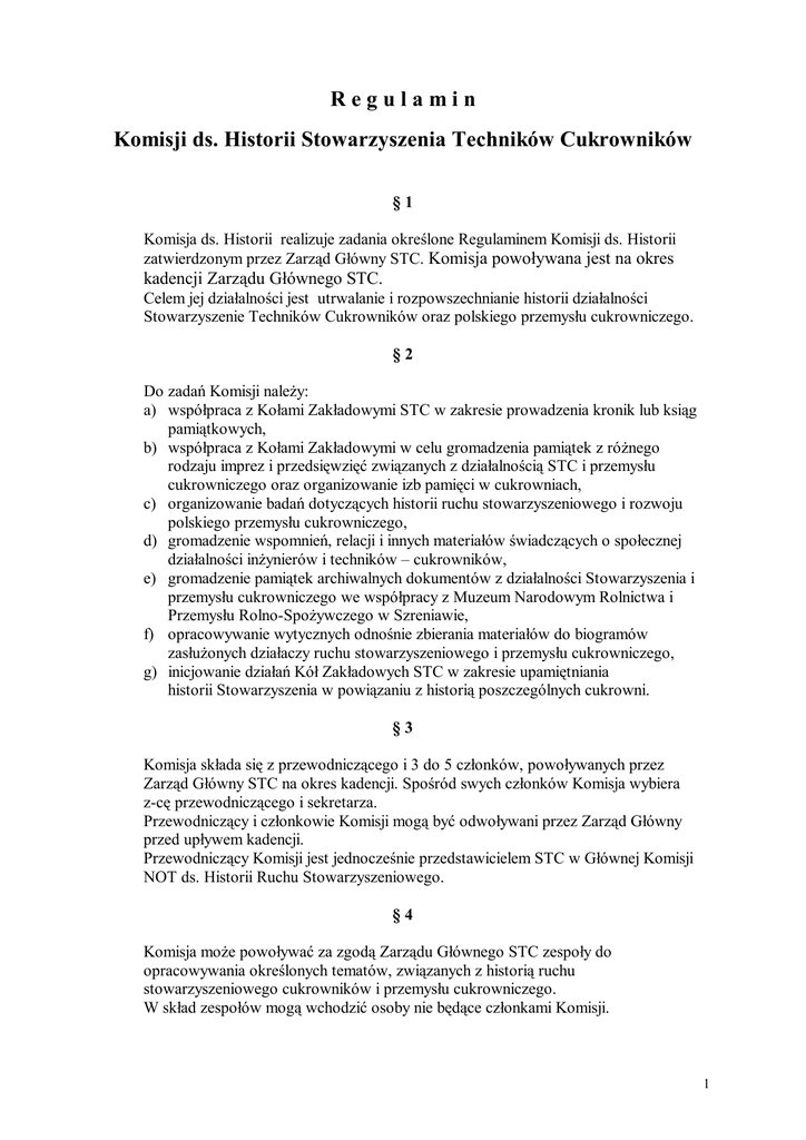 Regulamin Komisji ds. Historii Stowarzyszenia Techników Cukrowników §1 Komisja ds. Historii realizuje zadania określone Regulaminem Komisji ds. Historii zatwierdzonym przez Zarząd Główny STC. Komisja powoływana jest na okres kadencji Zarządu Głównego STC. Celem jej działalności jest utrwalanie i rozpowszechnianie historii działalności Stowarzyszenie Techników Cukrowników oraz polskiego przemysłu cukrowniczego. §2 Do zadań Komisji należy: a) współpraca z Kołami Zakładowymi STC w zakresie prowadzenia kronik lub ksiąg pamiątkowych, b) współpraca z Kołami Zakładowymi w celu gromadzenia pamiątek z różnego rodzaju imprez i przedsięwzięć związanych z działalnością STC i przemysłu cukrowniczego oraz organizowanie izb pamięci w cukrowniach, c) organizowanie badań dotyczących historii ruchu stowarzyszeniowego i rozwoju polskiego przemysłu cukrowniczego, d) gromadzenie wspomnień, relacji i innych materiałów świadczących o społecznej działalności inżynierów i techników – cukrowników, e) gromadzenie pamiątek archiwalnych dokumentów z działalności Stowarzyszenia i przemysłu cukrowniczego we współpracy z Muzeum Narodowym Rolnictwa i Przemysłu Rolno-Spożywczego w Szreniawie, f) opracowywanie wytycznych odnośnie zbierania materiałów do biogramów zasłużonych działaczy ruchu stowarzyszeniowego i przemysłu cukrowniczego, g) inicjowanie działań Kół Zakładowych STC w zakresie upamiętniania historii Stowarzyszenia w powiązaniu z historią poszczególnych cukrowni. §3 Komisja składa się z przewodniczącego i 3 do 5 członków, powoływanych przez Zarząd Główny STC na okres kadencji. Spośród swych członków Komisja wybiera z-cę przewodniczącego i sekretarza. Przewodniczący i członkowie Komisji mogą być odwoływani przez Zarząd Główny przed upływem kadencji. Przewodniczący Komisji jest jednocześnie przedstawicielem STC w Głównej Komisji NOT ds. Historii Ruchu Stowarzyszeniowego. §4 Komisja może powoływać za zgodą Zarządu Głównego STC zespoły do opracowywania określonych tematów, związanych z historią ruchu stowarzyszeniowego cukrowników i przemysłu cukrowniczego. W skład zespołów mogą wchodzić osoby nie będące członkami Komisji. 1 §5 Posiedzenia Komisji odbywają się co najmniej raz w roku i w miarę potrzeb. Zebrania Komisji zwołuje przewodniczący, przez Sekretariat Zarządu Głównego STC. Uchwały Komisji zapadają zwykłą większością głosów przy udziale co najmniej połowy składu Komisji. W razie równości głosów rozstrzyga głos przewodniczącego. Z przebiegu zebrań sporządza się protokóły, które podpisuje przewodniczący i sekretarz. §6 Przewodniczący Komisji na zaproszenie ZG bierze udział w plenarnych zebraniach Zarządu Głównego STC lub zebraniach Prezydium Zarządu Głównego STC, na których rozpatrywane są sprawy związane z działalnością Komisji. . §7 Komisja opiera swą działalność na rocznym planie pracy, akceptowanym przez Prezydium Zarządu Głównego. §8 Koszty związane z działalnością Komisji pokrywa Zarząd Główny STC w ramach rocznych preliminarzy. §9 Sprawy administracyjno-biurowe Komisji prowadzi Biuro Zarządu Głównego STC. § 10 Niniejszy regulamin uzyskuje moc obowiązującą z chwilą zatwierdzenia go przez Zarząd Główny STC. Przewodniczący Zarządu Głównego STC Stanisław Świetlicki Warszawa, 25.09.2007r. 2