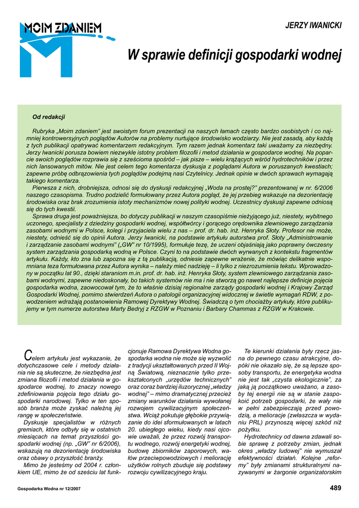 Jerzy Iwanicki W sprawie definicji gospodarki wodnej Od redakcji Rubryka „Moim zdaniem” jest swoistym forum prezentacji na naszych łamach często bardzo osobistych i co najmniej kontrowersyjnych poglądów Autorów na problemy nurtujące środowisko wodziarzy. Nie jest zasadą, aby każdą z tych publikacji opatrywać komentarzem redakcyjnym. Tym razem jednak komentarz taki uważamy za niezbędny. Jerzy Iwanicki porusza bowiem niezwykle istotny problem filozofii i metod działania w gospodarce wodnej. Na poparcie swoich poglądów rozprawia się z sześcioma spośród – jak pisze – wielu krążących wśród hydrotechników i przez nich lansowanych mitów. Nie jest celem tego komentarza dyskusja z poglądami Autora w poruszanych kwestiach; zapewne próbę odbrązowienia tych poglądów podejmą nasi Czytelnicy. Jednak opinie w dwóch sprawach wymagają takiego komentarza. Pierwsza z nich, drobniejsza, odnosi się do dyskusji redakcyjnej „Woda na prostej?” prezentowanej w nr. 6/2006 naszego czasopisma. Trudno podzielić formułowany przez Autora pogląd, że jej przebieg wskazuje na dezorientację środowiska oraz brak zrozumienia istoty mechanizmów nowej polityki wodnej. Uczestnicy dyskusji zapewne odniosą się do tych kwestii. Sprawa druga jest poważniejsza, bo dotyczy publikacji w naszym czasopiśmie nieżyjącego już, niestety, wybitnego uczonego, specjalisty z dziedziny gospodarki wodnej, współtwórcy i gorącego orędownika zlewniowego zarządzania zasobami wodnymi w Polsce, kolegi i przyjaciela wielu z nas – prof. dr. hab. inż. Henryka Słoty. Profesor nie może, niestety, odnieść się do opinii Autora. Jerzy Iwanicki, na podstawie artykułu autorstwa prof. Słoty „Administrowanie i zarządzanie zasobami wodnymi” („GW” nr 10/1995), formułuje tezę, że uczeni objaśniają jako poprawny ówczesny system zarządzania gospodarką wodną w Polsce. Czyni to na podstawie dwóch wyrwanych z kontekstu fragmentów artykułu. Każdy, kto zna lub zapozna się z tą publikacją, odniesie zapewne wrażenie, że mówiąc delikatnie wspomniana teza formułowana przez Autora wynika – należy mieć nadzieję – li tylko z niezrozumienia tekstu. Wprowadzony w początku lat 90., dzięki staraniom m.in. prof. dr. hab. inż. Henryka Słoty, system zlewniowego zarządzania zasobami wodnymi, zapewne niedoskonały, bo takich systemów nie ma i nie stworzą go nawet najlepsze definicje pojęcia gospodarka wodna, zaowocował tym, że to właśnie dzisiaj regionalne zarządy gospodarki wodnej i Krajowy Zarząd Gospodarki Wodnej, pomimo stwierdzeń Autora o patologii organizacyjnej widocznej w świetle wymagań RDW, z powodzeniem wdrażają postanowienia Ramowej Dyrektywy Wodnej. Świadczą o tym chociażby artykuły, które publikujemy w tym numerze autorstwa Marty Bedryj z RZGW w Poznaniu i Barbary Chammas z RZGW w Krakowie. Celem artykułu jest wykazanie, że dotychczasowe cele i metody działa- nia nie są skuteczne, że niezbędna jest zmiana filozofii i metod działania w gospodarce wodnej, to znaczy nowego zdefiniowania pojęcia tego działu gospodarki narodowej. Tylko w ten sposób branża może zyskać należną jej rangę w społeczeństwie. Dyskusje specjalistów w różnych gremiach, które odbyły się w ostatnich miesiącach na temat przyszłości gospodarki wodnej (np. „GW” nr 6/2006), wskazują na dezorientację środowiska oraz obawy o przyszłość branży. Mimo że jesteśmy od 2004 r. członkiem UE, mimo że od sześciu lat funkGospodarka Wodna nr 12/2007 cjonuje Ramowa Dyrektywa Wodna gospodarka wodna nie może się wyzwolić z tradycji ukształtowanych przed II Wojną Światową, nieznacznie tylko przekształconych „urzędów technicznych” oraz coraz bardziej iluzorycznej „władzy wodnej” – mimo dramatycznej przecież zmiany warunków działania wywołanej rozwojem cywilizacyjnym społeczeństwa. Wciąż pokutuje głębokie przywiązanie do idei sformułowanych w latach 20. ubiegłego wieku, kiedy nasi ojcowie uważali, że przez rozwój transportu wodnego, rozwój energetyki wodnej, budowę zbiorników zaporowych, wałów przeciwpowodziowych i meliorację użytków rolnych zbuduje się podstawy rozwoju cywilizacyjnego kraju. Te kierunki działania były rzecz jasna do pewnego czasu atrakcyjne, dopóki nie okazało się, że są lepsze sposoby transportu, że energetyka wodna nie jest tak „czysta ekologicznie”, za jaką ją początkowo uważano, a zasoby tej energii nie są w stanie zaspokoić potrzeb gospodarki, że wały nie w pełni zabezpieczają przed powodzią, a melioracje (zwłaszcza w wydaniu PRL) przynoszą więcej szkód niż pożytku. Hydrotechnicy od dawna zdawali sobie sprawę z potrzeby zmian, jednak okres „władzy ludowej” nie wymuszał efektywności działań. Kolejne „reformy” były zmianami strukturalnymi nazywanymi w żargonie organizatorskim 489 Tabela Nośność statków I > 600 t Stan obecny – km Po wykonaniu programu – km 85 203 II 400–590 t 621 1407 III 200–390 t 690 2062 IV < 200 t Ogółem 4621 2987 6017 6649 Rys. 1. Przewozy towarów w latach 1921–2002 „przestawianiem klocków”. Mimo, wydawałoby się, oczywistej potrzeby dokonania zmian funkcjonalnych, takich zmian nie przeprowadzono. Zacznę od przypomnienia zasad, które ukształtowały funkcjonujące do dziś pojęcie gospodarka wodna. Pokażę także mity i nieporozumienia, jakie powstały w wyniku ich stosowania. W artykule pt. „Gospodarka wodna w Polsce” zamieszczonym w numerze 1/1937 „Gospodarki Wodnej” Edward Romański [1] przedstawił następujący cel: „Celem gospodarki wodnej jest odprowadzenie do morza spadającej na ziemię wody przy ograniczeniu do minimum jej szkodliwego działania i przy uzyskaniu do maksimum jej działania pożytecznego jako środowiska, materii i masy”. Jak pisze E. Romański – cel ten został sformułowany na Międzynarodowym Kongresie Żeglugi w Brukseli. To sformułowanie – jak si
