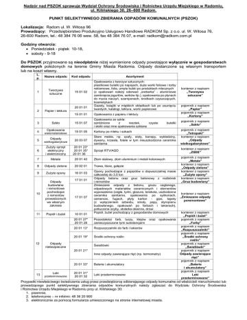 Nadzór nad PSZOK sprawuje Wydział Ochrony Środowiska i Rolnictwa Urzędu Miejskiego w Radomiu, ul. Kilińskiego 30, 26–600 Radom. PUNKT SELEKTYWNEGO ZBIERANIA ODPADÓW KOMUNALNYCH (PSZOK) Lokalizacja: Radom ul. W. Witosa 96 Prowadzący: Przedsiębiorstwo Produkcyjno Usługowo Handlowe RADKOM Sp. z o.o. ul. W. Witosa 76, 26-600 Radom, tel.: 48 384 76 06 wew. 58, fax 48 384 76 07, e-mail: [email protected] Godziny otwarcia: Poniedziałek - piątek 10-18, soboty - 9-18 Do PSZOK przyjmowane są nieodpłatnie niżej wymienione odpady powstające wyłącznie w gospodarstwach domowych położonych na terenie Gminy Miasta Radomia. Odpady dostarczone są własnym transportem lub na koszt własny. L. p. 1 Nazwa odpadu Tworzywa sztuczne Kod odpadu 15 01 02 20 01 01 2 Papier i tektura 3 Szkło 4 wielomateriałowe 5 Opakowania Odpady wielkogabarytowe Asortyment Opakowania z tworzyw sztucznych: plastikowe butelki po napojach, duże worki foliowe i torby reklamowe, folie, umyte kubki po produktach mlecznych (z opakowań należy oderwać „sreberka” - aluminiowe zamknięcia jogurtów, serków itp.), opakowania po płynach do mycia naczyń, szamponach, środkach czyszczących, kosmetykach Gazety, książki w miękkich okładkach lub po usunięciu twardych, katalogi, tektura, worki papierowe 15 01 01 Opakowania z papieru i tektury 15 01 07 Opakowania ze szkła: opróżnione z resztek, czyste i słoiki oraz inne opakowania szklane 15 01 05 Kartony po mleku i sokach 20 03 07 Stare meble, np. szafy, stoły, kanapy, wykładziny, dywany, krzesła, fotele w tym nieuszkodzona ceramika sanitarna 6 Zużyty sprzęt elektryczny i elektroniczny 20 01 23* 20 01 35* 20 01 36 7 Metale 8 butelki kontener z napisem „Tworzywa sztuczne” pojemnik z napisem „Papier” pojemnik z napisem „Kartony” pojemnik z napisem „Szkło” pojemnik z napisem „Tetrapaki” kontener z napisem „Odpady wielkogabarytowe” Sprzęt RTV/AGD kontener z napisem „ZSEE” 20 01 40 Złom stalowy, złom aluminium i metali kolorowych Odpady zielone 20 02 01 Trawa, liście, gałęzie 9 Zużyte opony 16 01 03 10 Odpady budowlane i remontowe pochodzące z remontów prowadzonych we własnym zakresie pojemnik z napisem „Metale” kontener z napisem „Odpady zielone” kontener z napisem „Zużyte opony” kontener z napisem „Gruz budowlany” 11 12 Popiół i żużel 17 01 01 17 01 07 10 01 01 Opony pochodzące z pojazdów o dopuszczalnej masie całkowitej do 3,5 ton Odpady betonu oraz gruz betonowy z rozbiórek i remontów Zmieszane odpady z betonu, gruzu ceglanego, odpadowych materiałów ceramicznych i elementów wyposażenia (cegła, tynki, glazura, terakota, uszkodzona ceramika sanitarna, opakowania po sylikonach, cemencie, fugach, płyty karton - gips, tapety (z wyłączeniem azbestu, smoły, papy, styropianu budowlanego, opakowań po farbach i lakierach), potłuczone szyby, stolarka okienna, drzwi Popiół, żużel pochodzący z gospodarstw domowych 20 01 27* 20 01 28 Pozostałości farb, tuszy, klejów zanieczyszczone tymi substancjami 20 01 13* Rozpuszczalniki do farb i lakierów 20 01 19* Środki ochrony roślin Odpady niebezpieczne oraz opakowania Świetlówki 20 01 21* Inne odpady zawierające rtęć (np. termometry) 13 Leki przeterminowane 20 01 33* Baterie i akumulatory 20 01 31* 20 01 32 Leki przeterminowane kontener z napisem „Zmieszane odpady poremontowe” kontener z napisem „Popiół i żużel” pojemnik z napisem „Farby” pojemnik z napisem „Rozpuszczalniki” pojemnik z napisem „Środki ochrony roślin” pojemnik z napisem „Świetlówki” pojemnik z napisem Odpady zawierające rtęć” pojemnik z napisem „Baterie i akumulatory” pojemnik z napisem Leki przeterminowane” Przypadki niewłaściwego świadczenia usług przez przedsiębiorcę odbierającego odpady komunalne od właścicieli nieruchomości lub prowadzącego punkt selektywnego zbierania odpadów komunalnych należy zgłaszać do Wydziału Ochrony Środowiska i Rolnictwa Urzędu Miejskiego w Radomiu przy ul. Kilińskiego 30: 1. pisemnie, 2. telefonicznie – nr infolinii: 48 36 20 900 3. elektronicznie za pomocą formularza umieszczonego na stronie internetowej miasta.