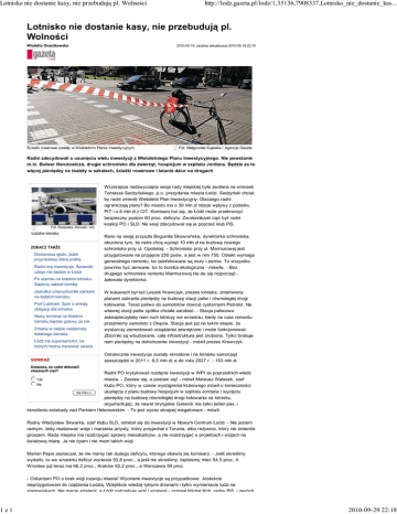 Lotnisko nie dostanie kasy, nie przebudują pl. Wolności 1z1 http://lodz.gazeta.pl/lodz/1,35136,7908337,Lotnisko_nie_dostanie_kas... Lotnisko nie dostanie kasy, nie przebudują pl. Wolności Wioletta Gnacikowska 2010-05-19, ostatnia aktualizacja 2010-05-19 22:19 ŚcieŜki rowerowe zostały w Wieloletnim Planie Inwestycyjnym Fot. Małgorzata Kujawka / Agencja Gazeta Radni zdecydowali o usunięciu wielu inwestycji z Wieloletniego Planu Inwestycyjnego. Nie powstanie m.in. Bulwar Narutowicza, drugie schronisko dla zwierząt, hospicjum w szpitalu Jordana. Będzie za to więcej pieniędzy na toalety w szkołach, ścieŜki rowerowe i łatanie dziur na drogach Fot. Radosław Jóźwiak / AG Łódzkie lotnisko ZOBACZ TAKśE Dostaniesz iglaki, jeŜeli przyniesiesz starą pralkę Radni tną inwestycje. Sprawdź, czego nie będzie w Łodzi Po alarmie na łódzkim lotnisku. Saperzy zabrali bombę Jaskółka unieruchomiła samolot na łódzkim lotnisku Port Lublinek: Spór o emisję obligacji dla lotniska Nowy terminal na łódzkim lotnisku będzie gotowy za rok Zmiany w radzie nadzorczej łódzkiego lotniska Łódź ma supersamolot, na którym moŜna trenować awarie SONDAś Wczorajsza nadzwyczajna sesja rady miejskiej była zwołana na wniosek Tomasza Sadzyńskiego, p.o. prezydenta miasta Łodzi. Sadzyński chciał, by radni zmienili Wieloletni Plan Inwestycyjny. Dlaczego radni ograniczają plany? Bo miasto ma o 30 mln zł niŜsze wpływy z podatku PIT i o 6 mln zł z CIT. Komisarz boi się, Ŝe Łódź moŜe przekroczyć bezpieczny poziom 60 proc. deficytu. Zwolennikami cięć byli radni koalicji PO i SLD. Na sesji zdecydował się je poprzeć klub PiS. Rano na sesję przyszła Bogumiła Skowrońska, dyrektorka schroniska, oburzona tym, Ŝe radni chcą wyciąć 10 mln zł na budowę nowego schroniska przy ul. Opolskiej. - Schronisko przy ul. Marmurowej jest przygotowane na przyjęcie 250 psów, a jest w nim 750. Obiekt wymaga generalnego remontu, bo zainfekowane są mury i ziemia. To wszystko powinno być zerwane, bo to bomba ekologiczna - mówiła. - Bez drugiego schroniska remontu Marmurowej nie da się rozpocząć Ŝałowała dyrektorka. W kuluarach był teŜ Leszek Krawczyk, prezes lotniska, zmartwiony planami zabrania pieniędzy na budowę stacji paliw i równoległej drogi kołowania. Teraz paliwo do samolotów dowozi cysternami Petrolot. Na własnej stacji paliw spółka chciała zarabiać. - Stacja paliwowa zabezpieczyłaby nam ruch lotniczy we wrześniu, kiedy na czas remontu przejmiemy samoloty z Okęcia. Stacja jest juŜ na takim etapie, Ŝe wystarczy zamontować urządzenia zewnętrzne i moŜe funkcjonować. Zbiorniki są wbudowane, cała infrastruktura jest zrobiona. Tylko brakuje nam pieniędzy na dokończenie inwestycji - mówił prezes Krawczyk. Ostatecznie inwestycje zostały skreślone i na lotnisku samorząd zaoszczędzi w 2011 r. 8,5 mln zł, a do roku 2027 r. - 153 mln zł. UwaŜasz, Ŝe radni dokonali słusznych cięć? Radni PO krytykowali rozdęcie inwestycji w WPI za poprzednich władz miasta. - Zastaw się, a postaw się! - mówił Mateusz Walasek, szef klubu PO, który w czasie wystąpienia klubowego mówił o konieczności usunięcia z planu budowy hospicjum w szpitalu Jordana i wycięciu pieniędzy na budowę równoległej drogi kołowania na lotnisku, argumentując, Ŝe nawet brytyjskie Gatwick ma tylko jeden pas, i skreśleniu estakady nad Parkiem Helenowskim. - To jest wyraz skrajnej megalomani - mówił. Tak Nie Radny Władysław Skwarka, szef klubu SLD, odniósł się do inwestycji w Nowym Centrum Łodzi: - Nie jestem radnym, Ŝeby realizować wizje i marzenia artysty, który przyjechał z Torunia, albo reŜysera, który nie śmierdzi groszem. Rada miejska ma rozstrzygać sprawy mieszkańców, a nie rozstrzygać o projektach i wizjach na światową miarę. Ja nie ćpam i nie mam takich wizji. Marian Papis zaznaczał, Ŝe nie mamy tak duŜego deficytu, którego obawia się komisarz. - Jeśli skreślimy wydatki, to we wrześniu deficyt wyniesie 50,8 proc., a jeśli nie skreślimy, będziemy mieć 54,5 proc. A Wrocław juŜ teraz ma 66,2 proc., Kraków 62,2 proc., a Warszawa 59 proc. - OskarŜam PO o brak wizji rozwoju miasta! Wycinane inwestycje są przypadkowe. Jesteście nieprzygotowani do rządzenia Łodzią. Wzięliście władzę tylnymi drzwiami i tylko wymieniacie ludzi na stanowiskach. Nie macie strategii, a Łódź potrzebuje wizji i strategii - grzmiał Michał Król, radny PiS, i zwrócił 2010-09-29 22:18