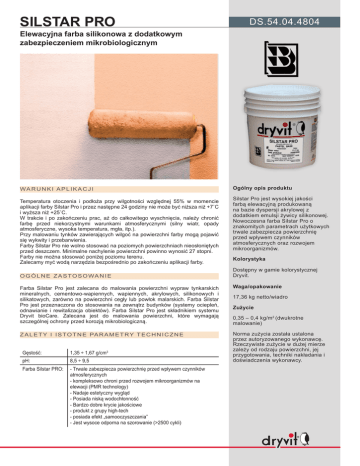 SILSTAR PRO DS.54.04.4804 Elewacyjna farba silikonowa z dodatkowym zabezpieczeniem mikrobiologicznym WA R U N K I A P L I K A C J I Temperatura otoczenia i podłoża przy wilgotności względnej 55% w momencie aplikacji farby Silstar Pro i przez następne 24 godziny nie może być niższa niż +7˚C i wyższa niż +25˚C. W trakcie i po zakończeniu prac, aż do całkowitego wyschnięcia, należy chronić farbę przed niekorzystnymi warunkami atmosferycznymi (silny wiatr, opady atmosferyczne, wysoka temperatura, mgła, itp.). Przy malowaniu tynków zawierających wilgoć na powierzchni farby mogą pojawić się wykwity i przebarwienia. Farby Silstar Pro nie wolno stosować na poziomych powierzchniach nieosłoniętych przed deszczem. Minimalne nachylenie powierzchni powinno wynosić 27 stopni. Farby nie można stosować poniżej poziomu terenu. Zalecamy myć wodą narzędzia bezpośrednio po zakończeniu aplikacji farby. O G Ó L N E Z A S T O S O WA N I E Ogólny opis produktu Silstar Pro jest wysokiej jakości farbą elewacyjną produkowaną na bazie dyspersji akrylowej z dodatkiem emulsji żywicy silikonowej. Nowoczesna farba Silstar Pro o znakomitych parametrach użytkowych trwale zabezpiecza powierzchnię przed wpływem czynników atmosferycznych oraz rozwojem mikroorganizmów. Kolorystyka Dostępny w gamie kolorystycznej Dryvit. Farba Silstar Pro jest zalecana do malowania powierzchni wypraw tynkarskich mineralnych, cementowo-wapiennych, wapiennych, akrylowych, silikonowych i silikatowych, zarówno na powierzchni cegły lub powłok malarskich. Farba Silstar Pro jest przeznaczona do stosowania na zewnątrz budynków (systemy ociepleń, odnawianie i rewitalizacja obiektów). Farba Silstar Pro jest składnikiem systemu Dryvit bioCare. Zalecana jest do malowania powierzchni, które wymagają szczególnej ochrony przed korozją mikrobiologiczną. Waga/opakowanie Z A L E T Y I I S T O T N E PA R A M E T R Y T E C H N I C Z N E Norma zużycia została ustalona przez autoryzowanego wykonawcę. Rzeczywiste zużycie w dużej mierze zależy od rodzaju powierzchni, jej przygotowania, techniki nakładania i doświadczenia wykonawcy. Gęstość: 1,35 ÷ 1,67 g/cm3 pH: 8,5 ÷ 9,5 Farba Silstar PRO: - Trwale zabezpiecza powierzchnię przed wpływem czynników atmosferycznych - kompleksowo chroni przed rozwojem mikroorganizmów na elewacji (PMR technology) - Nadaje estetyczny wygląd - Posiada niską wodochłonność - Bardzo dobre krycie jakościowe - produkt z grupy high-tech - posiada efekt „samooczyszczania” - Jest wysoce odporna na szorowanie (>2500 cykli) 17,36 kg netto/wiadro Zużycie 0,35 – 0,4 kg/m2 (dwukrotne malowanie) SILSTAR PRO DS.54.04.4804 Elewacyjna farba silikonowa z dodatkowym zabezpieczeniem mikrobiologicznym P R Z Y G O T O WA N I E P O D Ł O Ż A Powierzchnia powinna być gładka, czysta, sucha, dobrze związana, wolna od nalotów, wykwitów, tłustych plam i innych środków utrudniających aplikację. Wyprawy tynkarskie Drytex i Roxtex Powinny być całkowicie wyschnięte, jednak do malowania można przystąpić nie wcześniej niż po upływie 48 godzin od ich ułożenia (temperatura 20˚C, wilgotność względna 55%). Przy niższych temperaturach i wyższej wilgotności, zwłaszcza jesienią, czas ten ulega wydłużeniu. W przypadku aplikacji w wyższych temperaturach, wyprawy tynkarskie należy pielęgnować poprzez zwilżanie wodą. Pielęgnację należy zakończyć co najmniej 12 godzin przed rozpoczęciem malowania. Tynki cementowo-wapienne i podłoża betonowe Powinny być całkowicie wyschnięte, jednak do malowania można przystąpić nie wcześniej niż po upływie 28 dni od ich ułożenia (temperatura 20˚C, wilgotność względna 55%). Podłoże należy zagruntować preparatem Strongsil. Do malowania można przystąpić nie wcześniej niż po upływie 12 godzin od zagruntowania. Malowanie starych podłoży mineralnych, tynków akrylowych, silikonowych i silikatowych Należy usunąć luźne fragmenty, powierzchnię umyć, opłukać, osuszyć, ubytki uzupełnić, a następnie zagruntować preparatem Strongsil. Do malowania można przystąpić nie wcześniej niż po upływie 12 godzin od zagruntowania. Malowanie powłok malarskich Należy usunąć luźne, łuszczące się powłoki malarskie, a następnie zagruntować preparatem Strongsil. Do malowania można przystąpić nie wcześniej niż po upływie 12 godzin od zagruntowania. Warunki i czas przechowywania Przechowywać w zamkniętych, oryginalnych pojemnikach w temperaturze od 7˚C do 38˚C, maksimum 12 miesięcy od daty produkcji podanej na opakowaniu. Pojemniki chronić przed uszkodzeniami oraz bezpośrednim wpływem promieniowania słonecznego. Czas schnięcia Około 12 godzin w temperaturze +20˚C i przy wilgotności względnej 55%. W niższych temperaturach i przy wyższej wilgotności względnej czas schnięcia ulega wydłużeniu. Konserwacja Powierzchnię pomalowaną farbą Silstar Pro można myć przy zastosowaniu środka Algo Stop. Po użyciu Algo Stop mytą powierzchnię należy spłukać wodą. Maksymalne ciśnienie mycia 120 atmosfer. Odległość dyszy myjącej od ściany powinna wynosić 0,4-0,5 m. Dopuszczenie do zastosowania Produkt zgodny z: P R Z Y G O T O WA N I E M AT E R I A Ł U D O U Ż Y C I A PN-EN 1062-1:2005 Farby i lakiery Bezpośrednio przed użyciem farbę należy dokładnie wymieszać przy użyciu czystego mieszadła wolnoobrotowego ze stali nierdzewnej (400-500 obr./min). Czas mieszania 1-1,5 minuty. Nie dopuszcza się dodawania wody do farby Silstar Pro. Produkt posiada Atest Higieniczny PZH: SPOSÓB UŻYCIA / APLIKACJI Farbę Silstar Pro należy nakładać co najmniej w dwóch warstwach, za pomocą pędzla, wałka lub metodą natryskową. Do nakładania drugiej warstwy można przystąpić nie wcześniej niż po upływie 12 godzin od nałożenia warstwy pierwszej. Aplikacja farby na jednolitej powierzchni musi być wykonywana w sposób ciągły (bez przerw). Aby uniknąć r