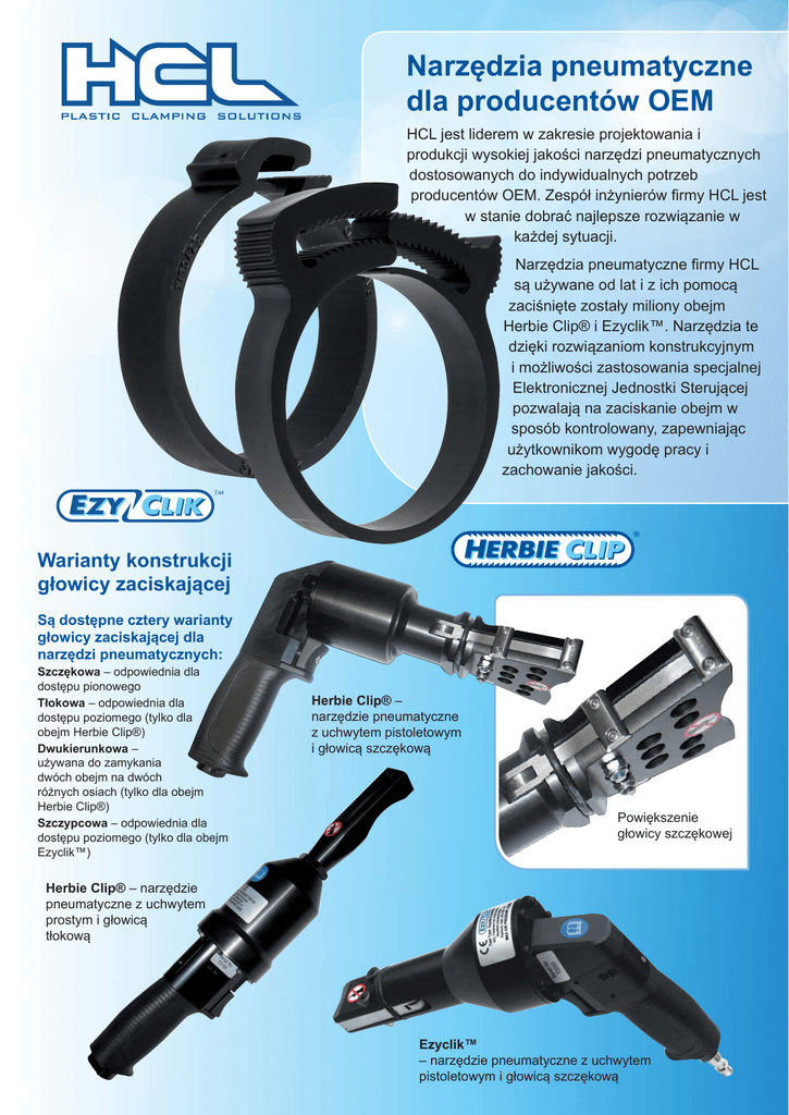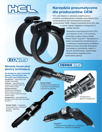 Narzędzia pneumatyczne dla producentów OEM HCL jest liderem w zakresie projektowania i produkcji wysokiej jakości narzędzi pneumatycznych dostosowanych do indywidualnych potrzeb producentów OEM. Zespół inżynierów firmy HCL jest w stanie dobrać najlepsze rozwiązanie w każdej sytuacji. Narzędzia pneumatyczne firmy HCL są używane od lat i z ich pomocą zaciśnięte zostały miliony obejm Herbie Clip® i Ezyclik™. Narzędzia te dzięki rozwiązaniom konstrukcyjnym i możliwości zastosowania specjalnej Elektronicznej Jednostki Sterującej pozwalają na zaciskanie obejm w sposób kontrolowany, zapewniając użytkownikom wygodę pracy i zachowanie jakości. Warianty konstrukcji głowicy zaciskającej Są dostępne cztery warianty głowicy zaciskającej dla narzędzi pneumatycznych: Szczękowa – odpowiednia dla dostępu pionowego Tłokowa – odpowiednia dla dostępu poziomego (tylko dla obejm Herbie Clip®) Dwukierunkowa – używana do zamykania dwóch obejm na dwóch różnych osiach (tylko dla obejm Herbie Clip®) Szczypcowa – odpowiednia dla dostępu poziomego (tylko dla obejm Ezyclik™) Herbie Clip® – narzędzie pneumatyczne z uchwytem pistoletowym i głowicą szczękową Powiększenie głowicy szczękowej Herbie Clip® – narzędzie pneumatyczne z uchwytem prostym i głowicą tłokową Ezyclik™ – narzędzie pneumatyczne z uchwytem pistoletowym i głowicą szczękową Warianty uchwytu Są dostępne trzy rodzaje uchwytów dla wszystkich typów narzędzi pneumatycznych. Uchwyt pistoletowy – odpowiedni dla dostępu poziomego i pionowego. Uchwyt prosty – idealny dla dostępu z boku Uchwyt pionowy – idealny dla dostępu pionowego Uchwyt pistoletowy Uchwyt prosty Uchwyt pionowy Elektroniczna Jednostka Sterująca (tylko dla obejm Herbie Clip®) W celu wyeliminowania błędów na liniach produkcyjnych Elektroniczna Jednostka Sterująca reguluje trzy główne zmienne procesu zaciskania obejmy: Czas Utrzymuje stały czas zaciskania obejm przez narzędzie pneumatyczne Kontrola ciśnienia Utrzymuje stałą siłę zaciskania obejm przez narzędzie pneumatyczne Kontrola położenia Kontroluje położenie obejmy. Inne cechy Elektronicznej Jednostki Sterującej to: Kontrola prędkości Zabezpiecza narzędzie pneumatyczne przed zbyt szybkim zaciskaniem, ale szybko odpuszcza zacisk Specjalne narzędzia pneumatyczne Sterowanie Narzędzie może być uruchamiane poprzez przycisk na uchwycie bądź za pomocą pedału nożnego Wysokie ciśnienie Elektroniczna Jednostka Sterująca jest przeznaczona do pracy z ciśnieniem do 10 barów (1MPa/145psi) Regulacja ciśnienia Zapewnia dokładne ustawienie potrzebnej do zaciskania siły. Wysyłanie sygnału na zewnątrz Może wysłać sygnał zwrotny do systemów nadzorujących linię produkcyjną Elektroniczna Jednostka Sterująca może zostać dostosowana do indywidualnych potrzeb klienta. Zastosowany w elektronicznej jednostce sterującej, opracowany specjalnie dla narzędzi pneumatycznych Herbie Clip, system kontroli czasu zaciskania obejm pozwala na utrzymanie jakości procesów produkcyjnych. Akcesoria Konserwacja Przetwornica Narzędzie do montażu równoległego z głowicą szczypcową do montażu obejm na uszczelce drzwiczek. Firma HCL Fasteners zapewnia pełne wsparcie serwisowe oraz dostęp do części zamiennych. Regulator ciśnienia Dystrybucja w Polsce: SUPRIMA, ul. Gryfa Pomorskiego 65D/10, 81-572 Gdynia Tel./Faks: +48 58 78 11 305 Kom. +48 664 114 055 E-mail: [email protected] www.suprima.pl UK Sales HCL Fasteners Limited, First Avenue, Westfield Industrial Estate, Radstock, Bath BA3 4BS, UK Tel: +44 (0)1761 417714 Fax: +44 (0)1761 417710 Email: [email protected] www.hclfasteners.co.uk ISO 9001: 2000