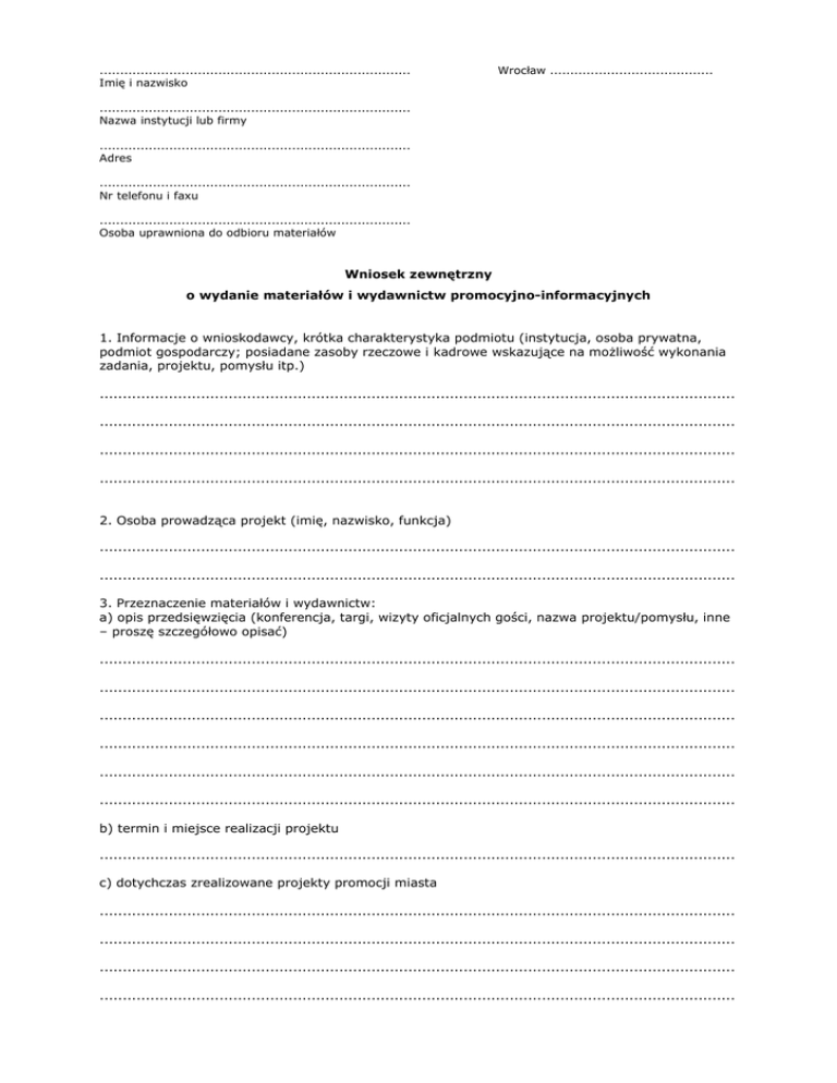 ............................................................................ Imię i nazwisko Wrocław ........................................ ............................................................................ Nazwa instytucji lub firmy ............................................................................ Adres ............................................................................ Nr telefonu i faxu ............................................................................ Osoba uprawniona do odbioru materiałów Wniosek zewnętrzny o wydanie materiałów i wydawnictw promocyjno-informacyjnych 1. Informacje o wnioskodawcy, krótka charakterystyka podmiotu (instytucja, osoba prywatna, podmiot gospodarczy; posiadane zasoby rzeczowe i kadrowe wskazujące na moŜliwość wykonania zadania, projektu, pomysłu itp.) .......................................................................................................................................... .......................................................................................................................................... .......................................................................................................................................... .......................................................................................................................................... 2. Osoba prowadząca projekt (imię, nazwisko, funkcja) .......................................................................................................................................... .......................................................................................................................................... 3. Przeznaczenie materiałów i wydawnictw: a) opis przedsięwzięcia (konferencja, targi, wizyty oficjalnych gości, nazwa projektu/pomysłu, inne – proszę szczegółowo opisać) .......................................................................................................................................... .......................................................................................................................................... .......................................................................................................................................... .......................................................................................................................................... .......................................................................................................................................... .......................................................................................................................................... b) termin i miejsce realizacji projektu .......................................................................................................................................... c) dotychczas zrealizowane projekty promocji miasta .......................................................................................................................................... .......................................................................................................................................... .......................................................................................................................................... .......................................................................................................................................... e) ilość potrzebnych materiałów i do kogo będą adresowane (proszę podać liczbę osób z moŜliwie precyzyjnym określeniem pozycji zawodowej, społecznej itp.) .......................................................................................................................................... .......................................................................................................................................... .......................................................................................................................................... f) sposób promocji projektu .......................................................................................................................................... .......................................................................................................................................... 4. Proszę określić wersję językową zamawianych materiałów .......................................................................................................................................... 5. Wkład własny wnioskodawcy w organizację przedsięwzięcia .......................................................................................................................................... .......................................................................................................................................... 6. Źródła finansowania przedsięwzięcia (środki własne, sponsorzy niekomercyjni – instytucje, fundacje, sponsorzy komercyjni, uczestnicy) .......................................................................................................................................... .......................................................................................................................................... 7. Zobowiązuję się do przedstawienia sprawozdania i dokumentacji fotograficznej z realizacji projektu w ciągu 30 dni od daty imprezy, tj. do dnia ................................................................. 8. WyraŜam zgodę na przetwarzanie moich danych osobowych zawartych powyŜej dla potrzeb niezbędnych do realizacji wniosku o wydanie materiałów i wydawnictw promocyjno-informacyjnych (zgodnie z Ustawą o Ochronie Danych Osobowych z dnia 29.08.1997 roku, tekst jednolity Dz. U. z 2002 r. Nr 101, poz. 926 ze zm.). .................................................. Podpis wnio