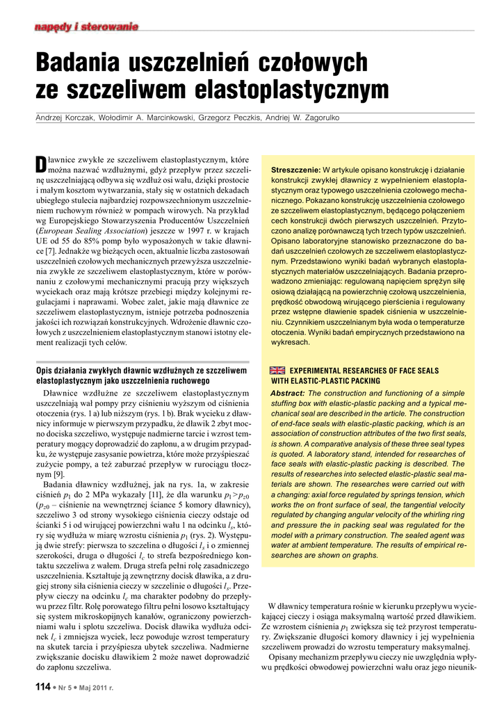 Badania uszczelnień czołowych ze szczeliwem elastoplastycznym Andrzej Korczak, Wołodimir A. Marcinkowski, Grzegorz Peczkis, Andriej W. Zagorulko D ławnice zwykłe ze szczeliwem elastoplastycznym, które można nazwać wzdłużnymi, gdyż przepływ przez szczelinę uszczelniającą odbywa się wzdłuż osi wału, dzięki prostocie i małym kosztom wytwarzania, stały się w ostatnich dekadach ubiegłego stulecia najbardziej rozpowszechnionym uszczelnieniem ruchowym również w pompach wirowych. Na przykład wg Europejskiego Stowarzyszenia Producentów Uszczelnień (European Sealing Association) jeszcze w 1997 r. w krajach UE od 55 do 85% pomp było wyposażonych w takie dławnice [7]. Jednakże wg bieżących ocen, aktualnie liczba zastosowań uszczelnień czołowych mechanicznych przewyższa uszczelnienia zwykłe ze szczeliwem elastoplastycznym, które w porównaniu z czołowymi mechanicznymi pracują przy większych wyciekach oraz mają krótsze przebiegi między kolejnymi regulacjami i naprawami. Wobec zalet, jakie mają dławnice ze szczeliwem elastoplastycznym, istnieje potrzeba podnoszenia jakości ich rozwiązań konstrukcyjnych. Wdrożenie dławnic czołowych z uszczelnieniem elastoplastycznym stanowi istotny element realizacji tych celów. Opis działania zwykłych dławnic wzdłużnych ze szczeliwem elastoplastycznym jako uszczelnienia ruchowego Dławnice wzdłużne ze szczeliwem elastoplastycznym uszczelniają wał pompy przy ciśnieniu wyższym od ciśnienia otoczenia (rys. 1 a) lub niższym (rys. 1 b). Brak wycieku z dławnicy informuje w pierwszym przypadku, że dławik 2 zbyt mocno dociska szczeliwo, występuje nadmierne tarcie i wzrost temperatury mogący doprowadzić do zapłonu, a w drugim przypadku, że występuje zasysanie powietrza, które może przyśpieszać zużycie pompy, a też zaburzać przepływ w rurociągu tłocznym [9]. Badania dławnicy wzdłużnej, jak na rys. 1a, w zakresie ciśnień p1 do 2 MPa wykazały [11], że dla warunku p1 > pz0 (pz0 – ciśnienie na wewnętrznej ściance 5 komory dławnicy), szczeliwo 3 od strony wysokiego ciśnienia cieczy odstaje od ścianki 5 i od wirującej powierzchni wału 1 na odcinku ls, który się wydłuża w miarę wzrostu ciśnienia p1 (rys. 2). Występują dwie strefy: pierwsza to szczelina o długości l s i o zmiennej szerokości, druga o długości lc to strefa bezpośredniego kontaktu szczeliwa z wałem. Druga strefa pełni rolę zasadniczego uszczelnienia. Kształtuje ją zewnętrzny docisk dławika, a z drugiej strony siła ciśnienia cieczy w szczelinie o długości l s. Przepływ cieczy na odcinku lc ma charakter podobny do przepływu przez filtr. Rolę porowatego filtru pełni losowo kształtujący się system mikroskopijnych kanałów, ograniczony powierzchniami wału i splotu szczeliwa. Docisk dławika wydłuża odcinek lc i zmniejsza wyciek, lecz powoduje wzrost temperatury na skutek tarcia i przyśpiesza ubytek szczeliwa. Nadmierne zwiększanie docisku dławikiem 2 może nawet doprowadzić do zapłonu szczeliwa. 114 l Nr 5 l Maj 2011 r. Streszczenie: W artykule opisano konstrukcję i działanie konstrukcji zwykłej dławnicy z wypełnieniem elastoplastycznym oraz typowego uszczelnienia czołowego mechanicznego. Pokazano konstrukcję uszczelnienia czołowego ze szczeliwem elastoplastycznym, będącego połączeniem cech konstrukcji dwóch pierwszych uszczelnień. Przytoczono analizę porównawczą tych trzech typów uszczelnień. Opisano laboratoryjne stanowisko przeznaczone do badań uszczelnień czołowych ze szczeliwem elastoplastycznym. Przedstawiono wyniki badań wybranych elastoplastycznych materiałów uszczelniających. Badania przeprowadzono zmieniając: regulowaną napięciem sprężyn siłę osiową działającą na powierzchnię czołową uszczelnienia, prędkość obwodową wirującego pierścienia i regulowany przez wstępne dławienie spadek ciśnienia w uszczelnieniu. Czynnikiem uszczelnianym była woda o temperaturze otoczenia. Wyniki badań empirycznych przedstawiono na wykresach. Experimental researches of face seals with elastic-plastic packing Abstract: The construction and functioning of a simple stuffing box with elastic-plastic packing and a typical mechanical seal are described in the article. The construction of end-face seals with elastic-plastic packing, which is an association of construction attributes of the two first seals, is shown. A comparative analysis of these three seal types is quoted. A laboratory stand, intended for researches of face seals with elastic-plastic packing is described. The results of researches into selected elastic-plastic seal materials are shown. The researches were carried out with a changing: axial force regulated by springs tension, which works the on front surface of seal, the tangential velocity regulated by changing angular velocity of the whirling ring and pressure the in packing seal was regulated for the model with a primary construction. The sealed agent was water at ambient temperature. The results of empirical researches are shown on graphs. W dławnicy temperatura rośnie w kierunku przepływu wyciekającej cieczy i osiąga maksymalną wartość przed dławikiem. Ze wzrostem ciśnienia p1 zwiększa się też przyrost temperatury. Zwiększanie długości komory dławnicy i jej wypełnienia szczeliwem prowadzi do wzrostu temperatury maksymalnej. Opisany mechanizm przepływu cieczy nie uwzględnia wpływu prędkości obwodowej powierzchni wału oraz jego nieunik- a) Rys. 2. Odkształcenia plastycznego wypełnienia dławnicy wzdłużnej pod wpływem ciśnienia p1 > pz0 b) Rys. 1. Konstrukcje dławnicy wzdłużnej ze szczeliwem elastoplastycznym dla: a) p1 > pot ; b) p1 < pot nionych poprzecznych i kątowych drgań. Wywołują one efekty hydrodynamiczne oraz wpływają na geometrię mikroszczelin. Drgania wału powodują też oscylujące naprężenia w szczeliwie, które prowadzą do lokalnego wzrostu temperatury i przyśpieszenia jego 