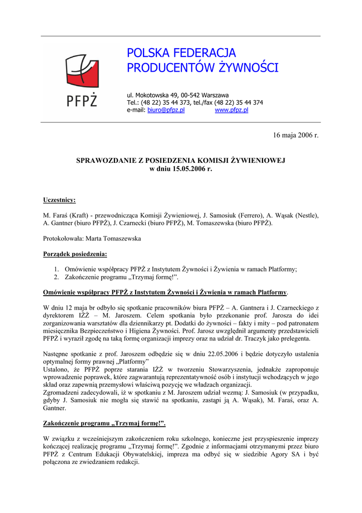 POLSKA FEDERACJA PRODUCENTÓW ŻYWNOŚCI ul. Mokotowska 49, 00-542 Warszawa Tel.: (48 22) 35 44 373, tel./fax (48 22) 35 44 374 www.pfpz.pl e-mail: [email protected] 16 maja 2006 r. SPRAWOZDANIE Z POSIEDZENIA KOMISJI ŻYWIENIOWEJ w dniu 15.05.2006 r. Uczestnicy: M. Faraś (Kraft) - przewodnicząca Komisji Żywieniowej, J. Samosiuk (Ferrero), A. Wąsak (Nestle), A. Gantner (biuro PFPŻ), J. Czarnecki (biuro PFPŻ), M. Tomaszewska (biuro PFPŻ). Protokołowała: Marta Tomaszewska Porządek posiedzenia: 1. Omówienie współpracy PFPŻ z Instytutem Żywności i Żywienia w ramach Platformy; 2. Zakończenie programu „Trzymaj formę!”. Omówienie współpracy PFPŻ z Instytutem Żywności i Żywienia w ramach Platformy. W dniu 12 maja br odbyło się spotkanie pracowników biura PFPŻ – A. Gantnera i J. Czarneckiego z dyrektorem IŻŻ – M. Jaroszem. Celem spotkania było przekonanie prof. Jarosza do idei zorganizowania warsztatów dla dziennikarzy pt. Dodatki do żywności – fakty i mity – pod patronatem miesięcznika Bezpieczeństwo i Higiena Żywności. Prof. Jarosz uwzględnił argumenty przedstawicieli PFPŻ i wyraził zgodę na taką formę organizacji imprezy oraz na udział dr. Traczyk jako prelegenta. Następne spotkanie z prof. Jaroszem odbędzie się w dniu 22.05.2006 i będzie dotyczyło ustalenia optymalnej formy prawnej „Platformy” Ustalono, że PFPŻ poprze starania IŻŻ w tworzeniu Stowarzyszenia, jednakże zaproponuje wprowadzenie poprawek, które zagwarantują reprezentatywność osób i instytucji wchodzących w jego skład oraz zapewnią przemysłowi właściwą pozycję we władzach organizacji. Zgromadzeni zadecydowali, iż w spotkaniu z M. Jaroszem udział wezmą: J. Samosiuk (w przypadku, gdyby J. Samosiuk nie mogła się stawić na spotkaniu, zastąpi ją A. Wąsak), M. Faraś, oraz A. Gantner. Zakończenie programu „Trzymaj formę!”. W związku z wcześniejszym zakończeniem roku szkolnego, konieczne jest przyspieszenie imprezy kończącej realizację programu „Trzymaj formę!”. Zgodnie z informacjami otrzymanymi przez biuro PFPŻ z Centrum Edukacji Obywatelskiej, impreza ma odbyć się w siedzibie Agory SA i być połączona ze zwiedzaniem redakcji. Uczestnicy spotkania ustalili, że koszty imprezy zostaną pokryte z budżetu Komisji ds. Żywienia. Ponadto, M. Faraś zawnioskowała o nagrodę w wysokości 8 tys złotych dla A. Gantnera za pracę przy realizacji programu. Uczestnicy zebrania wyrazili zgodę na przyznanie premii. Członkowie Komisji zadecydowali o zaproszeniu na imprezę kończącą program osób zaangażowanych w jego realizację – dyrektora Jarosza i dr Traczyk z IŻŻ oraz dr Oblacińskiej z Instytutu Matki i Dziecka. Ponadto A. Gantner zaproponował zaproszenie dyrektor departamentu Promocji Zdrowia i Oświaty Zdrowotnej z Głownej Inspekcji Sanitarnej – p. Łaty, oraz innych osób wchodzących w skład Zespołu do Spraw Opracowania i Wdrożenia „Krajowego Programu Zapobiegania Nadwadze, Otyłości i Chorobom Przewlekłym”, którego przewodniczącym jest Zastępca Głównego Inspektora Sanitarnego – S. Jurgielaniec. Uzgodniono, iż dla każdego z dziesięciu zespołów, reprezentujących szkoły biorące udział w programie „Trzymaj formę!”, które przyjadą do Warszawy, PFPŻ ufunduje zestawy sportowe dla szkół o wartości około 1 tys. złotych każdy. Ponadto dla trzech najlepszych programów ufundowane zostaną nagrody pieniężne w wysokości 3 tysięcy złotych. Ponadto zobowiązano biuro PFPŻ do zorganizowania spotkania z S. Chabierą – w celu uzgodnienia z nim możliwości opisania programu „Trzymaj formę!” na łamach dziennika „Gazeta Wyborcza”.