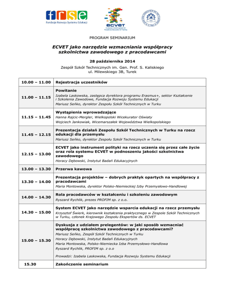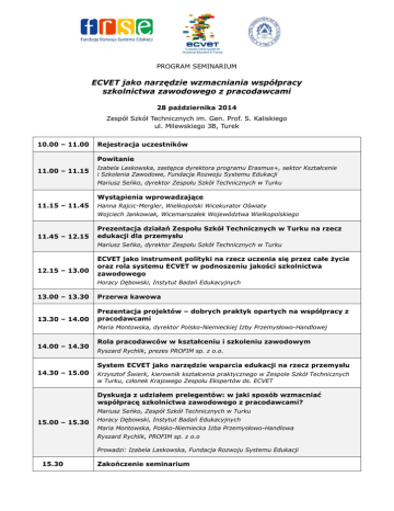 PROGRAM SEMINARIUM ECVET jako narzędzie wzmacniania współpracy szkolnictwa zawodowego z pracodawcami 28 października 2014 Zespół Szkół Technicznych im. Gen. Prof. S. Kaliskiego ul. Milewskiego 3B, Turek 10.00 – 11.00 Rejestracja uczestników Powitanie 11.00 – 11.15 Izabela Laskowska, zastępca dyrektora programu Erasmus+, sektor Kształcenie i Szkolenia Zawodowe, Fundacja Rozwoju Systemu Edukacji Mariusz Seńko, dyrektor Zespołu Szkół Technicznych w Turku Wystąpienia wprowadzające 11.15 – 11.45 Hanna Rajcic-Mergler, Wielkopolski Wicekurator Oświaty Wojciech Jankowiak, Wicemarszałek Województwa Wielkopolskiego 11.45 – 12.15 Prezentacja działań Zespołu Szkół Technicznych w Turku na rzecz edukacji dla przemysłu Mariusz Seńko, dyrektor Zespołu Szkół Technicznych w Turku 12.15 – 13.00 ECVET jako instrument polityki na rzecz uczenia się przez całe życie oraz rola systemu ECVET w podnoszeniu jakości szkolnictwa zawodowego Horacy Dębowski, Instytut Badań Edukacyjnych 13.00 – 13.30 Przerwa kawowa 13.30 – 14.00 Prezentacja projektów – dobrych praktyk opartych na współpracy z pracodawcami Maria Montowska, dyrektor Polsko-Niemieckiej Izby Przemysłowo-Handlowej 14.00 – 14.30 Rola pracodawców w kształceniu i szkoleniu zawodowym Ryszard Rychlik, prezes PROFIM sp. z o.o. System ECVET jako narzędzie wsparcia edukacji na rzecz przemysłu 14.30 – 15.00 Krzysztof Świerk, kierownik kształcenia praktycznego w Zespole Szkół Technicznych w Turku, członek Krajowego Zespołu Ekspertów ds. ECVET Dyskusja z udziałem prelegentów: w jaki sposób wzmacniać współpracę szkolnictwa zawodowego z pracodawcami? Mariusz Seńko, Zespół Szkół Technicznych w Turku 15.00 – 15.30 Horacy Dębowski, Instytut Badań Edukacyjnych Maria Montowska, Polsko-Niemiecka Izba Przemysłowo-Handlowa Ryszard Rychlik, PROFIM sp. z o.o Prowadzi: Izabela Laskowska, Fundacja Rozwoju Systemu Edukacji 15.30 Zakończenie seminarium