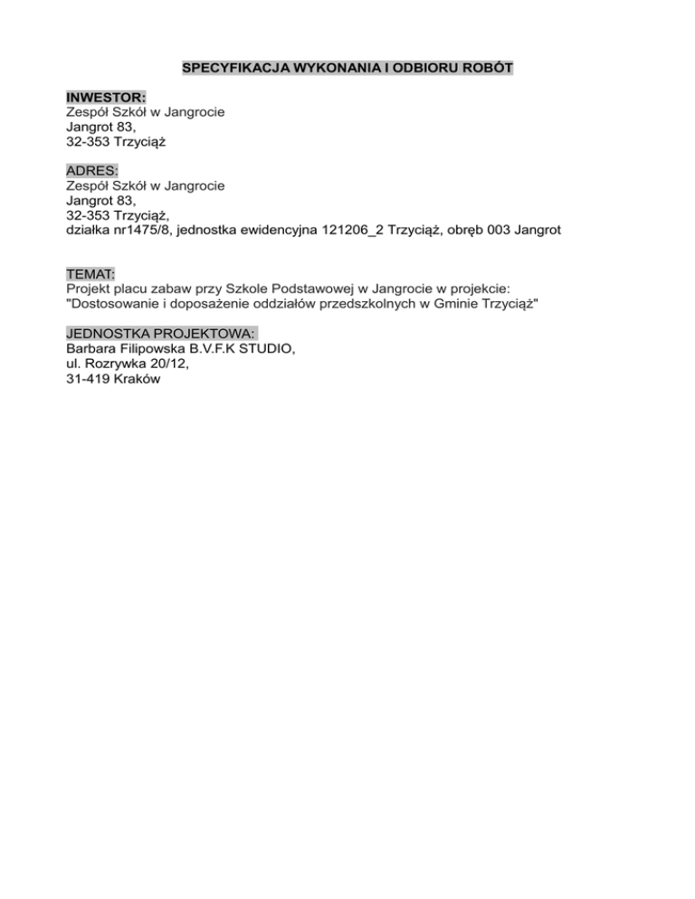 SPECYFIKACJA WYKONANIA I ODBIORU ROBÓT INWESTOR: Zespół Szkół w Jangrocie Jangrot 83, 32-353 Trzyciąż ADRES: Zespół Szkół w Jangrocie Jangrot 83, 32-353 Trzyciąż, działka nr1475/8, jednostka ewidencyjna 121206_2 Trzyciąż, obręb 003 Jangrot TEMAT: Projekt placu zabaw przy Szkole Podstawowej w Jangrocie w projekcie: "Dostosowanie i doposażenie oddziałów przedszkolnych w Gminie Trzyciąż" JEDNOSTKA PROJEKTOWA: Barbara Filipowska B.V.F.K STUDIO, ul. Rozrywka 20/12, 31-419 Kraków Spis zawartości opracowania 1.Określenie przedmiotu zamówienia 1.1.Przedmiot ST 1.2.Zakres stosowania ST 1.3.Zakres robot objętych ST 2.Prowadzenie robót 2.1. Ogólne zasady prowadzenia robót 3.Materiały i urządzenia 3.1. Wymagania ogólne 3.2. Charakterystyka nawierzchni placu zabaw 3.3. Charakterystyka urządzeń placu zabaw 4.Sprzęt 5.Transport 6.Wykonanie robót 6.1. Wymagania ogólne 6.2. Roboty ziemne 6.3. Fundamenty 6.4.Wykonanie nawierzchni z tworzyw sztucznych 6.5. Montaż urządzeń 7. Kontrola jakości robót 7.1. Zasady kontroli jakości robót 8. Obmiar robót 8.1.Ogólne zasady obmiaru robót 9.Odbiór robót 10. Podstawa płatności 11.Przepisy związane 11.1. Normy 1.Określenie przedmiotu zamówienia 1.1.Przedmiot specyfikacji technicznej Przedmiotem SST są wymagania wykonania i odbioru robót budowlanych związanych z realizacją robót związanych z wykonaniem nawierzchni bezpiecznych z tworzyw sztucznych (1m2) oraz dostawy i montażu urządzeń i elementów małej architektury ,w ramach przedsięwzięcia Projekt placu zabaw przy Szkole Podstawowej w Jangrocie w projekcie: "Dostosowanie i doposażenie oddziałów przedszkolnych w Gminie Trzyciąż" 1.2.Zakres stosowania ST Niniejsza szczegółowa specyfikacja techniczna stanowi dokument przetargowy i kontraktowy przy zlecaniu i realizacji robot wymienionych w pkt.1.1. Odstępstwa od wymagań podanych w niniejszej specyfikacji mogą mieć miejsce tylko w przypadkach małych prostych konstrukcji drugorzędnych o niewielkim znaczeniu ,dla których istnieje pewność ,że podstawowe wymagania będą spełnione przy zastosowaniu metod wykonania na podstawie doświadczenia i przy przestrzeganiu zasad sztuki budowlanej. 1.3.Zakres robót objętych specyfikacja techniczną Niniejsza szczegółowa specyfikacja techniczna obejmuje niżej wymienione roboty wg CPV - 45.00.00.00-7 Roboty budowlane - 45.01.00.00-8 Przygotowanie terenu pod budowę - 45.11.20.00-5 Roboty w zakresie usuwania gleby - 45.11.27.00-2 Roboty w zakresie kształtowania terenu - 45.11.27.20-8 Roboty w zakresie kształtowania terenów sportowych i rekreacyjnych - 45.11.27.23-9 Roboty w zakresie kształtowania placów zabaw Ustalenia zawarte w niniejszej specyfikacji dotyczą zasad prowadzenia robót obejmujących budowę placów zabaw : - przygotowanie terenu pod budowę nawierzchni bezpiecznej z tworzyw sztucznych - dostawę i wykonanie podbudowy kamiennej i piaskowej pod budowę nawierzchni z two rzyw sztucznych - dostawę i wykonanie nawierzchni bezpiecznej z tworzyw sztucznych o odpowiednich parametrach określonych w projekcie - dostawę urządzeń rekreacyjnych elementów małej architektury na plac zabaw wg. rodzaju i ilości podanej w projekcie i niniejszej specyfikacji technicznej - roboty ziemne w zakresie niwelacji terenu, wykonania wykopów pod fundamenty - wykonanie fundamentów pod urządzenia i elementy małej architektury - montaż urządzeń i elementów małej architektury wg lokalizacji podanej w projekcie pla cu zabaw 2.Prowadzenie robót 2.1. Ogólne zasady prowadzenia robót Wykonawca jest odpowiedzialny za prowadzenie robót zgodnie z umową ścisłe przestrzeganie harmonogramu robót oraz za jakość zastosowanych materiałów i wykonanych robót, za ich zgodność z projektem,wymaganiami specyfikacji technicznych oraz poleceniami Zamawiającego Wymagania dotyczące prowadzenia robót podano w: ST0 – część ogólna ,Kod CPV 45.00.00.00-7 3.Materiały i urządzenia 3.1.Wymagania ogólne 3.1.1. Źródła uzyskania materiałów i urządzeń Wykonawca jest zobowiązany do dostarczenia materiałów i urządzeń zgodnie z wymaga niami specyfikacji technicznych oraz stosowania materiałów i urządzeń produkcji krajowej lub zagranicznej spełniających wymagania jakościowe określone Polskimi normami, aprobatami technicznymi zagranicznych certyfikatami . Ogólne wymagania dotyczące pozyskiwania materiałów urządzeń ,podano w ST-0 część ogólna pkt.3.1.1.,Kod CPV 45000000-7 3.1.2.Materiały i urządzenia nieodpowiadające wymaganiom jakościowym Nie dopuszcza się instalowania urządzeń rekreacyjnych dla dzieci oraz nawierzchni niespełniających Polskich Norm w zakresie wyposażenia placów zabaw i nawierzchni. Materiały nieodpowiadające wymaganiom zostaną przez Wykonawcę wywiezione z terenu budowy, bądź złożone w miejscu wskazanym przez Zamawiającego. Niezbadane pędne niezaakceptowane materiały nieposiadające certyfikatów Wykonawca wykonuje na własne ryzyko ,licząc się z jego nieprzyjęciem i niezapłaceniem. 3.1.3.Przechowywanie i składowanie materiałów Wykonawca zapewni ,aby tymczasowo składowane materiały , do czasu ich wbudowania były zabezpieczone przed zniszczeniem , zachowywały swoją jakość i właściwości do robót i były dostępne do kontroli w obrębie terenu budowy w miejscach uzgodnionych z Za mawiającym lub po za terenem budowy w miejscach zorganizowanych przez Wykonawcę. Składowanie materiałów i gotowych elementów do montażu urządzeń oraz materiałów na nawierzchnię powinno być zgodne z zapisami aprobat technicznych oraz wytycznych producentów . 3.1.4.Wariantowe stosowanie materiałów Dopuszcza się zastosowanie urządzeń innego typu niż wskazane w projekcie ,jednak muszą one spełniać wszystkie wymagania określone w PN .Wykonawca powiadomi Zamawiającego o zamiarze wykorzystania innych materiałów lub urządzeń niż wskazane w projekcie, co najmniej trzy tygodnie p