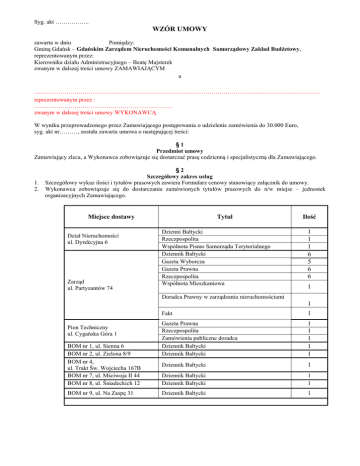 Syg. akt …………….. WZÓR UMOWY zawarta w dniu Pomiędzy: Gminą Gdańsk – Gdańskim Zarządem Nieruchomości Komunalnych Samorządowy Zakład Budżetowy, reprezentowanym przez: Kierownika działu Administracyjnego – Beatę Majsterek zwanym w dalszej treści umowy ZAMAWIAJĄCYM a ……………………………………………………………………………………………………………………………. reprezentowanym przez : …………………………………………………………… zwanym w dalszej treści umowy WYKONAWCĄ W wyniku przeprowadzonego przez Zamawiającego postępowania o udzielenie zamówienia do 30.000 Euro, syg. akt nr………, została zawarta umowa o następującej treści: §1 Przedmiot umowy Zamawiający zleca, a Wykonawca zobowiązuje się dostarczać prasę codzienną i specjalistyczną dla Zamawiającego. 1. 2. §2 Szczegółowy zakres usług Szczegółowy wykaz ilości i tytułów prasowych zawiera Formularz cenowy stanowiący załącznik do umowy. Wykonawca zobowiązuje się do dostarczania zamówionych tytułów prasowych do n/w miejsc – jednostek organizacyjnych Zamawiającego. Tytuł Miejsce dostawy Dział Nieruchomości ul. Dyrekcyjna 6 Zarząd ul. Partyzantów 74 Dzienni Bałtycki Rzeczpospolita Wspólnota Pismo Samorządu Terytorialnego Dziennik Bałtycki Gazeta Wyborcza Gazeta Prawna Rzeczpospolita Wspólnota Mieszkaniowa Ilość 1 1 1 6 5 6 6 1 Doradca Prawny w zarządzaniu nieruchomościami 1 Pion Techniczny ul. Cygańska Góra 1 BOM nr 1, ul. Sienna 6 BOM nr 2, ul. Zielona 8/9 BOM nr 4, ul. Trakt Św. Wojciecha 167B BOM nr 7, ul. Mściwoja II 44 BOM nr 8, ul. Śniadeckich 12 BOM nr 9, ul. Na Zaspę 31 Fakt 1 Gazeta Prawna Rzeczpospolita Zamówienia publiczne doradca Dziennik Bałtycki Dziennik Bałtycki 1 1 1 1 1 Dziennik Bałtycki 1 Dziennik Bałtycki Dziennik Bałtycki 1 1 Dziennik Bałtycki 1 3. 4. 5. 6. 7. 8. 2 Prasa codzienna będzie dostarczana w dniu wydania do godz. 7.30 każdego dnia roboczego, natomiast tytuły prasowe wydawane w dni wolne będą dostarczane w najbliższy dzień roboczy do godz. 7.30 Prasa specjalistyczna będzie dostarczana w terminie 7 dni od dnia publikacji. Wykonawca zobligowany jest do zamontowania w punktach dostaw prasy skrzynek na gazety lub gazetników. Dowodem zrealizowania dostawy będzie pisemne potwierdzenie na zamówieniu, dokonane przez upoważnionego pracownika Zamawiającego po sprawdzeniu ilości i kompletności tytułów prasowych. Do czasu odbioru prasy przez Zamawiającego ryzyko wszelkich niebezpieczeństw związanych z ewentualnym uszkodzeniem lub utratą prasy ponosi Wykonawca. Zamawiający zastrzega sobie prawo do częściowej realizacji zamówienia w przypadku zbycia, przekazania lub zmiany przeznaczenia obiektów, a Wykonawcy nie przysługują wobec Zamawiającego roszczenia odszkodowawcze z tytułu dostarczenia mniejszej ilości tytułów prasowych niż określono w § 2 ust. 1 umowy. §3 Obowiązki i prawa Zamawiającego Zamawiający zobowiązany jest do: a) przyjmowania od Wykonawcy wszelkich uwag i spostrzeżeń dotyczących przedmiotu niniejszej umowy, b) terminowej akceptacji dokumentów przedstawianych przez Wykonawcę, 2. Zamawiający ma prawo do: a) kontroli sposobu, częstotliwości i jakości wykonywanych dostaw. 1. §4 Obowiązki Wykonawcy 1. 2. 3. 4. 5. Wykonawca zobowiązuje się do: a) dostarczania prasy w okresie od dnia podpisania umowy, lecz nie wcześniej niż od 04.01.2016 r. do 31.12.2016 r. na własny koszt. b) wykonywania przedmiotu zamówienia z należytą starannością, zgodnie z przepisami prawa. Wykonawca ponosi odpowiedzialność za szkody wynikłe podczas realizacji umowy na zasadach ogólnych. Wykonawca obowiązany jest do naprawienia szkody w przypadkach niewypełnienia lub niewłaściwego wypełnienia obowiązków, wynikających z niniejszej umowy. Wykonawca, w czasie realizacji umowy, nie może zlecić wykonania całości lub części określonych w umowie dostaw osobie trzeciej (podwykonawcy) bez zgody Zamawiającego wyrażonej na piśmie. Wykonawca zamówienie wykona sam. §5 Termin realizacji umowy Umowa zostaje zawarta na okres od dnia podpisania umowy, lecz nie wcześniej niż od 04.01.2016 r. – 31.12.2016 r. 1. 2. §6 Wynagrodzenie Ceny jednostkowe są określone w formularzu cenowym, stanowiącym załącznik nr 1do umowy. Wartość umowy wynikającą z oferty wykonawcy ustala się na: wartość netto …………………zł (słownie:………………………………………………….) VAT …………… zł (słownie……………………………………………………………….) wartość brutto …………….. zł (słownie: …………………………………………………..) zgodnie z Formularzem cenowym 3. 4. 5. 6. 7. 1. 2. 3. 4. Kwota, jaką Zamawiający zapłaci Wykonawcy z tytułu wynagrodzenia za realizację usługi będącej przedmiotem niniejszej umowy nie może przekroczyć wartości brutto umowy określonej w ust. 2 niniejszego paragrafu. Z chwilą, gdy wynikające z sumy faktur kwartalnych wynagrodzenie Wykonawcy osiągnie wartość umowną, to umowa ulega rozwiązaniu przed upływem terminu określonego w § 5. Ceny jednostkowe wymienione w ust. 1 nie podlegają podwyższeniu w okresie realizacji umowy. Cena jednostkowa powinna zawierać wszystkie koszty niezbędne do wykonania przedmiotu umowy, w szczególności koszty dostawy do miejsc wskazanych przez Zamawiającego. Zamawiający dopuszcza możliwość zmiany stawki podatku VAT od towarów i usług, jeżeli nastąpi zmiana obowiązujących przepisów prawnych, w przypadkach określonych w art. 144 ust 1 ustawy Prawo zamówień publicznych. §7 Rozliczenia i płatności Rozliczenie dostaw będzie następowało w cyklach kwartalnych na podstawie przedłożonych przez Wykonawcę faktur. Fakturę za prace Wykonawca wystawi i dostarczy Zamawiającemu 30 dni przed upływem danego kwartału, którego faktura dotyczy. Wynagr