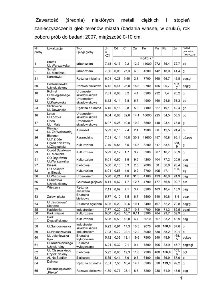 Zawartość (średnia) niektórych metali cięŜkich i stopień zanieczyszczenia gleb terenów miasta (badania własne, w druku), rok poboru prób do badań: 2007, miąŜszość 0-10 cm. Nr próby 1 2 21 50 10 12 23 16 17 24 26 33 29 51 27 52 36 66 39 53 54 55 56 57 Lokalizacja Statoil Ul. Warszawska Schell Ul. Manifestu Karczówka Podkarczowka UŜytek zielony Rolmet Ul.Ściegiennego Orlen Ul.Krakowska Ślichowice Ul. Dewońska, Lotos Ul.Łódzka Orlen Ul.1 Maja Białogon Ul. Za Walcownią Białogon Ul.7 Źródel Ogród działkowy Ul.Zagnańska Ogród Działkowy Ul. Morcinka OD Dąbrówka Ul.Warszawska Biesak OD Kolejarz ul Biesak Ul.Wrzosowa Leśniówka UŜytek zielony Wietrznia Zalew, plaŜa Ul Jesionowa/ Klonowa Kadzielnia, Park miejski Park Dygasińskiego 58 Ul.Sandomierska 59 Ul.Piekoszowska Ul. Jeleniowska łąka Ul.Kruszelnickiego UŜytek rolny Ul. Olszewskiego UŜytek zielony Al. Na Stadion Dalnica 60 61 62 63 64 65 Elektrociepłownia „Kielce” Typ i p-typ gleby Cd urbanoziem 7,18 0,17 9,2 12,2 11000 272 36,4 72,7 ps urbanoziem 7,56 0,08 27,3 6,0 4300 142 18,0 41,4 gl Rędzina inicjalna 6,01 0,28 9,50 2,8 7700 368 66,7 42,8 psg:gl Rdzawa bielicowa 6,12 0,44 25,0 15,8 9700 455 90,7 103, psg:gl 7 7,81 0,08 8,2 4,4 8200 232 7,4 20,2 gl 8,12 0,14 6,8 6,7 4900 160 24,6 51,3 ps 6,15 0,16 9,8 5,3 7100 327 19,1 42,4 gp 8,04 0,08 32,6 14,1 16600 225 34,5 58,5 pg 6,97 0,28 10,0 10,2 8500 140 23,4 73,8 gl Arenosol 5,99 0,15 2,4 2,4 1900 86 12,5 24,4 pl Pararędzina 7,51 0,14 16,8 30,3 18600 457 40,8 95,1 gś:psg Kulturoziem 7,49 0,56 8,5 16,3 8200 317 33,4 338, gl 0 Kulturoziem 5,99 0,17 4,7 3,7 3900 307 16,7 35,9 gl Kulturoziem 6,01 0,60 8,9 9,5 4200 404 77,2 20,9 psg Bielicowa 5,86 0,16 3,3 2,5 2000 50 36,8 Kulturoziem 6,01 0,58 4,9 9,2 3700 105 47,1 Urbanoziem 5,90 0,21 4,6 31,3 4100 433 46,0 28,4 psg 105, pg 1 24,9 psg Gruntowo-glejowa 8,11 0,62 4,7 12,7 4700 477 56,8 92,7 płz 7,11 0,02 7,1 3,7 6200 163 10,4 15,9 psg 5,77 0,10 3,5 6,7 5500 340 10,8 8,4 Brunatna oglejona 6,05 0,20 30,6 10,1 3400 407 52,2 79,8 psg:gl Industroziem Kulturoziem 7,77 6,00 0,20 0,43 23,7 16,7 10,8 6,11 4700 3900 809 704 71,3 29,7 89,5 pg:gl 59,9 gl Kulturoziem 5,98 0,53 13,8 6,7 6010 607 33,2 43,9 psg 6,23 0,91 17,3 10,3 9070 700 100,8 87,6 pl 7,03 0,72 22,1 12,2 8900 680 88,2 5,12 0,36 13,1 19,6 7900 240 45,9 90,1 pl 168, pgl:ps 5 6,21 0,32 2,1 9,1 7800 705 33,9 Bielicowa 5,92 0,66 12,3 11,8 7900 400 166,8 Bielicowa 5,35 0,41 7,6 9,8 6400 450 Rędzina brunatna 7,51 7,55 10,4 14,7 8900 630 179,3 99,2 gl Rdzawa bielicowa 4,59 0,77 28,1 8,5 7200 288 45,5 psg Urbanoziem składowiskowa Urbanoziem składowiskowa Rędzina brunatna Urbanoziem składowiskowa Urbanoziem składowiskowa Rędzina mieszana Brunatna bielicowa Industroziem składowiskowa Industroziem Brunatna wyługowana Brunatna wyługowana Cr Cu Fe Mn Pb Skład granulometryczny pH w KCl Zn mg/kg s.m 36,9 51,9 ps:pl 45,7 psg:pgl 105, pgl 6 87,6 pl 1 2