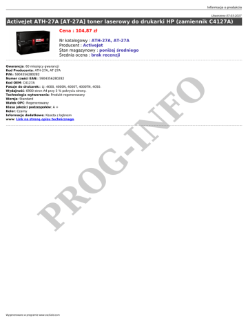 Informacje o produkcie Utworzono 07-03-2017 ActiveJet ATH-27A [AT-27A] toner laserowy do drukarki HP (zamiennik C4127A) Cena : 104,87 zł PR O G -I N Gwarancja: 60 miesięcy gwarancji Kod Producenta: ATH-27A, AT-27A P/N:: 5904356280282 Numer części EAN:: 5904356280282 Kod OEM: C4127A Pasuje do drukarek:: LJ: 4000, 4000N, 4000T, 4000TN, 4050. Wydajność: 6900 stron A4 przy 5 % pokryciu strony. Technologia wytworzenia: Produkt regenerowany Wersja: Standard Wałek OPC: Regenerowany Klasa jakości podzespołów: A + Kolor: Czarny Informacje dodatkowe: Kaseta z bębnem www: Link na stronę opisu technicznego FO Nr katalogowy : ATH-27A, AT-27A Producent : ActiveJet Stan magazynowy : poniżej średniego Średnia ocena : brak recenzji Wygenerowano w programie www.oscGold.com