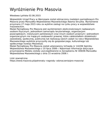 Wyróżnienie Pro Masovia Wiesława Lpińska 02.06.2015 Wojewódzki Urząd Pracy w Warszawie został odznaczony medalem pamiątkowym Pro Masovia przez Marszałka Województwa Mazowieckiego Adama Struzika. Wyróżnienie przyznano 27 maja 2015 roku za wybitne zasługi na rynku pracy w województwie mazowieckim. Medal Pamiątkowy Pro Masovia jest wyróżnieniem okolicznościowym nadawanym: osobom fizycznym, jednostkom samorządu terytorialnego, organizacjom pozarządowym, instytucjom państwowym oraz innym osobom prawnym i jednostkom organizacyjnym nie mającym osobowości prawnej, które całokształtem działalności zawodowej, społecznej, publicznej lub realizacją swoich zadań na rzecz Województwa Mazowieckiego wybitnie przyczyniły się do gospodarczego, kulturalnego lub społecznego rozwoju Mazowsza. Medal Pamiątkowy Pro Masovia został ustanowiony Uchwałą nr 142/06 Sejmiku Województwa Mazowieckiego z 10 lipca 2006 r. Natomiast informacje dotyczące przyznawania Medalu zostały uszczegółowione w Zarządzeniu Nr 409/06 Marszałka Województwa Mazowieckiego z dnia 15 września 2006 r. Linki zewnętrzne: https://www.mazovia.pl/patronaty--nagrody--odznaczenia/pro-masovia/