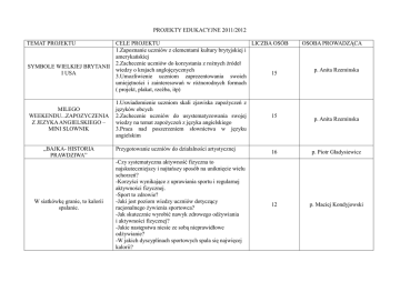 PROJEKTY EDUKACYJNE 2011/2012 TEMAT PROJEKTU SYMBOLE WIELKIEJ BRYTANII I USA MILEGO WEEKENDU...ZAPOZYCZENIA Z JEZYKA ANGIELSKIEGO – MINI SLOWNIK „BAJKA- HISTORIA PRAWDZIWA” W siatkówkę granie, to kalorii spalanie. CELE PROJEKTU LICZBA OSÓB 1.Zapoznanie uczniów z elementami kultury brytyjskiej i amerykańskiej 2.Zachecenie uczniów do korzystania z rożnych źródeł wiedzy o krajach anglojęzycznych 15 3.Umozliwienie uczniom zaprezentowania swoich umiejętności i zainteresowań w różnorodnych formach ( projekt, plakat, rzeźba, itp) 1.Uswiadomienie uczniom skali zjawiska zapożyczeń z języków obcych 2.Zachecenie uczniów do usystematyzowania swojej wiedzy na temat zapożyczeń z języka angielskiego 3.Praca nad poszerzeniem słownictwa w języku angielskim Przygotowanie uczniów do działalności artystycznej -Czy systematyczna aktywność fizyczna to najskuteczniejszy i najtańszy sposób na uniknięcie wielu schorzeń? -Korzyści wynikające z uprawiania sportu i regularnej aktywności fizycznej. -Sport to zdrowie? -Jaki jest poziom wiedzy uczniów dotyczący racjonalnego żywienia sportowca? -Jak skutecznie wyrobić nawyk zdrowego odżywiania i aktywności fizycznej? -Jakie następstwa niesie ze sobą nieprawidłowe odżywianie? -W jakich dyscyplinach sportowych spala się najwięcej kalorii? 15 OSOBA PROWADZĄCA p. Anita Rzeminska p. Anita Rzeminska 16 p. Piotr Gładysiewicz 12 p. Maciej Kondyjowski "Biometryczne metody weryfikacji tożsamości - chwyt reklamowy czy godna ochrona przed nieautoryzowanym dostępem?" -Jak zorganizować zawody sportowe? -Zainteresowania sportowe współczesnej młodzieży. opracowanie witryny internetowej lub prezentacji multimedialnej dotyczących Biometrycznych metod weryfikacji tożsamości • • • Projekt edukacyjny „Młodzi przeciw korupcji” • • Projekt edukacyjny „Grzegorz z Sanoka-kim był, czym zasłynął? • wyjaśnienie, czym jest korupcja oraz jakie są jej przyczyny, mechanizm działania i skutki, przedstawienie funkcjonowania państwa prawa i urzędów publicznych, poznanie zasad etycznych i wartości, które powinny obowiązywać w państwie demokratycznym,rozwijanie postawy uczciwości. doskonalenie umiejętności korzystania z różnych źródeł informacji, gromadzenia, selekcjonowania i przetwarzania zdobytych informacji w celu przygotowania dowolnej formy prezentacji np.: albumu ilustrowanego zdjęciami, plakatu, prezentacji multimedialnej, broszury. poznanie sylwetki patrona szkoły, jego biografii (tj. okres dzieciństwa, okoliczności opuszczenia domu rodzinnego, drogi do wiedzy, pobyt zagranicąWłochy, Węgry; - Grzegorz jako duchowny, wychowawca, przyjaciel domu jagiellońskiego, wygląd zewnętrzny, charakter, zwyczaje, poglądy filozoficzne, twórczość, rolę Dunajowa jako ośrodka życia towarzyskiego, artystycznego i naukowego) doskonalenie umiejętności korzystania z różnych źródeł informacji, gromadzenia, selekcjonowania i przetwarzania zdobytych informacji w celu przygotowania dowolnej formy prezentacji np.: albumu ilustrowanego zdjęciami, plakatu, 3 p. PatrykNisiewicz 15 p. Irena Gocko 15 p. Irena Gocko timedialnej, broszury. Wielka Brytania – miejsca, które warto zobaczyć. poszerzenie wiedzy na temat zabytków Wielkiej Brytanii - rozwijanie kompetencji interkulturowej - rozwijanie umiejętności językowych - rozwijanie umiejętności pracy w zespole - kształcenie umiejętności korzystania z różnych źródeł informacji - doskonalenie umiejętności wyszukiwania i selekcjonowania informacji Wpływ języka angielskiego na język polski. - analiza współczesnej polszczyzny pod względem słów zapożyczonych z języka angielskiego - rozwijanie umiejętności językowych - rozwijanie umiejętności pracy w zespole - kształcenie umiejętności korzystania z różnych źródeł informacji - doskonalenie umiejętności wyszukiwania i selekcjonowania informacji „TRZYMAJ FORMĘ” „ Co daje nam niepalenie? kształtowanie prozdrowotnych nawyków wśród młodzieży szkolnej promocja aktywności ruchowej; zróżnicowany i zbilansowany sposób odżywiania się młodzieży dostarczenie wiedzy i umiejętności korzystania z informacji zamieszczonych na opakowaniach produktów spożywczych Rozpowszechnienie wiedzy na temat szkodliwego wpływu palenia czynnego i biernego na zdrowie dzieci , młodzieży i dorosłych. Przyczyny sięgania po papierosa. 12 p. Joanna Marć 12 p. Joanna Marć 6 p. Joanna Warchoł p. Magda Ćwikła p. Lucyna Wojtowicz p. Magda Ćwikła Berlin - eine touristische Attraktion (Berlin - atrakcja turystyczna) Wkład Polski w kulturę światową – zabytki UNESCO w Polsce. „Nasza szkoła w liczbach gromadzenie danych statystycznych, ich opracowywanie i prezentacja” "Życie masz jedno" Uczenie prawidłowego oddychania. • Rozwijanie wiedzy o historii i kulturze miasta • Rozwijanie umiejętności wyszukiwania, selekcjonowania i analizy informacji z różnych źródeł z zastosowaniem technologii informacyjnokomunikacyjnych • Rozwijanie umiejętności pisania w j. niemieckim • Kształtowanie postaw: współodpowiedzialności, solidarności, kreatywności, ciekawości poznawczej, gotowości do pracy w grupie • Kształtowanie postawy poszanowania dla innych kultur i tradycji zapoznanie z historią powstania UNESCO - zrozumienie zasad i celów działania organizacji - zapoznanie z programami realizowanymi przez UNESCO: Lista Światowego Dziedzictwa, Lista Programu „Pamięć Świata”, Lista Dziedzictwa Zagrożonego - prezentacja zabytków UNESCO w Polsce czyli miejsc i obiektów objętych szczególna ochroną ze względu na ich unikatową wartość dla ludzkości - uświadomienie wpływu kultury polskiej na kulturę światową - zebranie danych statystycznych, uporządkowanie zebranych danych, graficzna prezentacja danych, wykonanie prezentacji w programie Power point. * efektywne kształtowanie postaw moralnych uczniów oparte o najważniejsze warto