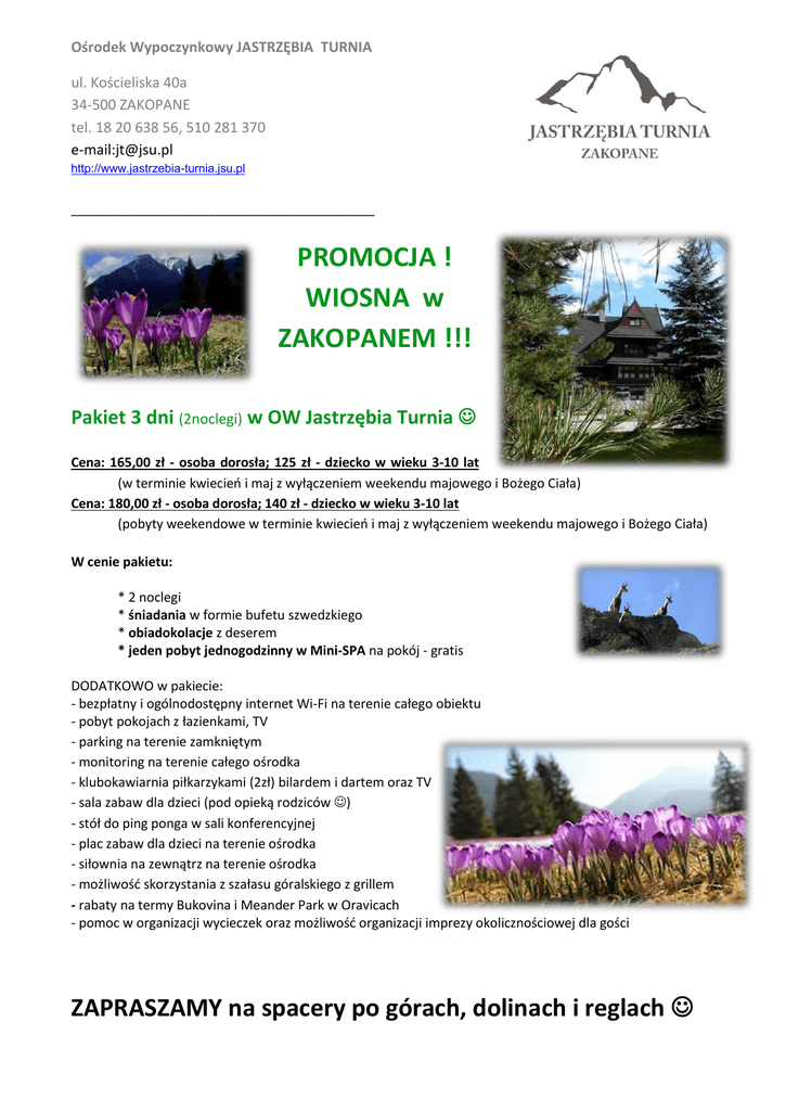 Ośrodek Wypoczynkowy JASTRZĘBIA TURNIA ul. Kościeliska 40a 34-500 ZAKOPANE tel. 18 20 638 56, 510 281 370 e-mail:[email protected] http://www.jastrzebia-turnia.jsu.pl __________________________________________ PROMOCJA ! WIOSNA w ZAKOPANEM !!! Pakiet 3 dni (2noclegi) w OW Jastrzębia Turnia Cena: 165,00 zł - osoba dorosła; 125 zł - dziecko w wieku 3-10 lat (w terminie kwiecień i maj z wyłączeniem weekendu majowego i Bożego Ciała) Cena: 180,00 zł - osoba dorosła; 140 zł - dziecko w wieku 3-10 lat (pobyty weekendowe w terminie kwiecień i maj z wyłączeniem weekendu majowego i Bożego Ciała) W cenie pakietu: * 2 noclegi * śniadania w formie bufetu szwedzkiego * obiadokolacje z deserem * jeden pobyt jednogodzinny w Mini-SPA na pokój - gratis DODATKOWO w pakiecie: - bezpłatny i ogólnodostępny internet Wi-Fi na terenie całego obiektu - pobyt pokojach z łazienkami, TV - parking na terenie zamkniętym - monitoring na terenie całego ośrodka - klubokawiarnia piłkarzykami (2zł) bilardem i dartem oraz TV - sala zabaw dla dzieci (pod opieką rodziców ) - stół do ping ponga w sali konferencyjnej - plac zabaw dla dzieci na terenie ośrodka - siłownia na zewnątrz na terenie ośrodka - możliwość skorzystania z szałasu góralskiego z grillem - rabaty na termy Bukovina i Meander Park w Oravicach - pomoc w organizacji wycieczek oraz możliwość organizacji imprezy okolicznościowej dla gości ZAPRASZAMY na spacery po górach, dolinach i reglach