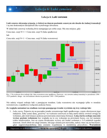 Lekcja 6: Luki cenowe Lekcja 6: Luki cenowe Luki cenowe obrazują sytuację, w której na danym poziomie cenowym nie doszło do Ŝadnej transakcji i są one doskonałym narzędziem dla wytrawnego inwestora. W skład luki cenowej wchodzą dwie następujące po sobie sesje. Ma ona miejsce, gdy: Cena max. sesji N+1 < Cena min. sesji N (luka spadkowa) lub Cena min. sesji N+1 > Cena max. sesji N (luka wzrostowa) Rys. 1 Na wykresie dwa rodzaje luk: luka wzrostowa oraz spadkowa. Pierwsza - nie zawarto Ŝadnej transakcji w przedziale 1506 – 1523 punktów; druga - nie stwierdzono obrotu na poziomie 1565- 1548 punktów. Nie naleŜy wiązać rodzaju luki z panującym trendem. Luka wzrostowa nie występuje tylko w trendzie wzrostowym, a spadkowa wyłącznie podczas bessy. Ze względu natomiast na stadium rozwoju panującego trendu wyróŜnia się trzy rodzaje luk: 1. Luka startu. Pojawia się na początku trendu wzrostowego bądź spadkowego, często obwieszcza jego nadejście. śeby uznać daną „przerwę” na wykresie cenowym za lukę startu naleŜy zwrócić uwagę na wolumen, jaki miał miejsce podczas powstawania omawianej formacji. Lukę startu cechuje znacznie wyŜszy poziom wolumenu bez względu na to czy wskazuje na powstanie hossy, czy teŜ nastanie rynku niedźwiedzia. Jest on często dwukrotnie wyŜszy niŜ średni wolumen z 3-4 ostatnich tygodni notowań. JeŜeli obrót nie uległ zmianie, lub jego zmiana jest niewielka, naleŜy mieć się na baczności, gdyŜ najprawdopodobniej luka zostanie wypełniona w niedalekiej przyszłości. Warunkiem Zapraszamy do dyskusji na forum www.invest24.pl Lekcja 6: Luki cenowe Lekcja 6: Luki cenowe koniecznym uznania danej luki za lukę startu jest przyszłe zachowanie się ceny. OtóŜ kierunek następujących po luce ruchów cenowych powinien być zgodny z kierunkiem luki, a 1. Luka startu. Pojawia się na poca ceny powinny formować kolejne szczyty bądź dołki w zaleŜności od trendu. 2. Luka kontynuacji. W przeciwieństwie do jednej luki startu, na wykresie cenowym w danym trendzie moŜe występować kilka luk kontynuacji. W odniesieniu do wcześniej omawianej formacji cenowej wolumen powinien zachowywać się w identyczny sposób, z tą jednak róŜnicą, Ŝe wzrost wolumenu wynosi około 50% średniej wartości wolumenu z 3-4 ostatnich tygodni. Identycznie jak w przypadku luki startu, warunkiem koniecznym wystąpienia opisywanej luki jest przyszły ruch cen. 3. Luka wyczerpania. Występuje na koniec trendu wzrostowego bądź spadkowego głosząc wszystkim inwestorom rychłe jego zakończenie. Warunki wystąpienia luki wyczerpania są podobne jak we wcześniejszych przypadkach. Tzn. musi nastąpić wzrost wolumenu, a po pojawieniu się tej luki kolejne sesje nie mogą ustalać nowych szczytów cenowych, gdyŜ w takiej sytuacji będziemy mieć do czynienia z kolejną luką kontynuacji. Rys.2 Wykres przedstawia trend spadkowy i występujące na niej róŜnego rodzaju luki cenowe. Podczas trendu moŜe występować kilku luk kontynuacji i tylko jedna startu oraz wyczerpania. W kaŜdym z przypadków widać potwierdzenie płynące z wartości wolumenu. Na podstawie luk cenowych moŜna znacznie zwiększyć stopę zwrotu z naszej giełdowej inwestycji. Systemy oparte na lukach są jednymi z najbardziej intuicyjnych, jakie kiedykolwiek zostały stworzone. PoniŜej kilka podstawowych zasad zawierania transakcji w oparciu o luki cenowe. 1. Gdy rozpoznasz lukę startu zajmij pozycję zgodnie z jej kierunkiem. Pamiętając o warunkach, jakie luka startu musi spełniać wyeliminujesz fałszywe sygnały. Zajmij pozycję długą, gdy formacja cenowa zapowiada hossę, a krótką, gdy zwiastuje bessę. Zabezpiecz teŜ swoją pozycję ustawiając zlecenie stop na poziomie najniŜszym luki. JeŜeli jest to rzeczywiście luka startu to nie powinna zostać Zapraszamy do dyskusji na forum www.invest24.pl Lekcja 6: Luki cenowe Lekcja 6: Luki cenowe 1. wypełniona. 2. Gdy rozpoznasz lukę kontynuacji postępuj zgodnie z punktem 1. Luka startu, a luka kontynuacji nie róŜnią się pod względem sposobu zajmowania pozycji przez inwestorów. 3. Szukaj luk wyczerpania na wykresie, jednak nie przypisuj kaŜdej luce właściwości formacji, która przewiduje zmianę trendu. W przypadku trwania hossy zajmij krótką pozycję po cenie znajdującej się w okolicach luki. Zamknij pozycję, gdy cena wzrośnie powyŜej najwyŜszego poziomu cenowego luki. Analogiczna sytuacje występuje podczas trwania bessy. Występuje jeszcze czwarty rodzaj luk - luki zwykłe, nazywane takŜe fałszywymi lukami. Luki zwykłe występują najczęściej podczas trwania formacji horyzontalnej. Jak odróŜnić luki zwykłe od luk omówionych wcześniej? Co do zasady nie są one potwierdzane przez wolumen. Ponadto zostają wypełnione do 10 sesji po pojawieniu się. Taktyka gry w oparciu o nie wygląda zupełnie inaczej. NaleŜy określić czy luka jest wzrostowa, czy spadkowa, a następnie zająć POZYCJĘ PRZECIWNĄ do jej kierunku (krótka pozycja przy luce wzrostowej, długa przy spadkowej). UWAGA: Program FIBOTRADER ma funkcje wyszukiwania wszystkich moŜliwych luk na danym wykresie. Warto ją wypróbować. Postępuj następująco: 1. Wybieramy ikonę „Add indicator” (obok lupy pomniejszającej wykres). 2. Wybieramy funkcję Gap Marker. 3. Naciskamy przycisk OK i na naszym wykresie powinniśmy mieć zakreślone kołami wszystkie moŜliwe luki cenowe, które wystąpiły na danym walorze. Grzegorz Wach <mgreg>, Dawid Augustyn <ogest> Opracowane na podstawie: John J. Murphy „Analiza techniczna rynków finansowych”, Alexander Elder „Zawód inwestor giełdowy” Zalecana lektura : Alexander Elder „Zawód inwestor giełdowy” Rdz. 21 Zapraszamy do dyskusji na forum www.invest24.pl Lekcja 6: Luki cenowe