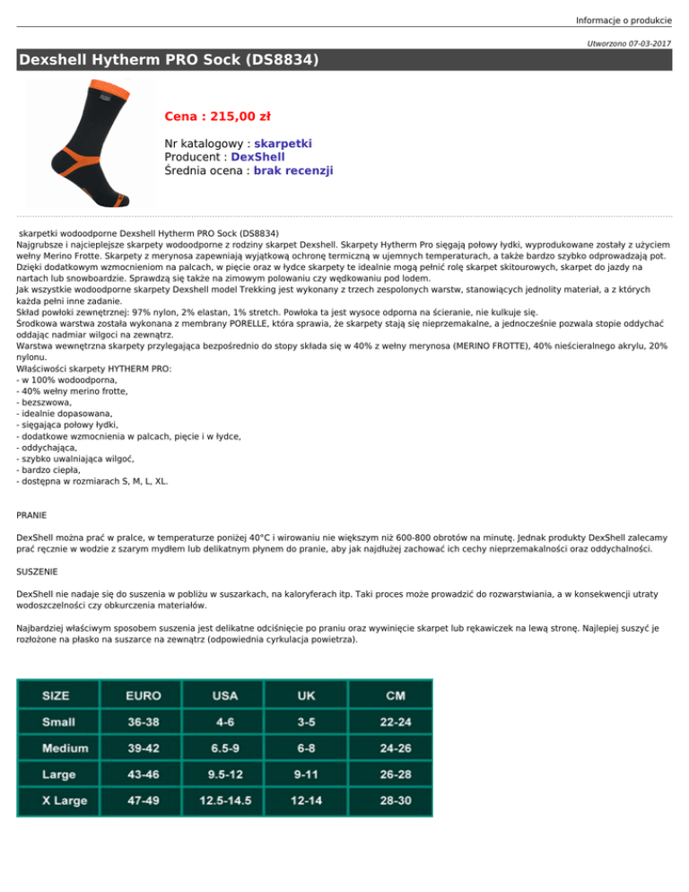 Informacje o produkcie Utworzono 07-03-2017 Dexshell Hytherm PRO Sock (DS8834) Cena : 215,00 zł Nr katalogowy : skarpetki Producent : DexShell Średnia ocena : brak recenzji skarpetki wodoodporne Dexshell Hytherm PRO Sock (DS8834) Najgrubsze i najcieplejsze skarpety wodoodporne z rodziny skarpet Dexshell. Skarpety Hytherm Pro sięgają połowy łydki, wyprodukowane zostały z użyciem wełny Merino Frotte. Skarpety z merynosa zapewniają wyjątkową ochronę termiczną w ujemnych temperaturach, a także bardzo szybko odprowadzają pot. Dzięki dodatkowym wzmocnieniom na palcach, w pięcie oraz w łydce skarpety te idealnie mogą pełnić rolę skarpet skitourowych, skarpet do jazdy na nartach lub snowboardzie. Sprawdzą się także na zimowym polowaniu czy wędkowaniu pod lodem. Jak wszystkie wodoodporne skarpety Dexshell model Trekking jest wykonany z trzech zespolonych warstw, stanowiących jednolity materiał, a z których każda pełni inne zadanie. Skład powłoki zewnętrznej: 97% nylon, 2% elastan, 1% stretch. Powłoka ta jest wysoce odporna na ścieranie, nie kulkuje się. Środkowa warstwa została wykonana z membrany PORELLE, która sprawia, że skarpety stają się nieprzemakalne, a jednocześnie pozwala stopie oddychać oddając nadmiar wilgoci na zewnątrz. Warstwa wewnętrzna skarpety przylegająca bezpośrednio do stopy składa się w 40% z wełny merynosa (MERINO FROTTE), 40% nieścieralnego akrylu, 20% nylonu. Właściwości skarpety HYTHERM PRO: - w 100% wodoodporna, - 40% wełny merino frotte, - bezszwowa, - idealnie dopasowana, - sięgająca połowy łydki, - dodatkowe wzmocnienia w palcach, pięcie i w łydce, - oddychająca, - szybko uwalniająca wilgoć, - bardzo ciepła, - dostępna w rozmiarach S, M, L, XL. PRANIE DexShell można prać w pralce, w temperaturze poniżej 40°C i wirowaniu nie większym niż 600-800 obrotów na minutę. Jednak produkty DexShell zalecamy prać ręcznie w wodzie z szarym mydłem lub delikatnym płynem do pranie, aby jak najdłużej zachować ich cechy nieprzemakalności oraz oddychalności. SUSZENIE DexShell nie nadaje się do suszenia w pobliżu w suszarkach, na kaloryferach itp. Taki proces może prowadzić do rozwarstwiania, a w konsekwencji utraty wodoszczelności czy obkurczenia materiałów. Najbardziej właściwym sposobem suszenia jest delikatne odciśnięcie po praniu oraz wywinięcie skarpet lub rękawiczek na lewą stronę. Najlepiej suszyć je rozłożone na płasko na suszarce na zewnątrz (odpowiednia cyrkulacja powietrza). Dostępne opcje Dexshell Hytherm PRO Sock (DS8834) Rozmiar: Wybierz rozmiar, S, M, L, XL.