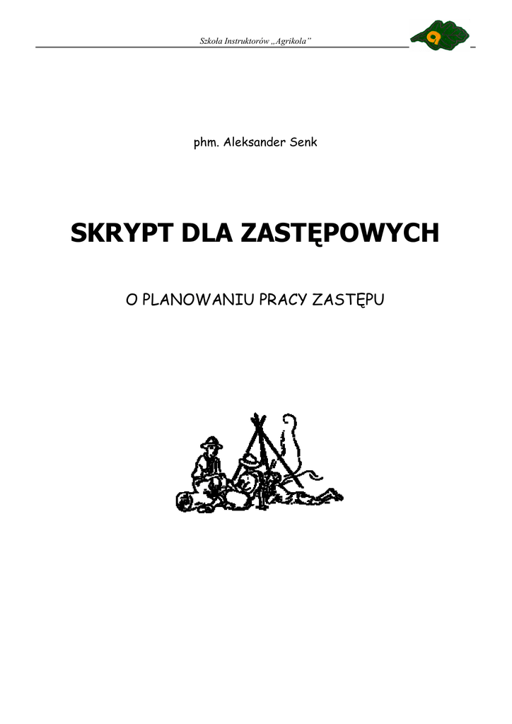 Szkoła Instruktorów „Agrikola” phm. Aleksander Senk SKRYPT DLA ZASTĘPOWYCH O PLANOWANIU PRACY ZASTĘPU Szkoła Instruktorów „Agrikola” Druhno zastępowa! Druhu zastępowy! Przygotowaliśmy ten skrypt, aby pomóc Ci w dobrym przygotowaniu się do pracy z zastępem w ciągu roku harcerskiego. Ponieważ najważniejszą, a zarazem najtrudniejszą, częścią tych przygotowań jest napisanie programu, skrypt ten dotyczy głównie planowania pracy. Twój plan pracy jest pewnego rodzaju strategią, która – jeżeli będzie dobrze przygotowana – odpłaci Ci z nawiązką zainwestowaną w nią energię. Nawiązką tą będzie większa ilość czasu, mniej stresów przed nadchodzącą zbiórką, a przede wszystkim – dużo dobrej zabawy i dobrze funkcjonujący zastęp harcerski. Jak zatem stworzyć plan pracy? Obrazuje to poniższy rysunek: Mój zastęp teraz Sposoby, by to osiągnąć Mój zastęp za rok Pierwszy krąg przedstawia charakterystykę zastępu. Opisz w niej to, co jest teraz: Jak wygląda zastęp i jego członkowie w dniu dzisiejszym. Jest to bardzo ważny element – bez niego możesz mieć duże problemy z harcerzami przy tworzeniu i prowadzeniu zbiórek. Dlaczego? Na pewno byłeś kiedyś na zbiórce, której temat Cię nie interesował? Albo na której robiłeś to, czego robić nie znosisz? Pamiętasz uczucie, które Ci wtedy towarzyszyło? A co byś powiedział, gdyby wszystkie zbiórki były takie? Aby tego uniknąć musisz przygotować charakterystykę zastępu i jego członków. Charakterystyka zastępu składa się z dwóch części: Jego mundur – kojarzy się z jego harcerskim 1. W pierwszej z nich opisujesz każdego harcerza wyrobieniem. Jaki jest wiek tego harcerza, jego indywidualnie. staż w harcerstwie, stopień, który posiada, Jak to zrobić ? Spójrz na każdego z nich z osobna... co funkcja, którą pełni? widzisz? Głowa – a w niej oczy, uszy, usta: Do jakiej chodzi szkoły? Czy radzi sobie w niej? Czy jest pomysłowy? Czy lubi poznawać nowe rzeczy? Serce – kojarzy się z emocjami, uczuciami: Czym się interesuje, a czego nie lubi? Dlaczego chce być w Twoim zastępie? Co daje mu bycie w nim? Ręce – kojarzą się z przyjacielskim uściskiem dłoni, pracą, pomocą: Jaki jest jego stosunek do innych? Czy jest koleżeński? Otwarty? Zamknięty w sobie? Czy jest akceptowany i lubiany przez innych członków zastępu? Sylwetka – Kojarzy się nam ze stanem zdrowia i życiową energią: Czy dba o sprawność fizyczną, czy też całe dnie siedzi przed komputerem? Jaki jest jego ulubiony sport? Czy chętnie bierze udział w zajęciach sportowych? Przyjrzyj się każdemu swojemu harcerzowi i spróbuj odpowiedzieć na te pytania. Odpowiedzi zapisz. 2 Szkoła Instruktorów „Agrikola” 2. W drugiej części charakterystyki muszą się znaleźć informacje: a) o organizacji pracy zastępu, czyli o: - liczebności zastępu i tego, jak się ona zmieniała w ciągu ostatniego roku, - częstotliwości i regularności zbiórek zastępu w poprzednim roku, - funkcyjnych zastępu, - umundurowaniu harcerzy, - dokumentacji (kronice, notatniku zastępowego, stronie internetowej...) - sprzęcie zastępu i o tym, jak jest zdobywany, przechowywany, konserwowany. Duch zastępu Jak wprowadzić w zastępie dobrą atmosferę? Przede wszystkim poprzez dobry przykład pogody ducha ze strony zastępowego i innych starszych członków zastępu. Starajcie się działać tak, aby ludzie słysząc nazwę waszego zastępu, wyobrażali sobie grupę ludzi niepodobną do żadnej innej. Możecie to osiągnąć poprzez przygotowywanie ciekawych zbiórek (w każdej powinno być coś super, choć jeden element, który naprawdę odróżniałby ją od zwykłych, koleżeńskich spotkań). Poza tym pomoże wam w tym posiadanie Prawa Zastępu, proporca, apteczki oraz innych przydatnych materiałów, a także prowadzenie kroniki, stosowanie znaczków zastępu (na mundurach i sprzęcie), posiadanie własnego szyfru, piosenki obrzędowej, okrzyku, przysięgi składanej za zaangażowanie w pracę zastępu i innych obrzędów (np. obrzędowe rozpoczęcie i zakończenie zbiórek, przyjęcie zuchów), obchodzenie rocznic i urodzin członków zastępu, służba prowadzona przez zastęp, posiadane trofea. Bardzo ważne jest, by każdy harcerz w zastępie pełnił jakąś przydatną funkcję i czuł się za coś odpowiedzialny. Możecie mianować podzastępowego, kronikarza, skarbnika, proporcowego, apteczkowego, grajka itp. itd. Na podstawie skryptu pwd. Rafała Łączyńskiego Ładnie Ducha dwóch zastępów opisała hm. Jolanta Kreczmańska w książeczce „W kręgu zastępu”. Zastęp „A” Na zbiórkę przyszły punktualnie. Na polecenie zastępowej usiadły w kręgu. Zastępowa zaczęła gawędę. Opowiadała o rycerstwie. Gdy skończyła się zbiórka dziewczęta powiedziały sobie lakoniczne „cześć” i rozeszły się do domów. Wiedziały, że za tydzień znowu będzie zbiórka, którą poprowadzi zastępowa. Nikt za to nie wiedział, że Kasi jest smutno, nikt nie zauważył w jej oczach łez. No cóż. Każdy ma własne kłopoty. Zastęp „B” Jest godzina zbiórki zastępu „Sowy”. Harcerki w milczeniu siadają w kręgu, kładą rękę na piersi i powtarzają słowa powitania [...]. Jeden, dla obcych niezauważalny, gest i dziewczęta wstają. Rozpoczyna się gra. Zabawa wciąga wszystkie z wyjątkiem Ewy. Ewa jest smutna. Gdy gra się kończy harcerki bez słowa siadają w kręgu – to wspólny krąg rady. Podejmują się kolejnych zadań związanych z następnym numerem gazetki zastępu. Każda jest za coś odpowiedzialna. Śpiewają swoją ulubioną piosenkę o sowach. Przygotowują obrzęd przyjęcia do zastępu nowej harcerki. W końcu zastępowa zwraca się do Ewy, czy nie chciałaby czegoś powiedzieć. Ewa waha się, ale przedstawia swój problem. Cały zastęp radzi jak Ewa ma wyjść z opresji. Na koniec wszystkie wyciągają ręce do środka i powtarzaj