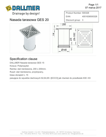 Page 1/1 07 marca 2017 Product Number: 500328 EAN: Nasada tarasowa GES 20 4001636500328 Discount group: 3 Specification clause DALLMER Nasada tarasowa GES 15 Korpus: Polipropylen Ramka: stal nierdzewna, 200 x 200mm. Ruszt: stal nierdzewna, przykręcany, klasa obciążeń L 15 pasująca do wpustów dachowych 62,64,65 i [ECCO] jak również do przedłużek 630 i 63 Dallmer GmbH + Co KG Wiebelsheidestra� 25 59757 Arnsberg / Germany Tel.: +49 2932 9616-0 Fax: +49 2932 9616-222 www.dallmer.de [email protected]
