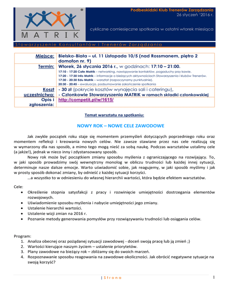 Podbeskidzki Klub Trenerów Zarządzania 26 styczeń ‘2016 r. cykliczne comiesięczne spotkania w ostatni wtorek miesiąca zawsz Stowarzyszenie Konsultantów i Trenerów Zarządzania Miejsce: Bielsko-Biała – ul. 11 Listopada 10/5 (nad Rossmanem, piętro 2 domofon nr. 9) Termin: Wtorek, 26 stycznia 2016 r., w godzinach: 17:10 – 21:00. 17:10 - 17:20 Cafe Matrik – networking, nawiązywanie kontaktów, pogaduchy przy kawie. 17:20 - 17:30 Info Matrik – informacje o bieżących aktywnościach Stowarzyszenia i klubów Trenerów. 17:30 - 20:30 Edu Matrik – warsztat (rozpoczynamy punktualnie). 20:30 - 20:45 – ewaluacja, podsumowanie zakończenie spotkania Koszt - 30 zł (pokrycie kosztów wynajęcia sali i cateringu), uczestnictwa: - Członkowie Stowarzyszenia MATRIK w ramach składki członkowskiej Opis i http://competit.pl/w/1615/ zgłoszenia: Temat warsztatu na spotkaniu: NOWY ROK – NOWE CELE ZAWODOWE Jak zwykle początek roku staje się momentem przemyśleń dotyczących poprzedniego roku oraz momentem refleksji i kreowania nowych celów. Nie zawsze stawiane przez nas cele realizują się w wymarzony dla nas sposób, a mimo tego mogą nieść za sobą naukę. Podczas warsztatów ustalimy cele (a jakże!), jednak w nieco inny i zdystansowany sposób. Nowy rok może być początkiem zmiany sposobu myślenia z ograniczającego na rozwijający. To, w jaki sposób prowadzimy swój wewnętrzny monolog w obliczu trudności lub każdej innej sytuacji, determinuje nasze dalsze emocje. Warto uświadomić sobie, jak reagujemy, w jaki sposób myślimy i jak w prosty sposób dokonać zmiany, by odnieść z każdej sytuacji korzyści. …a wszystko to w odniesieniu do własnej hierarchii wartości, która będzie efektem warsztatów. Cele: Określenie stopnia satysfakcji z pracy i rozwinięcie umiejętności dostrzegania elementów rozwojowych. Uświadomienie sposobu myślenia i nabycie umiejętności jego zmiany. Ustalenie hierarchii wartości. Ustalenie wizji zmian na 2016 r. Poznanie metody generowania pomysłów przy rozwiązywaniu trudności lub osiągania celów. Program: 1. Analiza obecnej oraz pożądanej sytuacji zawodowej - doceń swoją pracę lub ją zmień ;) 2. Wartości kierujące naszym życiem – ustalenie priorytetów. 3. Plany zawodowe na bieżący rok – zbliżamy się do swoich marzeń. 4. Rozpoznawanie sposobu reagowania na zawodowe okoliczności. Jak obrócić negatywne sytuacje na swoją korzyść? |Strona 1 Osoba Prowadząca: Anna Rduch Z wykształcenia i zamiłowania: doradca zawodowy i coach. Specjalizuje się w pracy z osobami poszukującymi pracy oraz osobami młodymi, wchodzącymi na rynek pracy. Członek Bielskiego Stowarzyszenia Doradców Zawodowych i Personalnych „AKTYWNI”, w ramach którego realizuje projekty z zakresu ekonomii społecznej, przedsiębiorczości. Publikuje swoje artykuły w miesięczniku dla doradców zawodowych „DOZA”. Prowadzi stronę internetową nomio.eu poświęconą poradnictwu zawodowemu, coachingowi i rozwojowi osobistemu. Autorka gry szkoleniowej „Rozmówki rekrutacyjne”, współautorka gry „Rozegraj swoją karierę”. Uwaga: nowa forma zapisów i płatności! Zgłoś się: http://competit.pl/zgloszenie/1615/ i opłać online Spotkanie przewidziane jest na maksymalnie 20 osób. Decyduje kolejność zgłoszeń! Prosimy o potwierdzenie udziału w spotkaniu do 24 stycznia 2016 Zapraszamy serdecznie Jolanta Kućka-Fabia Koordynator Podbeskidzkiego Klubu Trenerów Zarządzania MATRIK Pomyśl, kto jeszcze może być zainteresowany udziałem w tym spotkaniu. Prześlij tym osobom to zaproszenie ;) Zapraszamy do śledzenia naszej strony na FB Idea spotkań regionalnych klubów: www.matrik.pl/nowy/o-ideii-klubow Kontakt z Biurem Stowarzyszenia: http://www.matrik.pl/kontakt |Strona 2