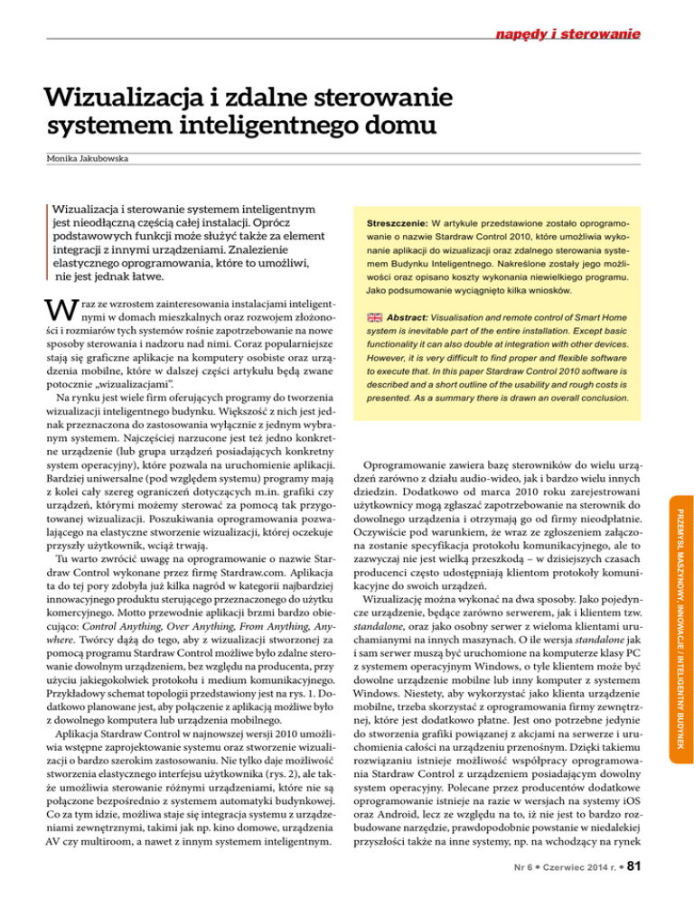Wizualizacja i zdalne sterowanie systemem inteligentnego domu Monika Jakubowska Wizualizacja i sterowanie systemem inteligentnym jest nieodłączną częścią całej instalacji. Oprócz podstawowych funkcji może służyć także za element integracji z innymi urządzeniami. Znalezienie elastycznego oprogramowania, które to umożliwi, nie jest jednak łatwe. W wanie o nazwie Stardraw Control 2010, które umożliwia wykonanie aplikacji do wizualizacji oraz zdalnego sterowania systemem Budynku Inteligentnego. Nakreślone zostały jego możliwości oraz opisano koszty wykonania niewielkiego programu. Jako podsumowanie wyciągnięto kilka wniosków. Abstract: Visualisation and remote control of Smart Home system is inevitable part of the entire installation. Except basic functionality it can also double at integration with other devices. However, it is very difficult to find proper and flexible software to execute that. In this paper Stardraw Control 2010 software is described and a short outline of the usability and rough costs is presented. As a summary there is drawn an overall conclusion. Oprogramowanie zawiera bazę sterowników do wielu urządzeń zarówno z działu audio-wideo, jak i bardzo wielu innych dziedzin. Dodatkowo od marca 2010 roku zarejestrowani użytkownicy mogą zgłaszać zapotrzebowanie na sterownik do dowolnego urządzenia i otrzymają go od firmy nieodpłatnie. Oczywiście pod warunkiem, że wraz ze zgłoszeniem załączona zostanie specyfikacja protokołu komunikacyjnego, ale to zazwyczaj nie jest wielką przeszkodą – w dzisiejszych czasach producenci często udostępniają klientom protokoły komunikacyjne do swoich urządzeń. Wizualizację można wykonać na dwa sposoby. Jako pojedyncze urządzenie, będące zarówno serwerem, jak i klientem tzw. standalone, oraz jako osobny serwer z wieloma klientami uruchamianymi na innych maszynach. O ile wersja standalone jak i sam serwer muszą być uruchomione na komputerze klasy PC z systemem operacyjnym Windows, o tyle klientem może być dowolne urządzenie mobilne lub inny komputer z systemem Windows. Niestety, aby wykorzystać jako klienta urządzenie mobilne, trzeba skorzystać z oprogramowania firmy zewnętrznej, które jest dodatkowo płatne. Jest ono potrzebne jedynie do stworzenia grafiki powiązanej z akcjami na serwerze i uruchomienia całości na urządzeniu przenośnym. Dzięki takiemu rozwiązaniu istnieje możliwość współpracy oprogramowania Stardraw Control z urządzeniem posiadającym dowolny system operacyjny. Polecane przez producentów dodatkowe oprogramowanie istnieje na razie w wersjach na systemy iOS oraz Android, lecz ze względu na to, iż nie jest to bardzo rozbudowane narzędzie, prawdopodobnie powstanie w niedalekiej przyszłości także na inne systemy, np. na wchodzący na rynek Nr 6 l Czerwiec 2014 r. l 81 Przemysł maszynowy, innowacje / Inteligentny budynek raz ze wzrostem zainteresowania instalacjami inteligentnymi w domach mieszkalnych oraz rozwojem złożoności i rozmiarów tych systemów rośnie zapotrzebowanie na nowe sposoby sterowania i nadzoru nad nimi. Coraz popularniejsze stają się graficzne aplikacje na komputery osobiste oraz urządzenia mobilne, które w dalszej części artykułu będą zwane potocznie „wizualizacjami”. Na rynku jest wiele firm oferujących programy do tworzenia wizualizacji inteligentnego budynku. Większość z nich jest jednak przeznaczona do zastosowania wyłącznie z jednym wybranym systemem. Najczęściej narzucone jest też jedno konkretne urządzenie (lub grupa urządzeń posiadających konkretny system operacyjny), które pozwala na uruchomienie aplikacji. Bardziej uniwersalne (pod względem systemu) programy mają z kolei cały szereg ograniczeń dotyczących m.in. grafiki czy urządzeń, którymi możemy sterować za pomocą tak przygotowanej wizualizacji. Poszukiwania oprogramowania pozwalającego na elastyczne stworzenie wizualizacji, której oczekuje przyszły użytkownik, wciąż trwają. Tu warto zwrócić uwagę na oprogramowanie o nazwie Stardraw Control wykonane przez firmę Stardraw.com. Aplikacja ta do tej pory zdobyła już kilka nagród w kategorii najbardziej innowacyjnego produktu sterującego przeznaczonego do użytku komercyjnego. Motto przewodnie aplikacji brzmi bardzo obiecująco: Control Anything, Over Anything, From Anything, Anywhere. Twórcy dążą do tego, aby z wizualizacji stworzonej za pomocą programu Stardraw Control możliwe było zdalne sterowanie dowolnym urządzeniem, bez względu na producenta, przy użyciu jakiegokolwiek protokołu i medium komunikacyjnego. Przykładowy schemat topologii przedstawiony jest na rys. 1. Dodatkowo planowane jest, aby połączenie z aplikacją możliwe było z dowolnego komputera lub urządzenia mobilnego. Aplikacja Stardraw Control w najnowszej wersji 2010 umożliwia wstępne zaprojektowanie systemu oraz stworzenie wizualizacji o bardzo szerokim zastosowaniu. Nie tylko daje możliwość stworzenia elastycznego interfejsu użytkownika (rys. 2), ale także umożliwia sterowanie różnymi urządzeniami, które nie są połączone bezpośrednio z systemem automatyki budynkowej. Co za tym idzie, możliwa staje się integracja systemu z urządzeniami zewnętrznymi, takimi jak np. kino domowe, urządzenia AV czy multiroom, a nawet z innym systemem inteligentnym. Streszczenie: W artykule przedstawione zostało oprogramo- Przemysł maszynowy, innowacje / Inteligentny budynek Rys. 1. Schemat topologii wizualizacji stworzonej w oparciu o oprogramowanie Stardraw Control 2010 [2] Windows Phone 8. Istnieje również szansa, że powstaną darmowe odpowiedniki tego oprogramowania. Przykładowy interfejs uruchomiony na urządzeniach z systemem iOS zaprezentowany został na rys. 3. Tak jak wspomniano wyżej, wizualizację można wykorzystać do integracji różnych, niezwiązanych ze sobą systemów. Wielu Czytelników pewnie za- 82 l Nr 6 l Czerwiec 2014 r. stanawia się terazm, po co wy