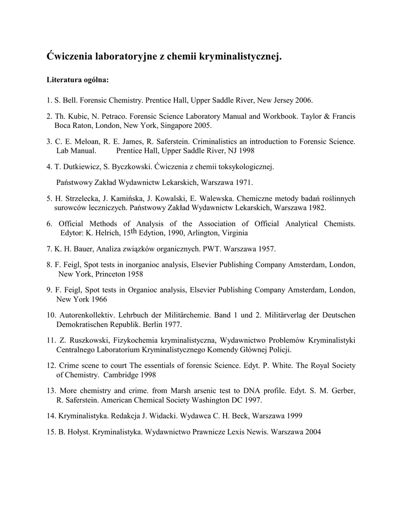 Ćwiczenia laboratoryjne z chemii kryminalistycznej. Literatura ogólna: 1. S. Bell. Forensic Chemistry. Prentice Hall, Upper Saddle River, New Jersey 2006. 2. Th. Kubic, N. Petraco. Forensic Science Laboratory Manual and Workbook. Taylor & Francis Boca Raton, London, New York, Singapore 2005. 3. C. E. Meloan, R. E. James, R. Saferstein. Criminalistics an introduction to Forensic Science. Lab Manual. Prentice Hall, Upper Saddle River, NJ 1998 4. T. Dutkiewicz, S. Byczkowski. Ćwiczenia z chemii toksykologicznej. Państwowy Zakład Wydawnictw Lekarskich, Warszawa 1971. 5. H. Strzelecka, J. Kamińska, J. Kowalski, E. Walewska. Chemiczne metody badań roślinnych surowców leczniczych. Państwowy Zakład Wydawnictw Lekarskich, Warszawa 1982. 6. Official Methods of Analysis of the Association of Official Analytical Chemists. Edytor: K. Helrich, 15th Edytion, 1990, Arlington, Virginia 7. K. H. Bauer, Analiza związków organicznych. PWT. Warszawa 1957. 8. F. Feigl, Spot tests in inorganioc analysis, Elsevier Publishing Company Amsterdam, London, New York, Princeton 1958 9. F. Feigl, Spot tests in Organioc analysis, Elsevier Publishing Company Amsterdam, London, New York 1966 10. Autorenkollektiv. Lehrbuch der Militärchemie. Band 1 und 2. Militärverlag der Deutschen Demokratischen Republik. Berlin 1977. 11. Z. Ruszkowski, Fizykochemia kryminalistyczna, Wydawnictwo Problemów Kryminalistyki Centralnego Laboratorium Kryminalistycznego Komendy Głównej Policji. 12. Crime scene to court The essentials of forensic Science. Edyt. P. White. The Royal Society of Chemistry. Cambridge 1998 13. More chemistry and crime. from Marsh arsenic test to DNA profile. Edyt. S. M. Gerber, R. Saferstein. American Chemical Society Washington DC 1997. 14. Kryminalistyka. Redakcja J. Widacki. Wydawca C. H. Beck, Warszawa 1999 15. B. Hołyst. Kryminalistyka. Wydawnictwo Prawnicze Lexis Newis. Warszawa 2004
