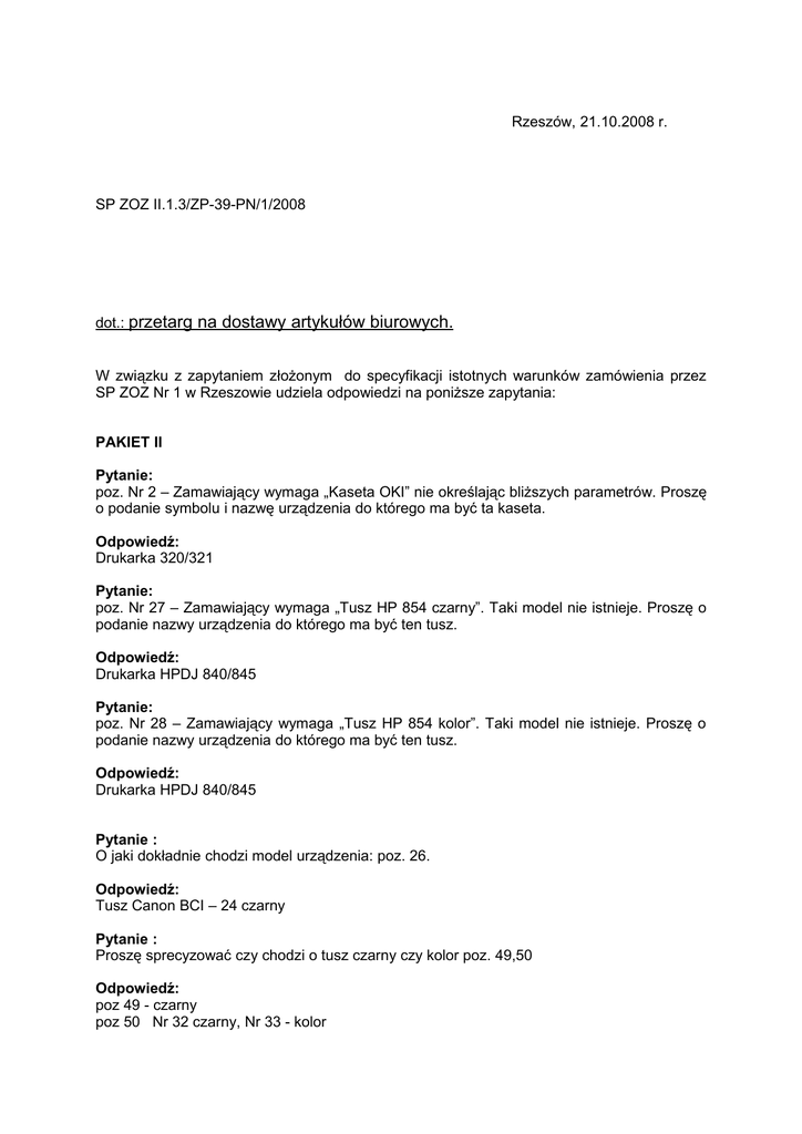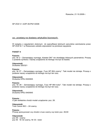 Rzeszów, 21.10.2008 r. SP ZOZ II.1.3/ZP-39-PN/1/2008 dot.: przetarg na dostawy artykułów biurowych. W związku z zapytaniem złożonym do specyfikacji istotnych warunków zamówienia przez SP ZOZ Nr 1 w Rzeszowie udziela odpowiedzi na poniższe zapytania: PAKIET II Pytanie: poz. Nr 2 – Zamawiający wymaga „Kaseta OKI” nie określając bliższych parametrów. Proszę o podanie symbolu i nazwę urządzenia do którego ma być ta kaseta. Odpowiedź: Drukarka 320/321 Pytanie: poz. Nr 27 – Zamawiający wymaga „Tusz HP 854 czarny”. Taki model nie istnieje. Proszę o podanie nazwy urządzenia do którego ma być ten tusz. Odpowiedź: Drukarka HPDJ 840/845 Pytanie: poz. Nr 28 – Zamawiający wymaga „Tusz HP 854 kolor”. Taki model nie istnieje. Proszę o podanie nazwy urządzenia do którego ma być ten tusz. Odpowiedź: Drukarka HPDJ 840/845 Pytanie : O jaki dokładnie chodzi model urządzenia: poz. 26. Odpowiedź: Tusz Canon BCI – 24 czarny Pytanie : Proszę sprecyzować czy chodzi o tusz czarny czy kolor poz. 49,50 Odpowiedź: poz 49 - czarny poz 50 Nr 32 czarny, Nr 33 - kolor Pytanie: Proszę o podanie właściwego symbolu urządzenia poz. 27,28,54. Odpowiedź: poz 27, poz. 28 – jak wyżej poz. 54 – nieaktualna. Zamawiający wykreśla tę pozycję ( nr 54 )z pakietu II Pytanie: poz. 2 – kaseta OKI – 50 szt – jaki model? poz. 4 – DT – H4092 H – 12 szt – jaki typ urządzenia poz. 22 – tusz HP 920 C -12 szt – czarny czy kolor poz. 23 – tusz HP 690 C – 5 szt – czarny czy kolor poz. 49 – tusz do HP 400 – 8 szt – czarny czy kolor Odpowiedź: poz. 2 – odpowiedź jak wyżej poz. 4 – Toner typ HPLJ 4092A, drukarka HPLJ 1100 poz. 22,23,49 – tusz czarny Pytanie: Proszę o wyjaśnienie treści następujących pozycji z formularza cenowego 26 – Tusz Canon BCI – szt 20 27 – Tusz HP 854 czarny – szt 10 28 – Tusz HP 854 kolor – szt 10 54 – Tusz HPC 8729a tri-color – szt 12 W w.w. pozycjach proszę o uściślenie oraz sprawdzenie typu drukarki, nr tuszu/tonera Odpowiedź: poz 26 – jak wyżej poz 27 – jak wyżej poz 28 – jak wyżej poz. 54 – jak wyżej