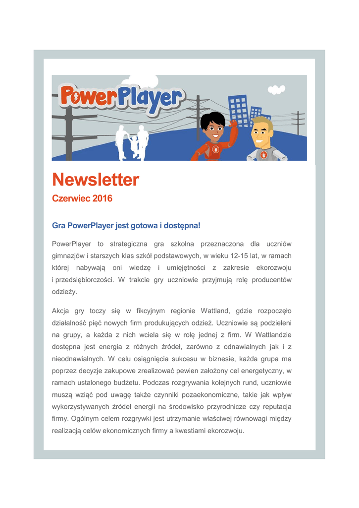 Newsletter Czerwiec 2016 Gra PowerPlayer jest gotowa i dostępna! PowerPlayer to strategiczna gra szkolna przeznaczona dla uczniów gimnazjów i starszych klas szkół podstawowych, w wieku 12-15 lat, w ramach której nabywają oni wiedzę i umięjętności z zakresie ekorozwoju i przedsiębiorczości. W trakcie gry uczniowie przyjmują rolę producentów odzieży. Akcja gry toczy się w fikcyjnym regionie Wattland, gdzie rozpoczęło działalność pięć nowych firm produkujących odzież. Uczniowie są podzieleni na grupy, a każda z nich wciela się w rolę jednej z firm. W Wattlandzie dostępna jest energia z różnych źródeł, zarówno z odnawialnych jak i z nieodnawialnych. W celu osiągnięcia sukcesu w biznesie, każda grupa ma poprzez decyzje zakupowe zrealizować pewien założony cel energetyczny, w ramach ustalonego budżetu. Podczas rozgrywania kolejnych rund, uczniowie muszą wziąć pod uwagę także czynniki pozaekonomiczne, takie jak wpływ wykorzystywanych źródeł energii na środowisko przyrodnicze czy reputacja firmy. Ogólnym celem rozgrywki jest utrzymanie właściwej równowagi między realizacją celów ekonomicznych firmy a kwestiami ekorozwoju. Gra PowerPlayer jest już teraz dostępna online za darmo na stronie: www.powerplayer.info . Znajduje się tam zestaw materiałów do gry i pakiet wspierający dla nauczyciela do pobrania przez każdą zainteresowaną osobę. Pakiet wspierający dla nauczyciela Materiały do gry - Przewodnik dla nauczycieli - Plansza gry - Słowniczek - - Slajdy wprowadzające do gry Informacje działalności firm - Karty eko-akcji - Zbiorcze zestawienie wyników - Karty rundy - Arkusz końcowy wyników - Arkusze wyników - Materiały do uczenia się poprzez działania na rzecz społeczności lokalnej (service learning) o Kim jest zespół projektujący grę PowerPlayer? Zespół projektujący grę PowerPlayer został powołany w ramach realizacji europejskiego projektu SUSEN (ang. Sustainable Entrepreneurship - A Game-Based Exploration for Lower Secondary Schools; Zrównoważona przedsiębiorczość - odkrywanie idei z wykorzystaniem gry dla szkół gimnazjalnych). Zespół projektowy składa się z konsorcjum sześciu partnerów: Uniwersytet Koblenz-Landau (Niemcy) University College London (Wielka Brytania) CVO Antwerpen & Scholengroep 1 Antwerpen (Belgia) Uniwersytet Pedagogiczny we Freiburgu (Niemcy) Associazione seed (Szwajcaria) Uniwersytet Pedagogiczny im. Komisji Edukacji Narodowej w Krakowie Chcesz wiedzieć więcej? www.powerplayer.info www.twitter.com/PowerPlayergame www.facebook.com/PowerPlayergame lub zasubskrybuj [email protected] ten newsletter przez wysłanie maila na adres: