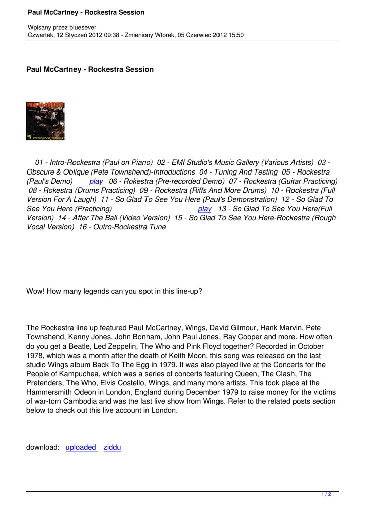 Paul McCartney - Rockestra Session Wpisany przez bluesever Czwartek, 12 Styczeń 2012 09:38 - Zmieniony Wtorek, 05 Czerwiec 2012 15:50 Paul McCartney - Rockestra Session 01 - Intro-Rockestra (Paul on Piano) 02 - EMI Studio's Music Gallery (Various Artists) 03 Obscure & Oblique (Pete Townshend)-Introductions 04 - Tuning And Testing 05 - Rockestra (Paul's Demo) play 06 - Rokestra (Pre-recorded Demo) 07 - Rockestra (Guitar Practicing) 08 - Rokestra (Drums Practicing) 09 - Rockestra (Riffs And More Drums) 10 - Rockestra (Full Version For A Laugh) 11 - So Glad To See You Here (Paul's Demonstration) 12 - So Glad To See You Here (Practicing) play 13 - So Glad To See You Here(Full Version) 14 - After The Ball (Video Version) 15 - So Glad To See You Here-Rockestra (Rough Vocal Version) 16 - Outro-Rockestra Tune Wow! How many legends can you spot in this line-up? The Rockestra line up featured Paul McCartney, Wings, David Gilmour, Hank Marvin, Pete Townshend, Kenny Jones, John Bonham, John Paul Jones, Ray Cooper and more. How often do you get a Beatle, Led Zeppelin, The Who and Pink Floyd together? Recorded in October 1978, which was a month after the death of Keith Moon, this song was released on the last studio Wings album Back To The Egg in 1979. It was also played live at the Concerts for the People of Kampuchea, which was a series of concerts featuring Queen, The Clash, The Pretenders, The Who, Elvis Costello, Wings, and many more artists. This took place at the Hammersmith Odeon in London, England during December 1979 to raise money for the victims of war-torn Cambodia and was the last live show from Wings. Refer to the related posts section below to check out this live account in London. download: uploaded ziddu 1/2 Paul McCartney - Rockestra Session Wpisany przez bluesever Czwartek, 12 Styczeń 2012 09:38 - Zmieniony Wtorek, 05 Czerwiec 2012 15:50 back 2/2